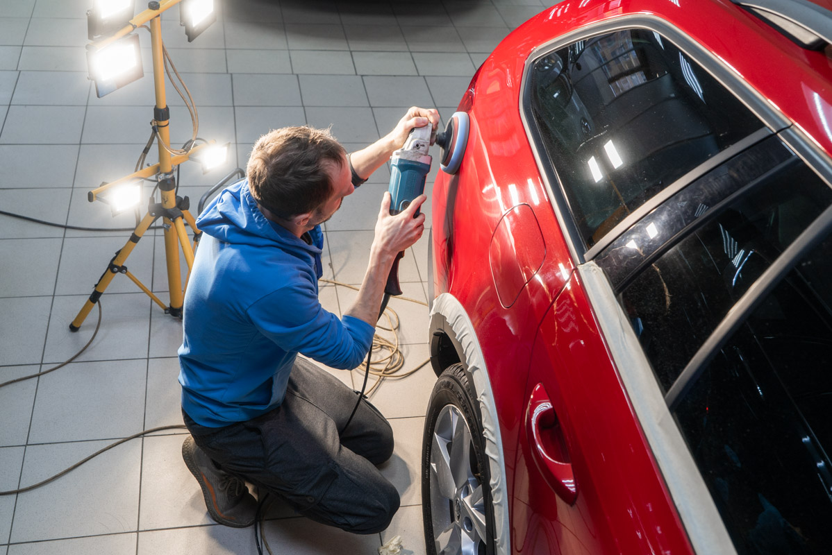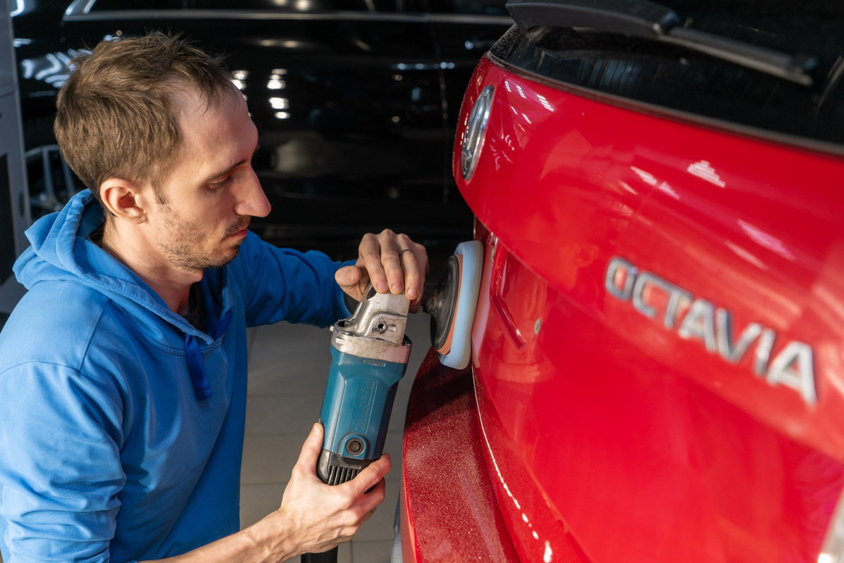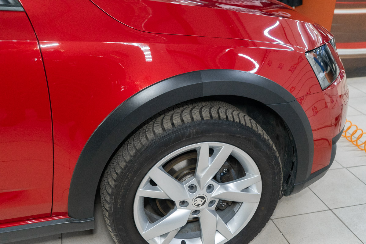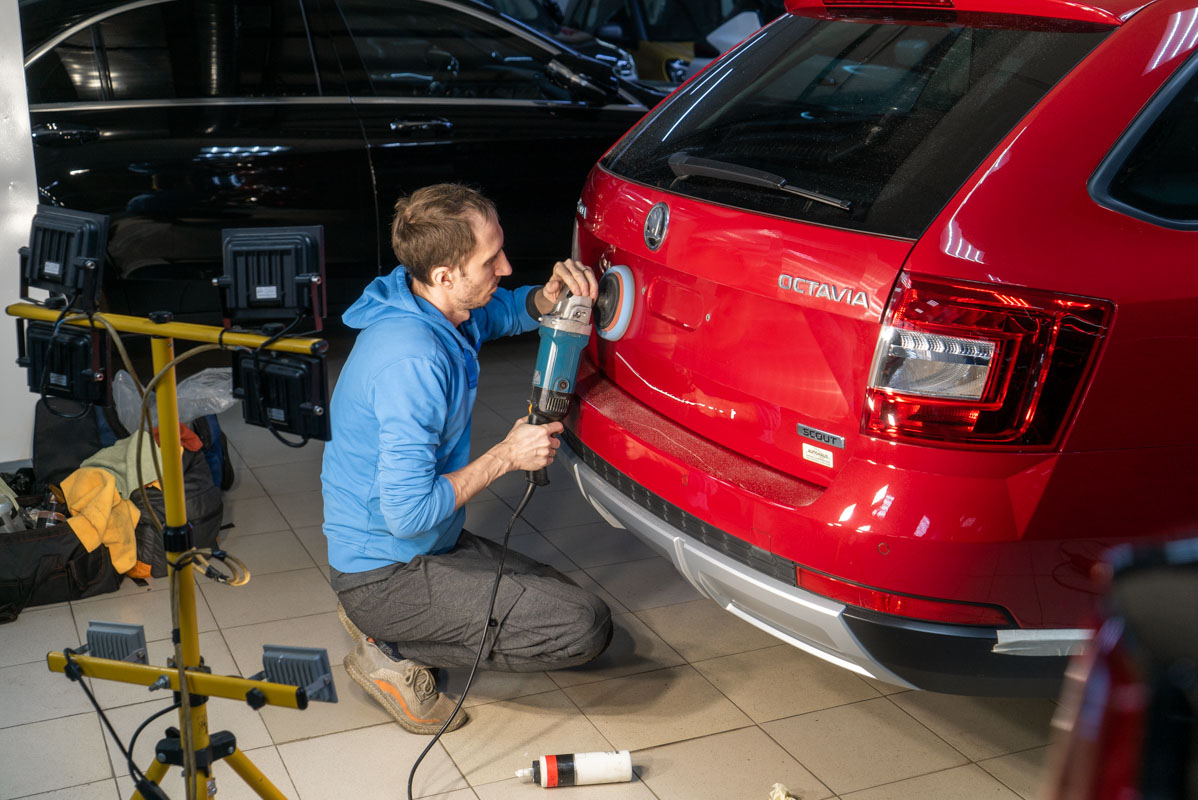 После нанесения состава мастер приступает к абразивной полировке Skoda Octavia Scout, используя полировальные машины с кругами различных диаметров. Мы тщательно прорабатываем каждый сантиметр кузова, эффективно устраняя царапины и микросколы. Особый акцент делается на бамперах, порогах и колесных арках, которые относятся к «отбойной части» автомобиля; именно эти зоны принимают на себя основной удар агрессивной внешней среды во время движения, поэтому требуют максимально глубокой проработки для восстановления эстетики автомобиля.