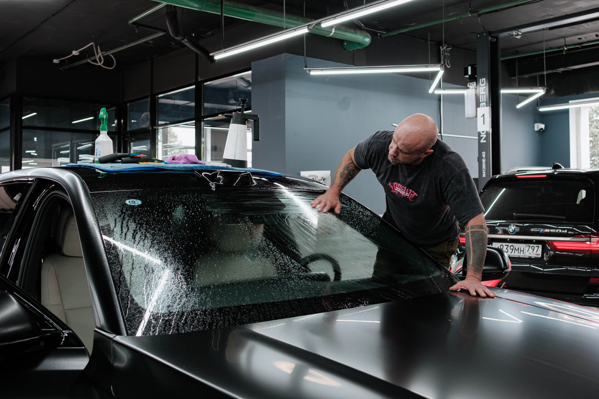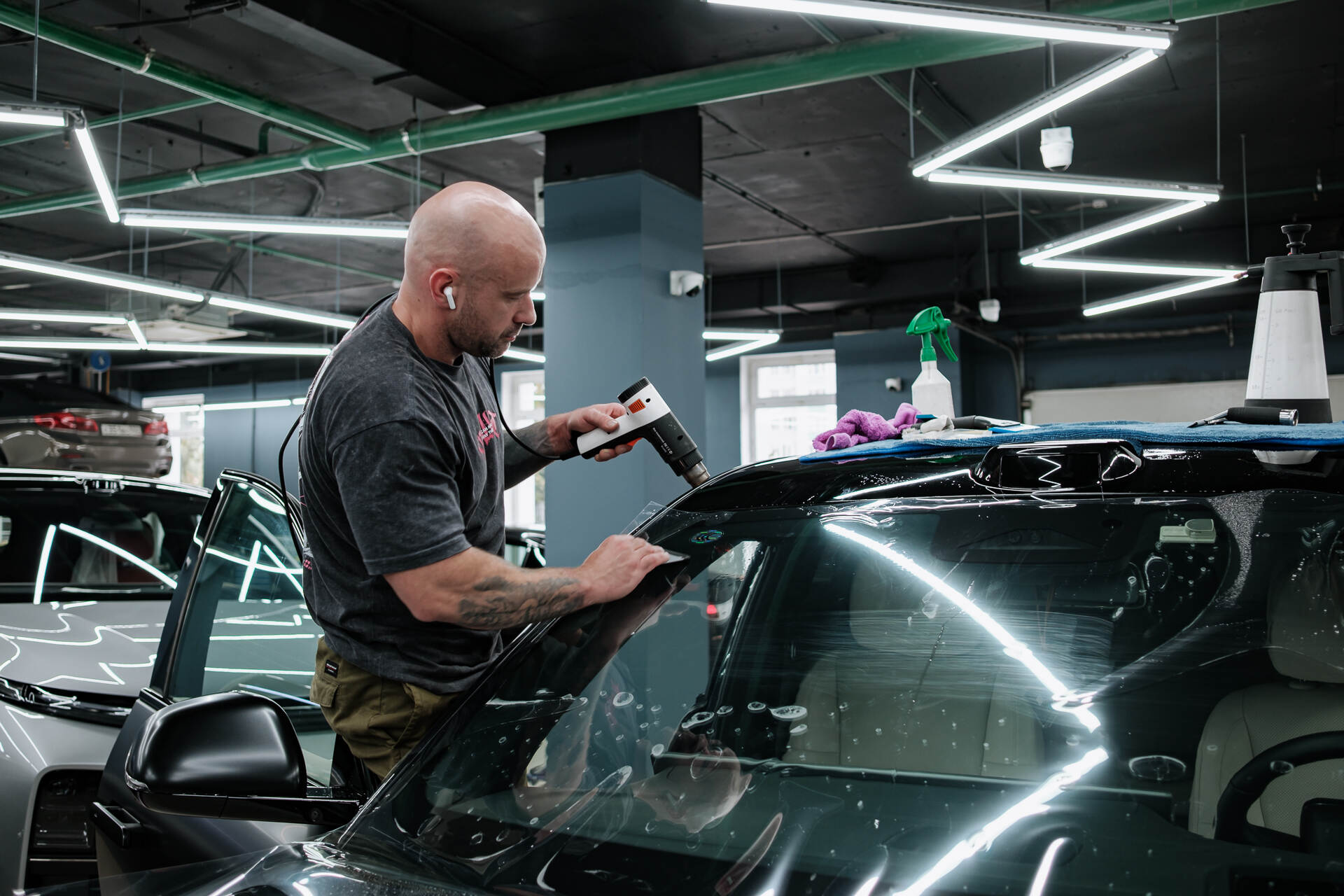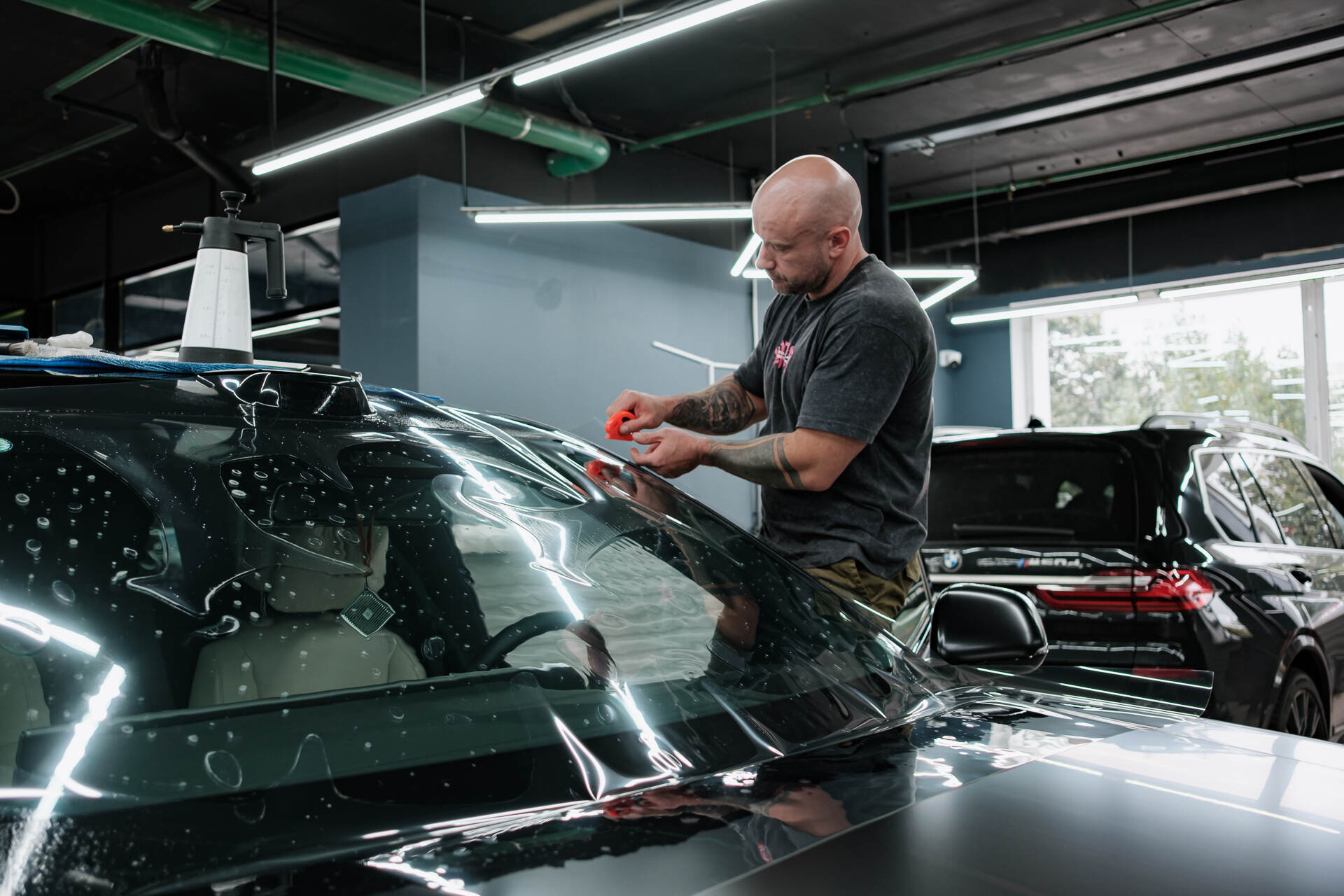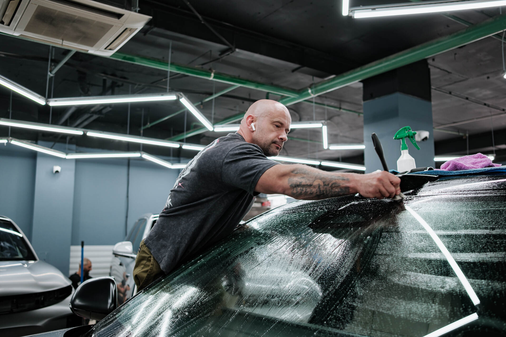 Процесс защиты лобового стекла Lixiang L6 состоит из нескольких этапов. Сначала мы выполняем тщательную мойку и обезжиривание внешней поверхности стекла. Затем из рулонного материала Never Scratch выкраивается отрезок, соответствующий геометрии стеклянной поверхности. На подготовительном этапе пленка обрабатывается мыльным раствором для придания ей необходимой эластичности, после этого материал наносится на стекло и разглаживается ракелем, где мы удаляем излишки влаги и устраняем возможные складки. Полная прозрачность и нейтральность покрытия гарантируют отсутствие искажений и сохранение идеального обзора для водителя.