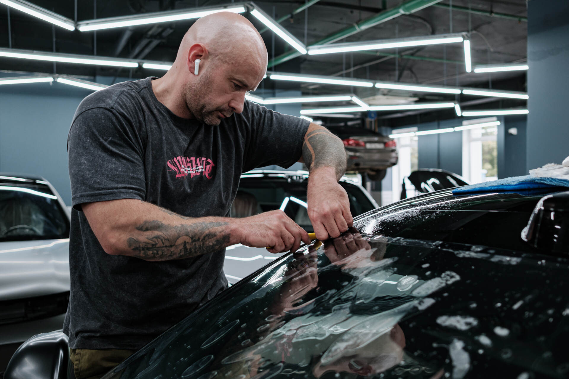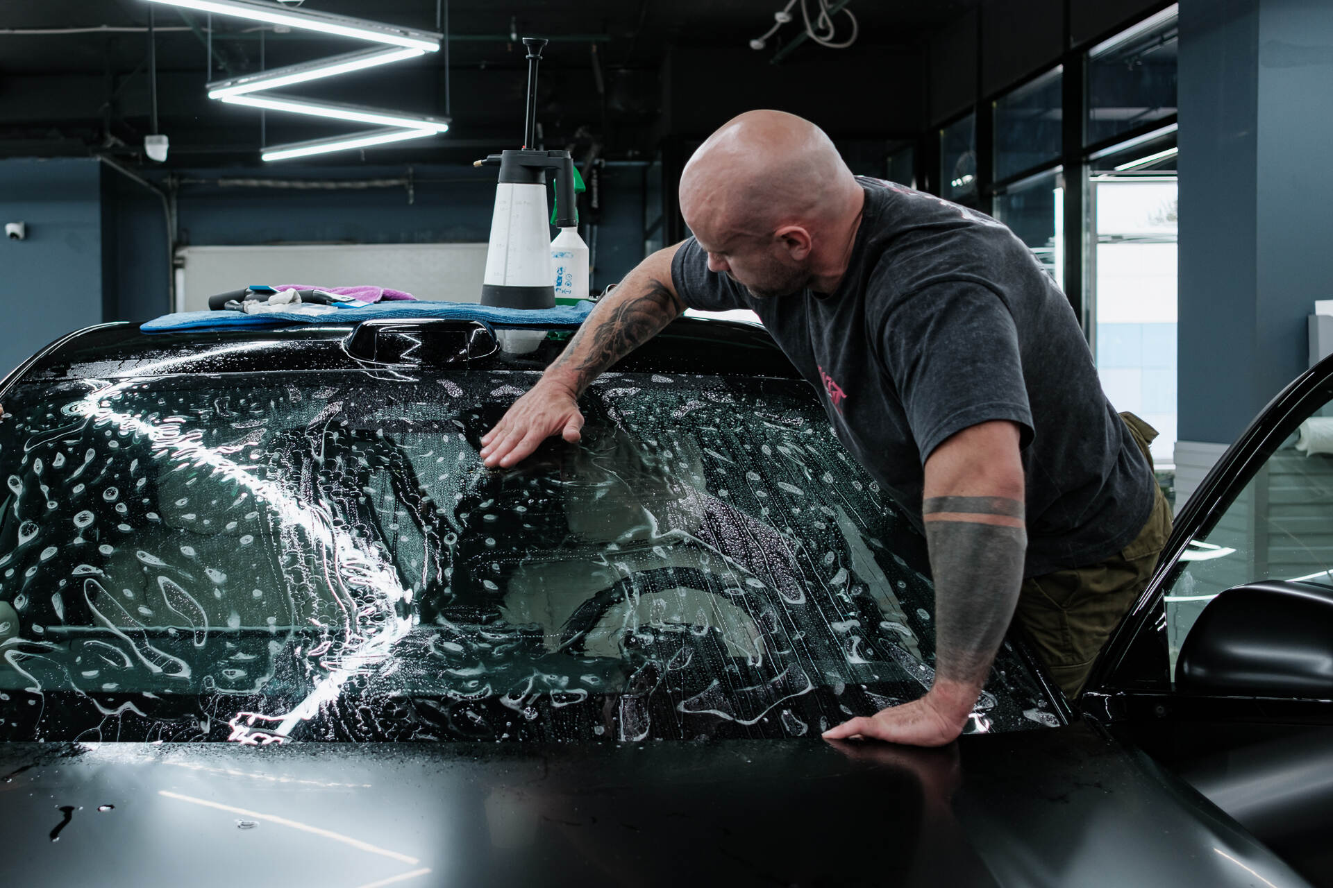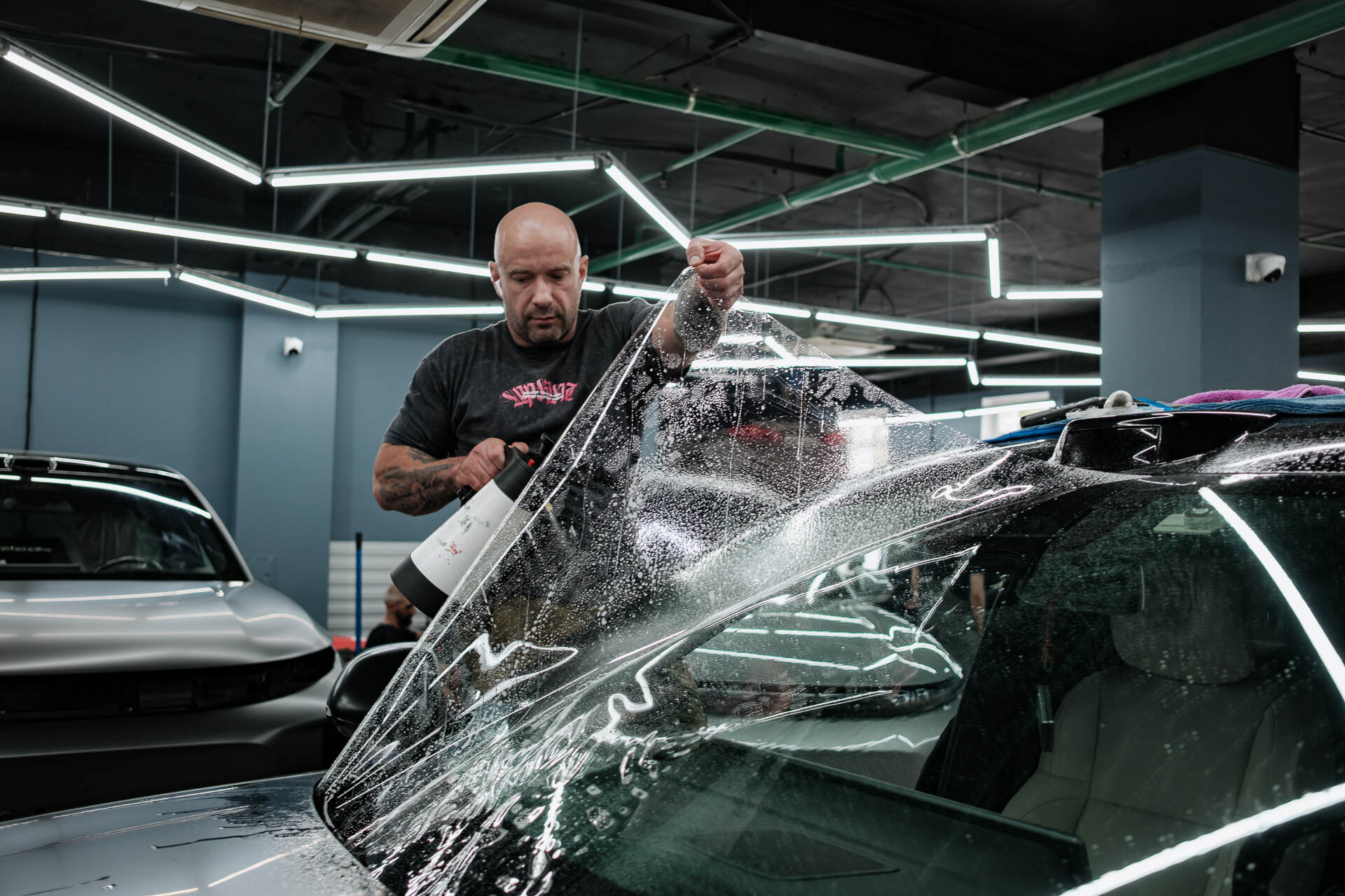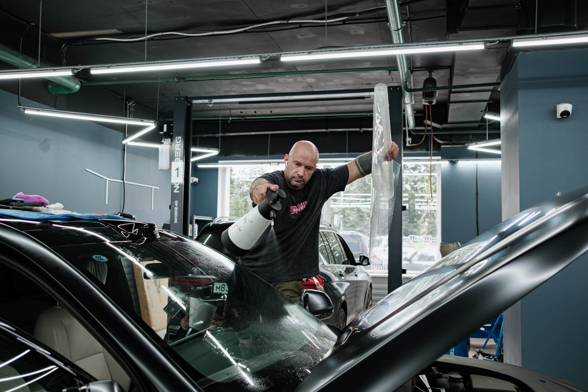 Процесс защиты лобового стекла Lixiang L6 состоит из нескольких этапов. Сначала мы выполняем тщательную мойку и обезжиривание внешней поверхности стекла. Затем из рулонного материала Never Scratch выкраивается отрезок, соответствующий геометрии стеклянной поверхности. На подготовительном этапе пленка обрабатывается мыльным раствором для придания ей необходимой эластичности, после этого материал наносится на стекло и разглаживается ракелем, где мы удаляем излишки влаги и устраняем возможные складки. Полная прозрачность и нейтральность покрытия гарантируют отсутствие искажений и сохранение идеального обзора для водителя.