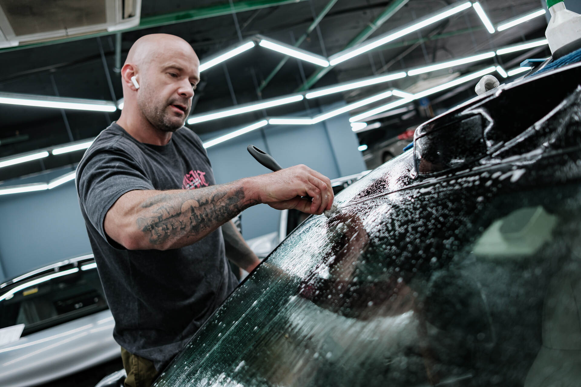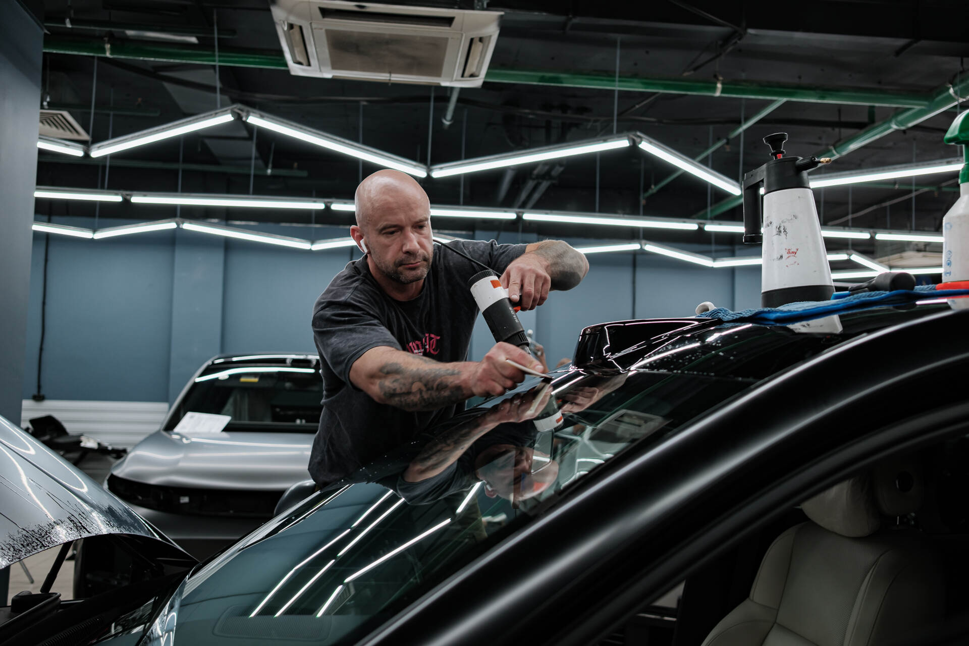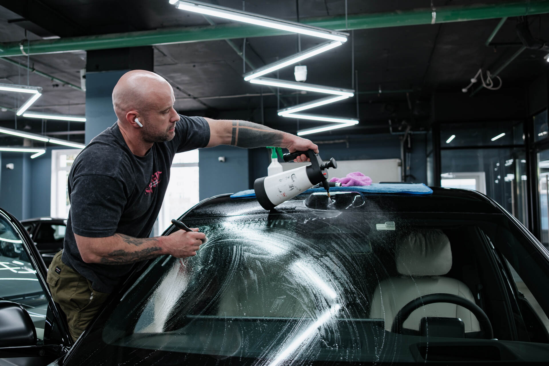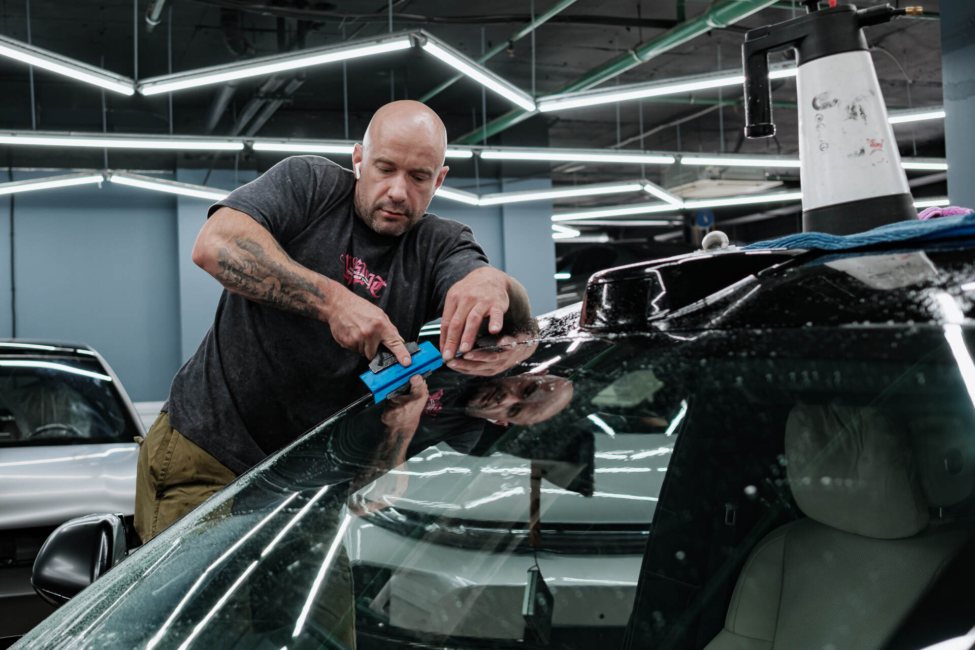 Процесс защиты лобового стекла Lixiang L6 состоит из нескольких этапов. Сначала мы выполняем тщательную мойку и обезжиривание внешней поверхности стекла. Затем из рулонного материала Never Scratch выкраивается отрезок, соответствующий геометрии стеклянной поверхности. На подготовительном этапе пленка обрабатывается мыльным раствором для придания ей необходимой эластичности, после этого материал наносится на стекло и разглаживается ракелем, где мы удаляем излишки влаги и устраняем возможные складки. Полная прозрачность и нейтральность покрытия гарантируют отсутствие искажений и сохранение идеального обзора для водителя.