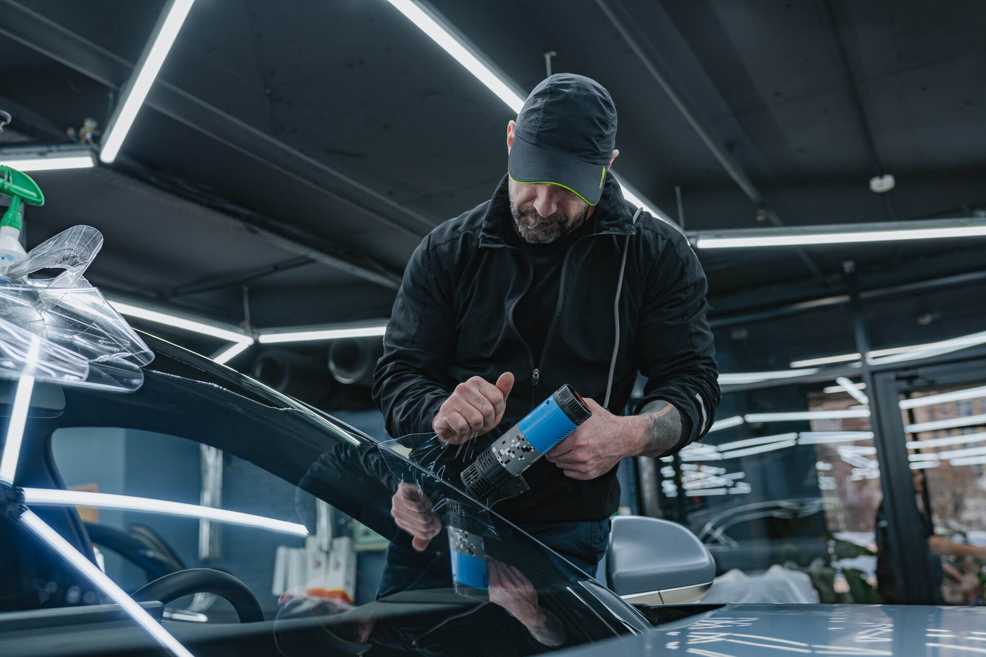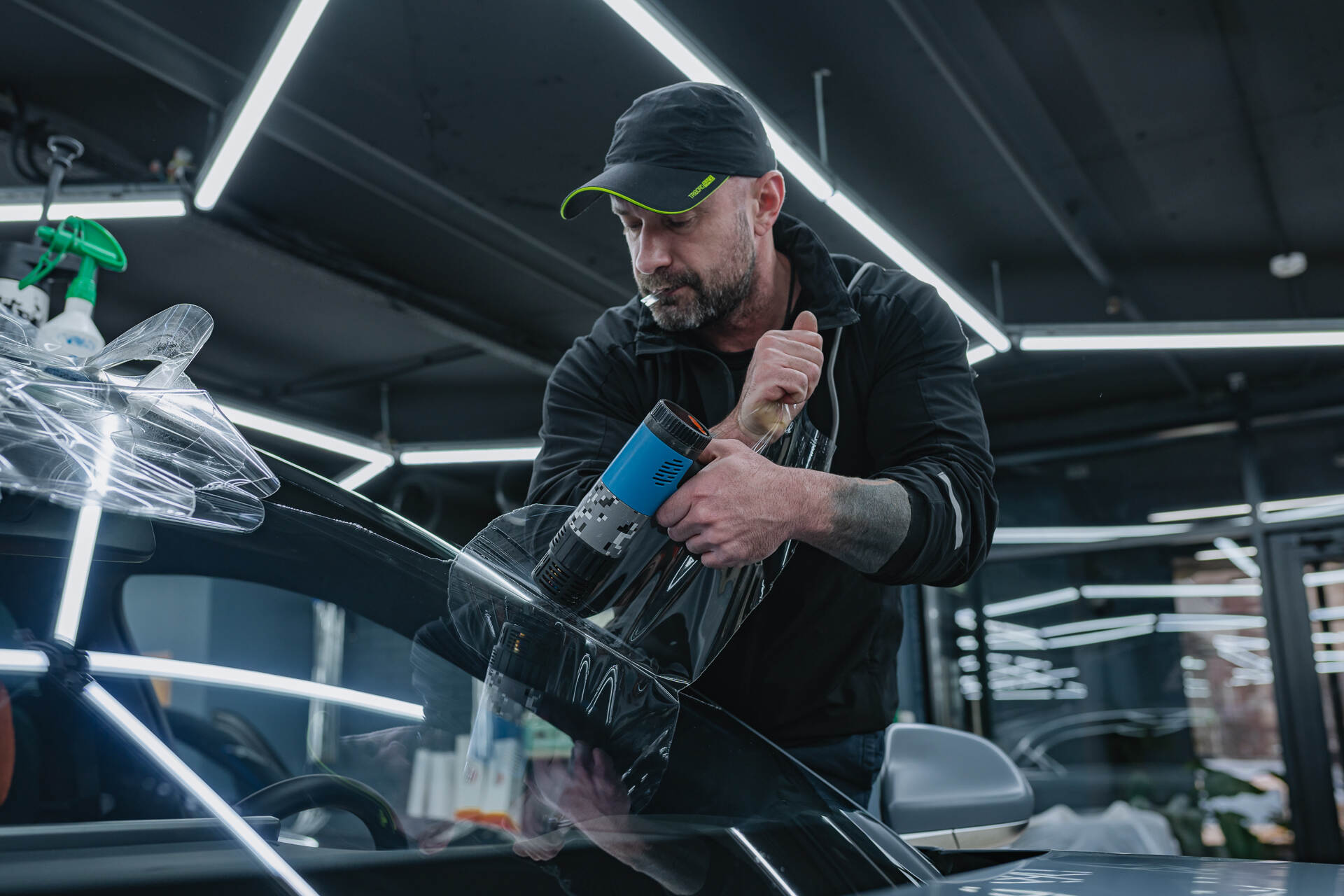 Удаляем старую защитную плёнку с лобового стекла.