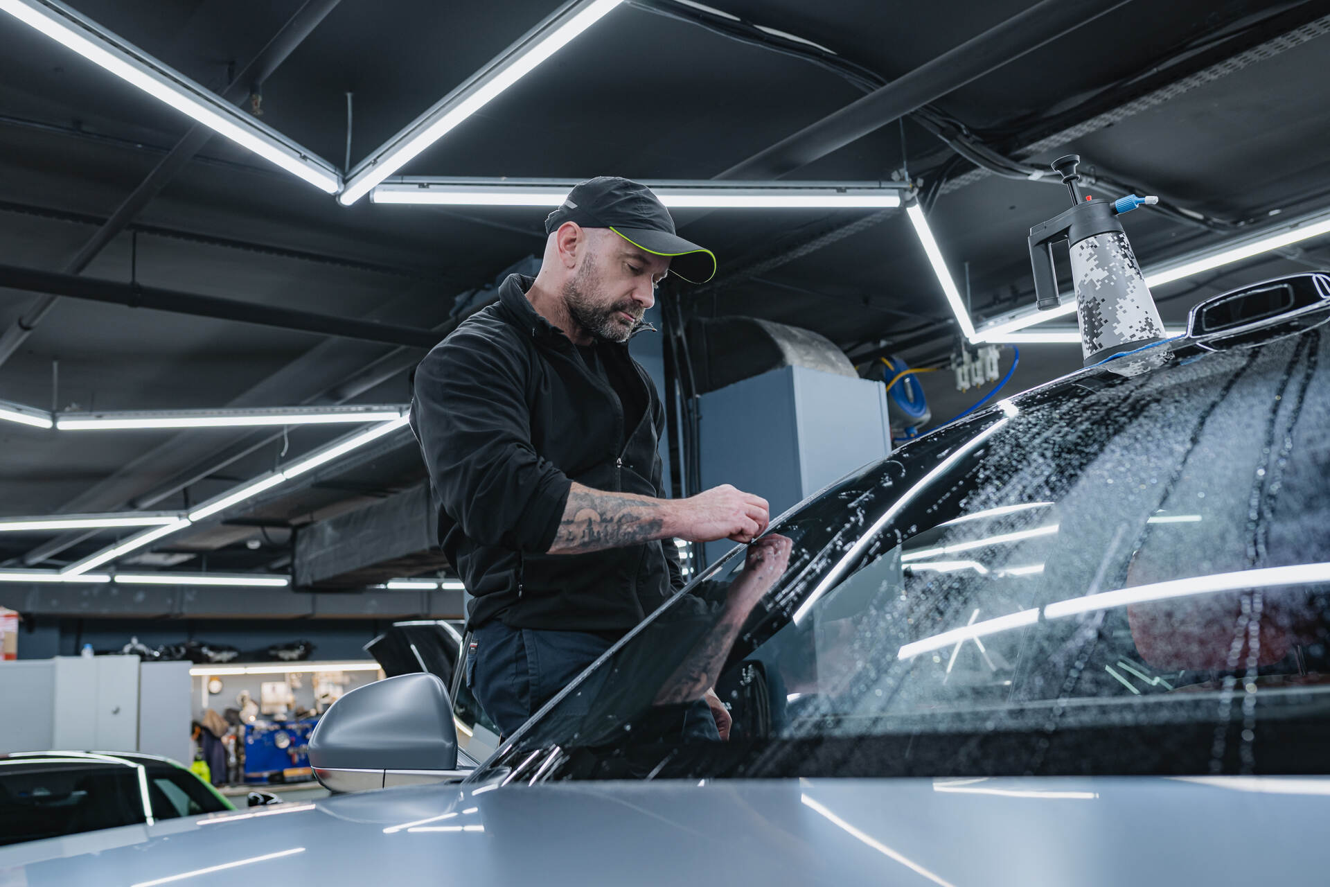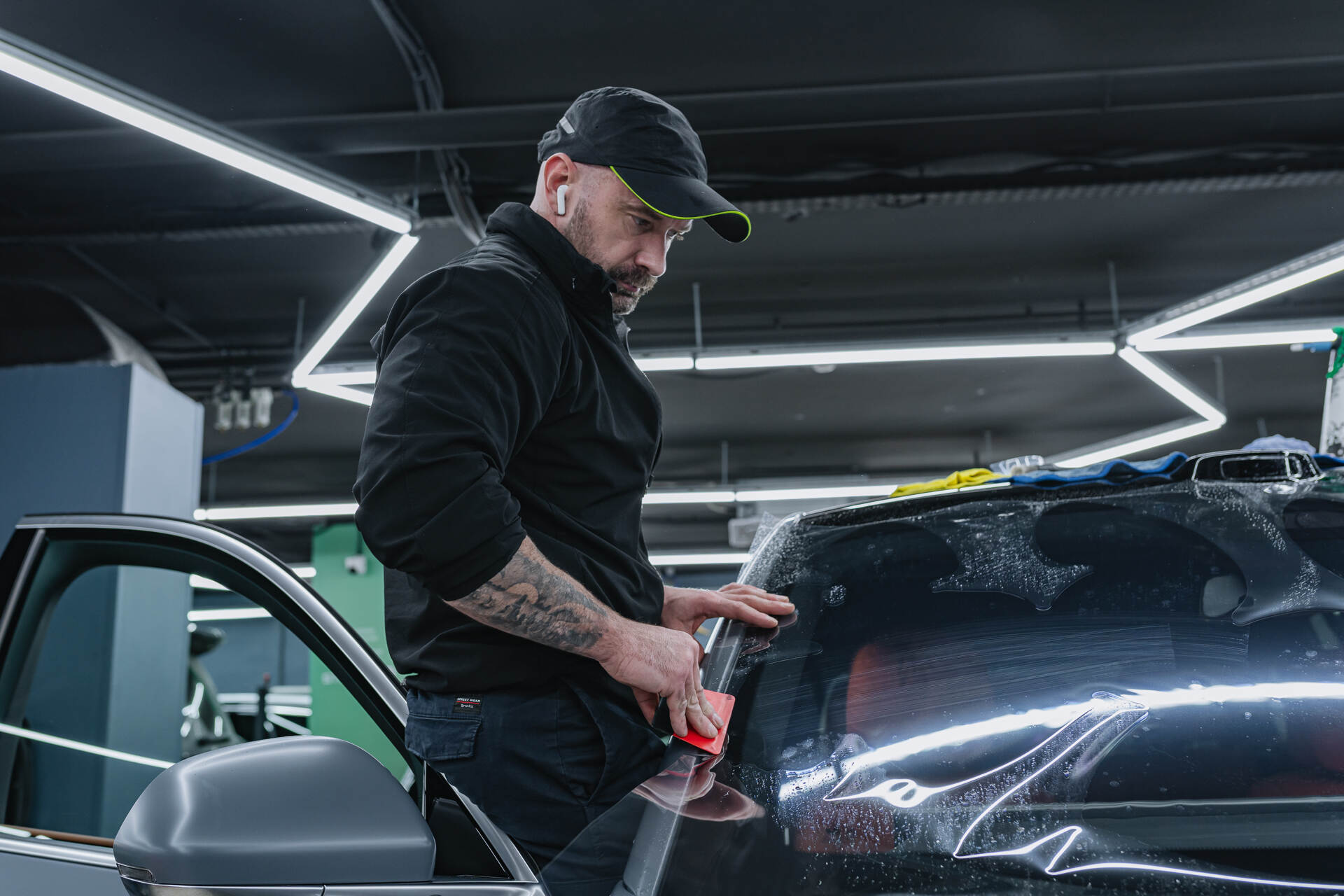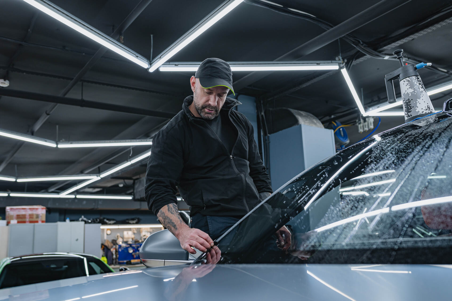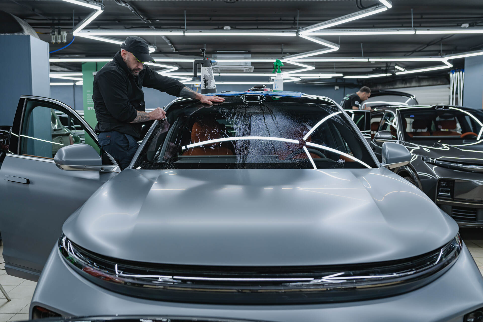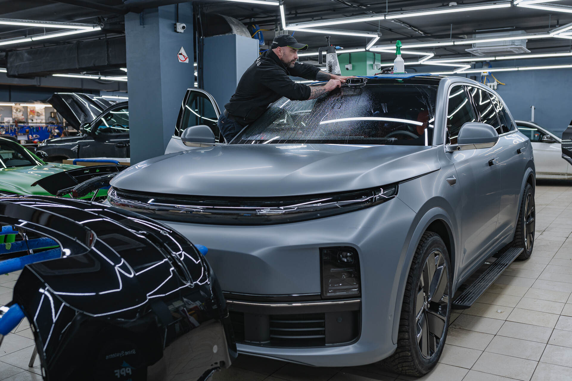 Бронирование лобового стекла Lixiang L7 Рестайлинг 2025 начинается с глубокой очистки и обезжиривания поверхности для достижения идеальной прозрачности. Мастер подготавливает полотно пленки нужного размера, обрабатывает его мыльным раствором и натягивает на стекло, планомерно выгоняя остаточную влагу и разглаживая складки ракелем. Финальная подгонка требует ювелирной точности: излишки материала аккуратно удаляются лезвием строго по контуру. Весь цикл занимает несколько часов, обычно мы справляемся за 3-6 часа, так как работа с пленкой Spectroll Windshield осложнена ее специфической жесткостью при малой толщине в 112 микрон. Такая работа требует высокой квалификации, ведь малейшая ошибка может испортить дорогостоящий материал, предназначенный для защиты от дорожных невзгод.
