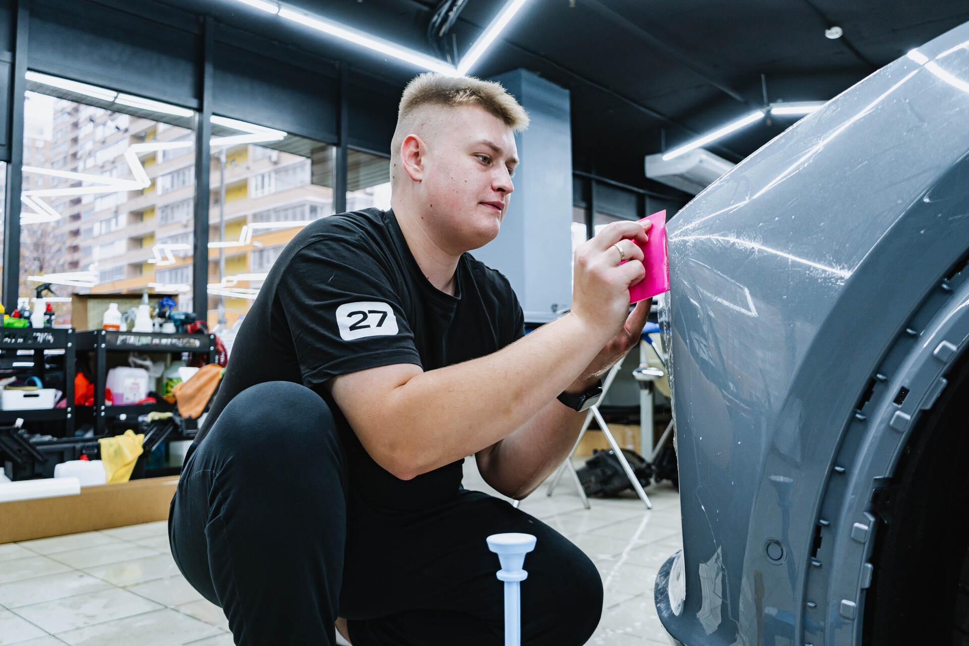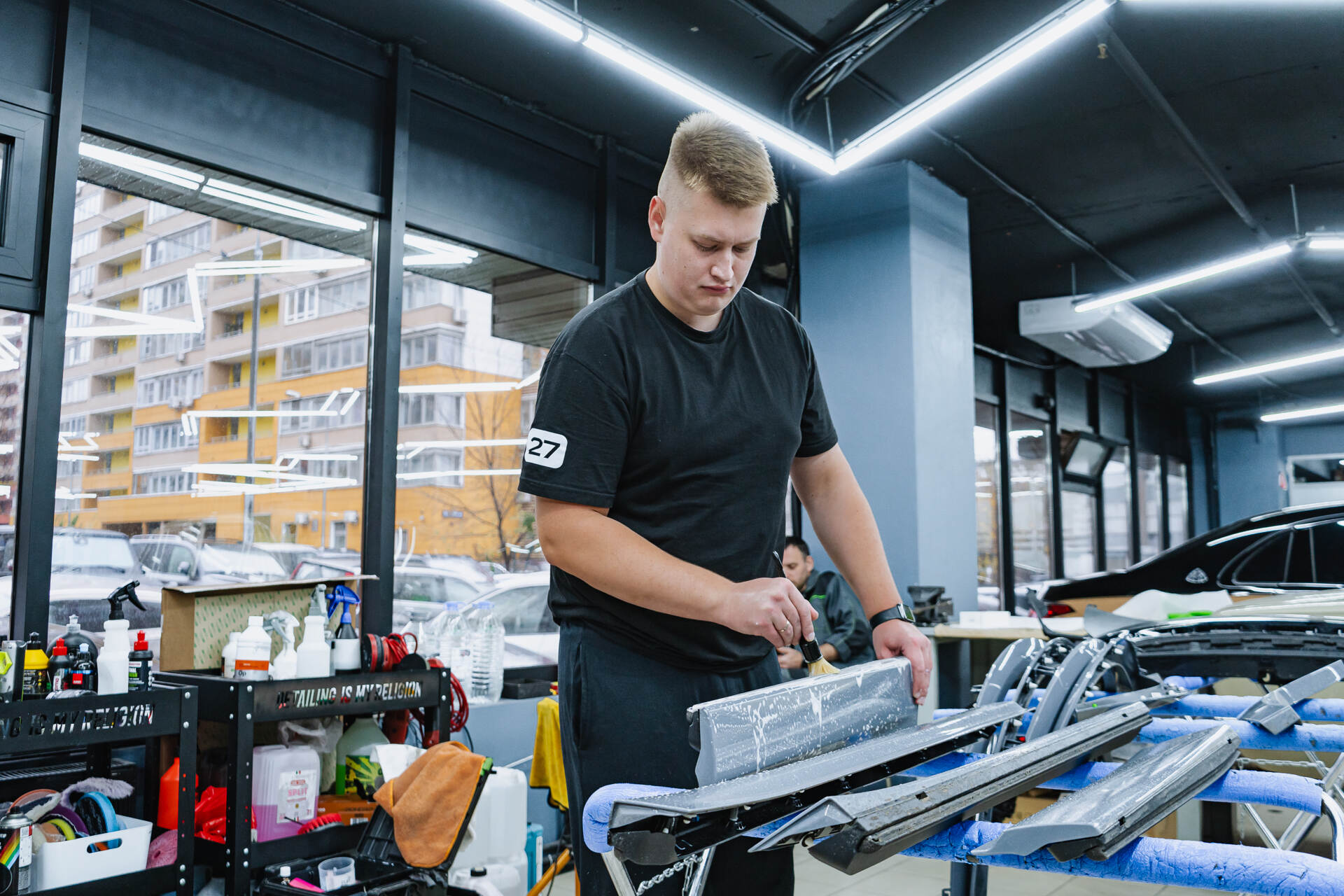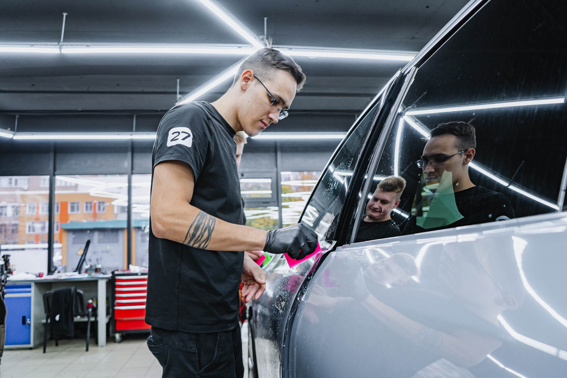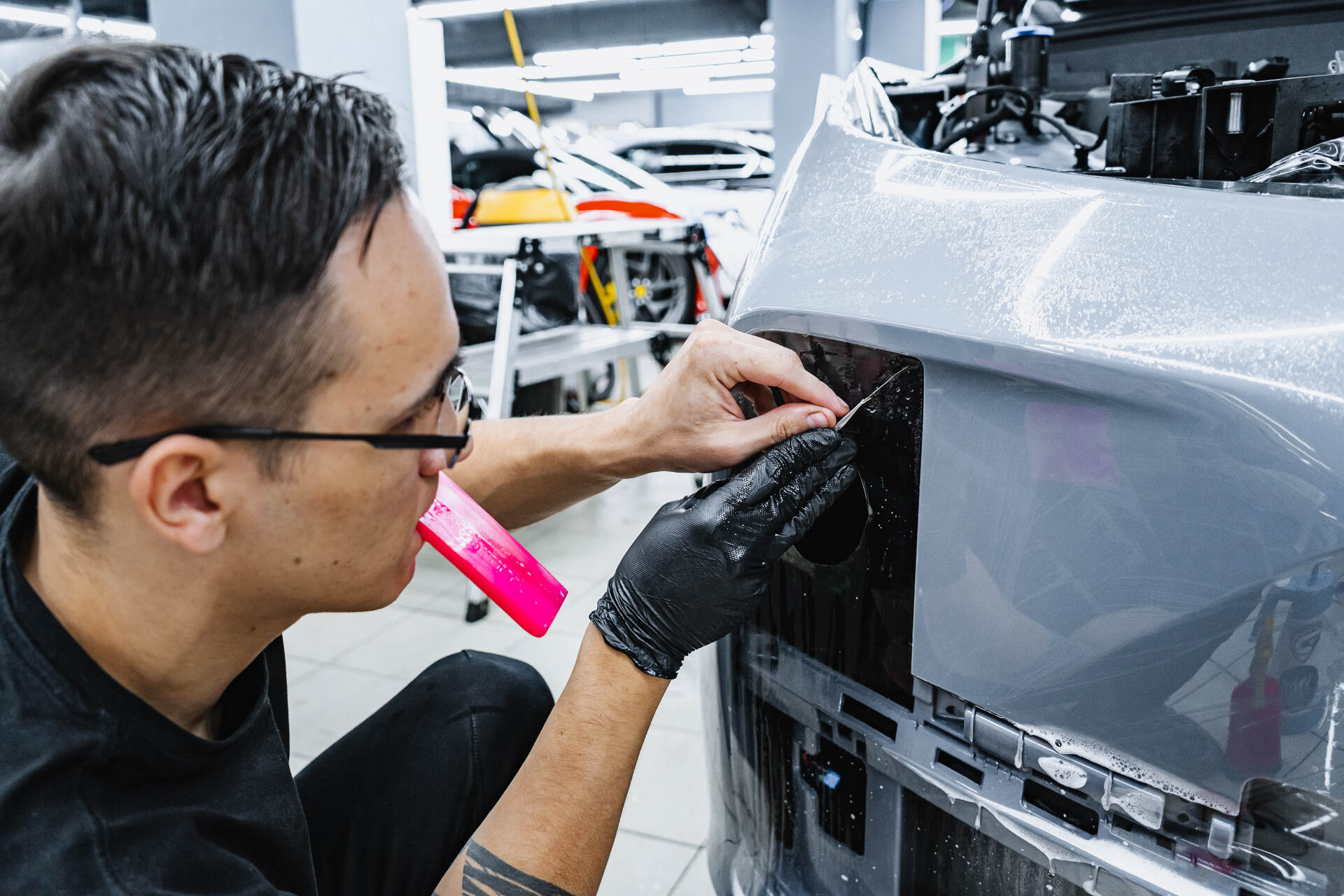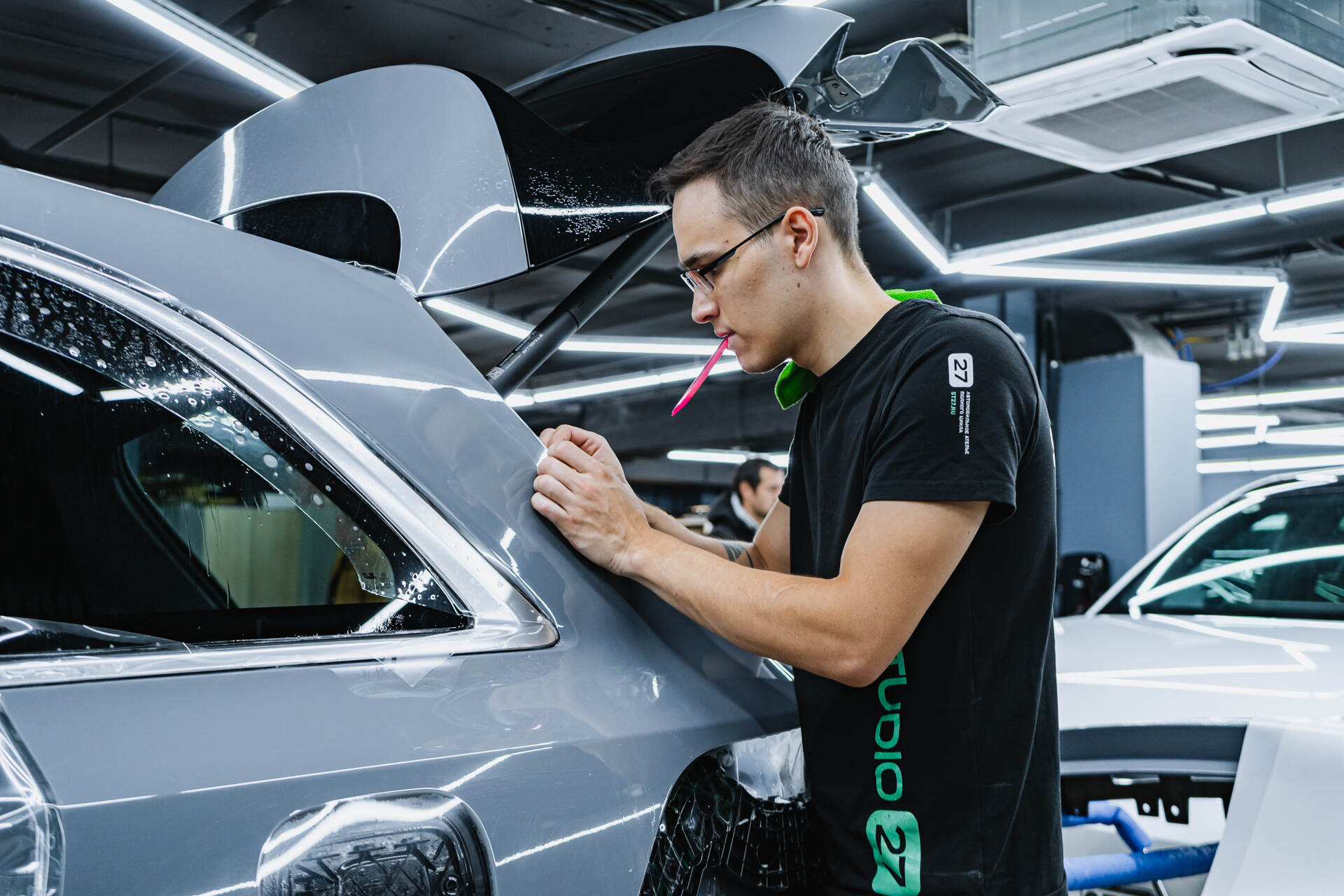 Процесс непосредственного нанесения плёнки на кузов Lixiang L7 Рестайлинг 2025 состоит из нескольких последовательных этапов. В первую очередь мы подготавливаем и вырезаем куски плёнки подходящего размера, точно соответствующие формам разных частей кузова. Затем эти фрагменты промываются специальным мыльным раствором, и только после этого увлажненная плёнка аккуратно наносится на автомобиль. Во время этого этапа крайне важно тщательно разглаживать все складки с помощью ракеля, одновременно удаляя из-под плёнки всю оставшуюся влагу.