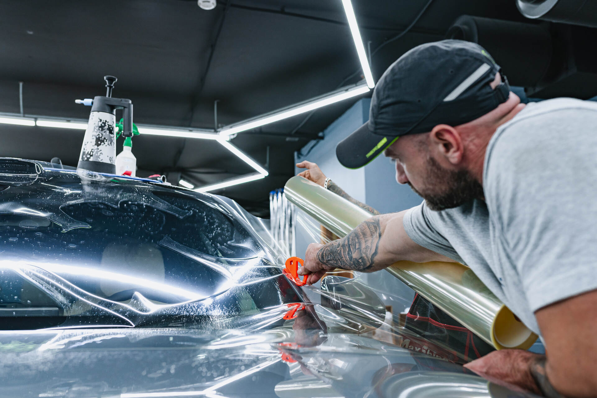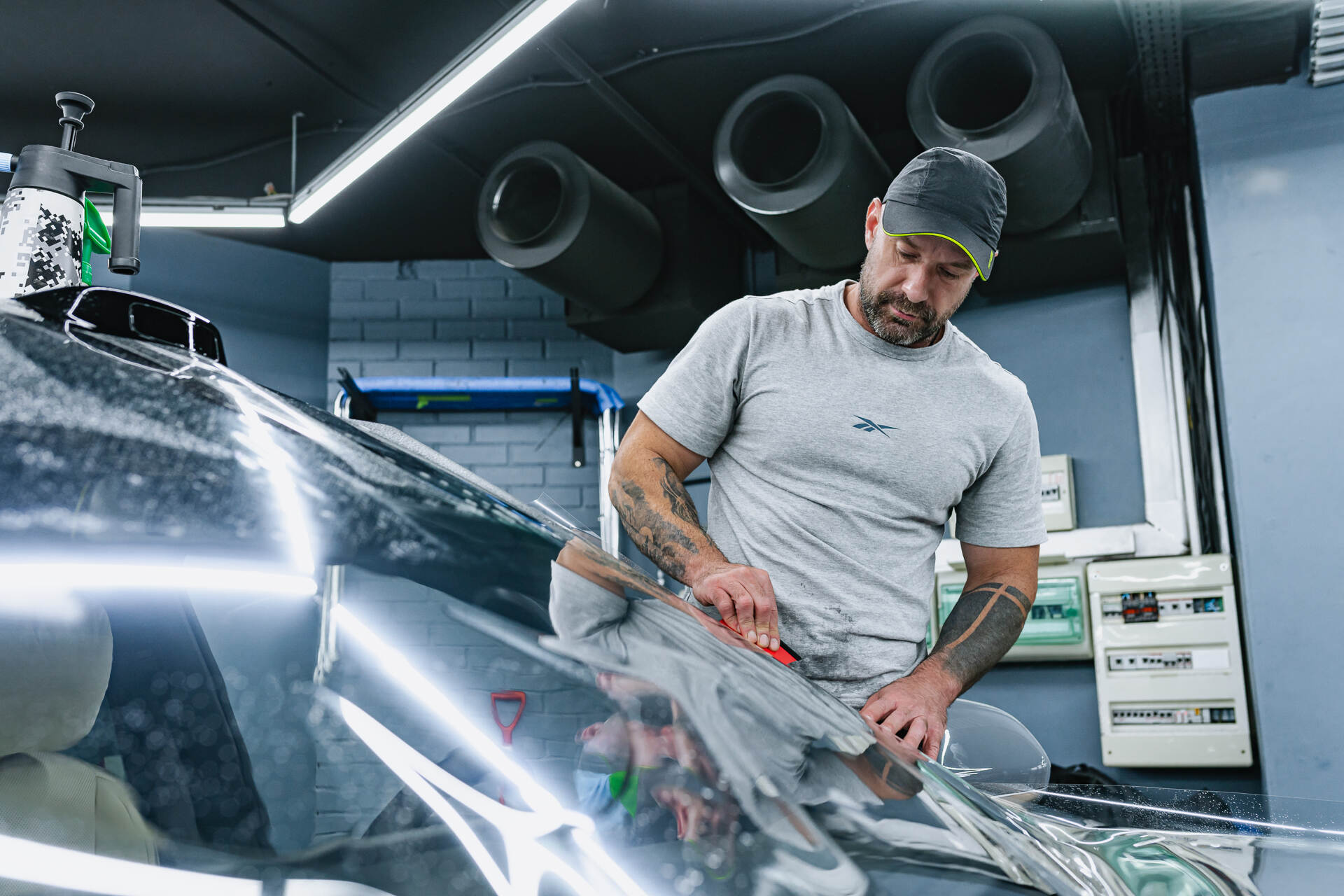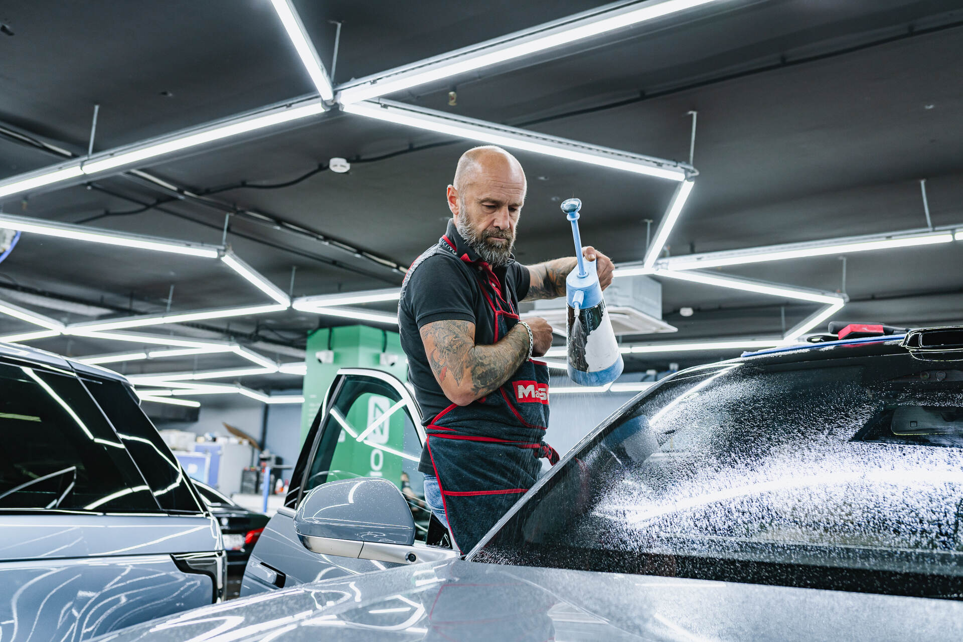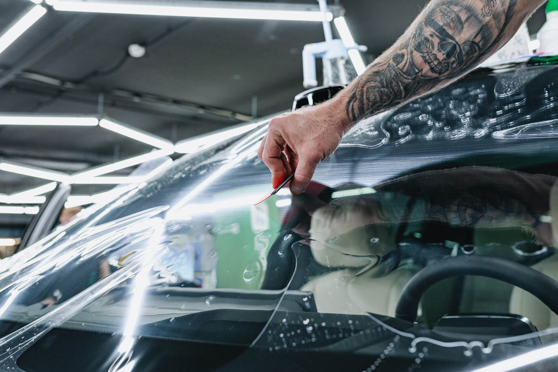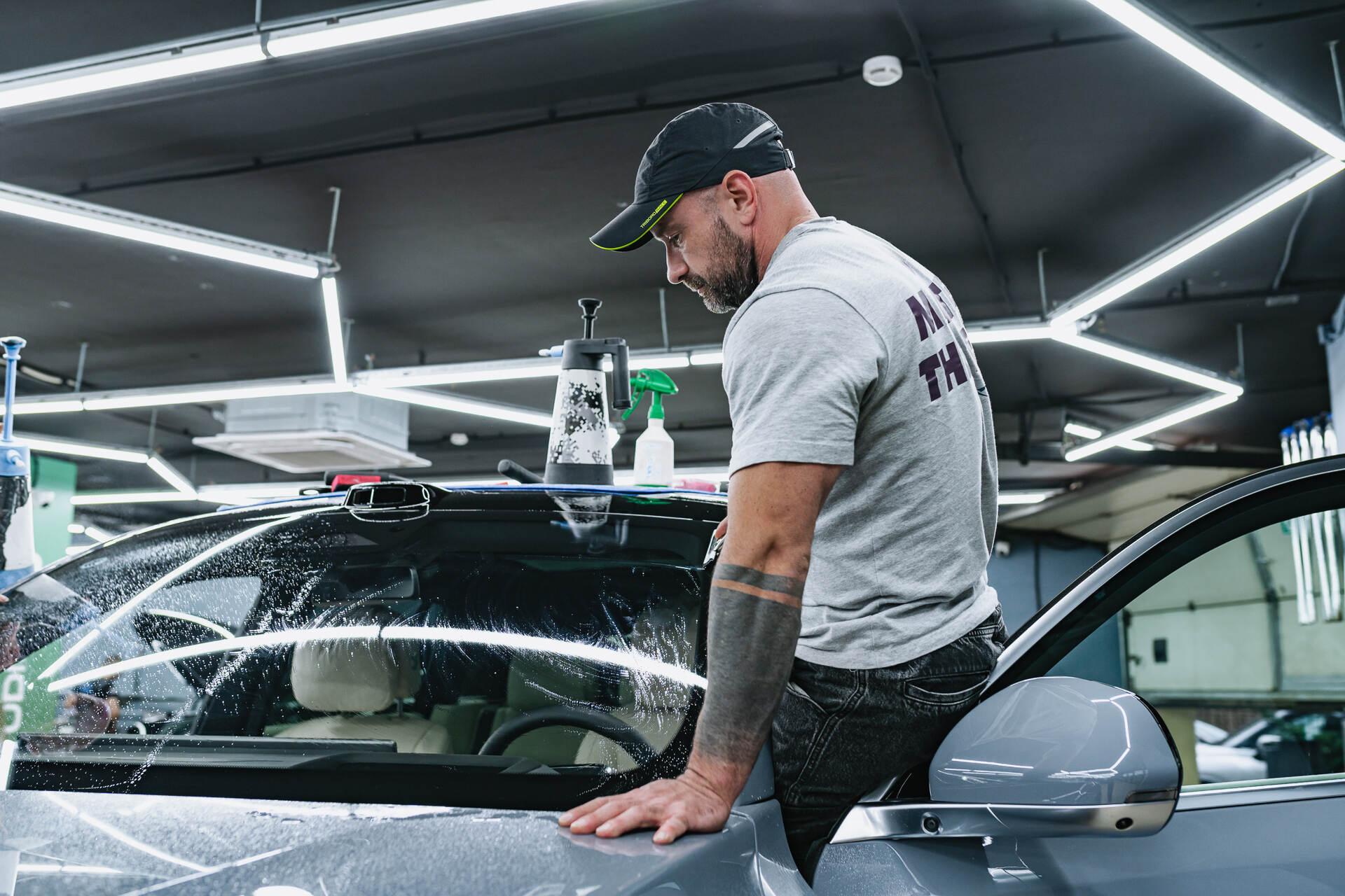 Процесс бронирования лобового стекла Lixiang L7 2025 Рестайлинг выглядит следующим образом: сначала мы тщательно моем и обезжириваем стекло с внешней стороны. Затем из рулона плёнки Never Scratch вырезается заготовка, точно соответствующая размеру стекла. Следующий шаг — обработка материала мыльным раствором для большей податливости во время монтажа. После этого плёнка наносится непосредственно на лобовое стекло и сразу же разглаживается специальным ракелем, что позволяет выгнать из-под неё излишки влаги и устранить любые складки. Плёнка является абсолютно прозрачной и бесцветной, поэтому она не создаёт никаких оптических искажений и не ухудшает обзор для водителя.