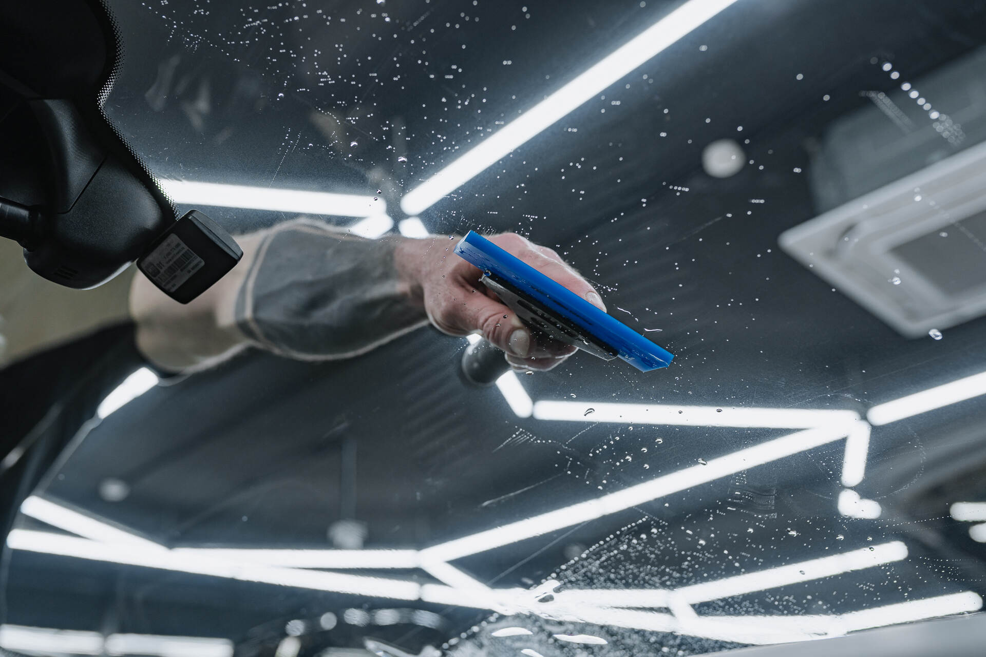 Моем лобовое стекло и готовим плёнку к поклейке.