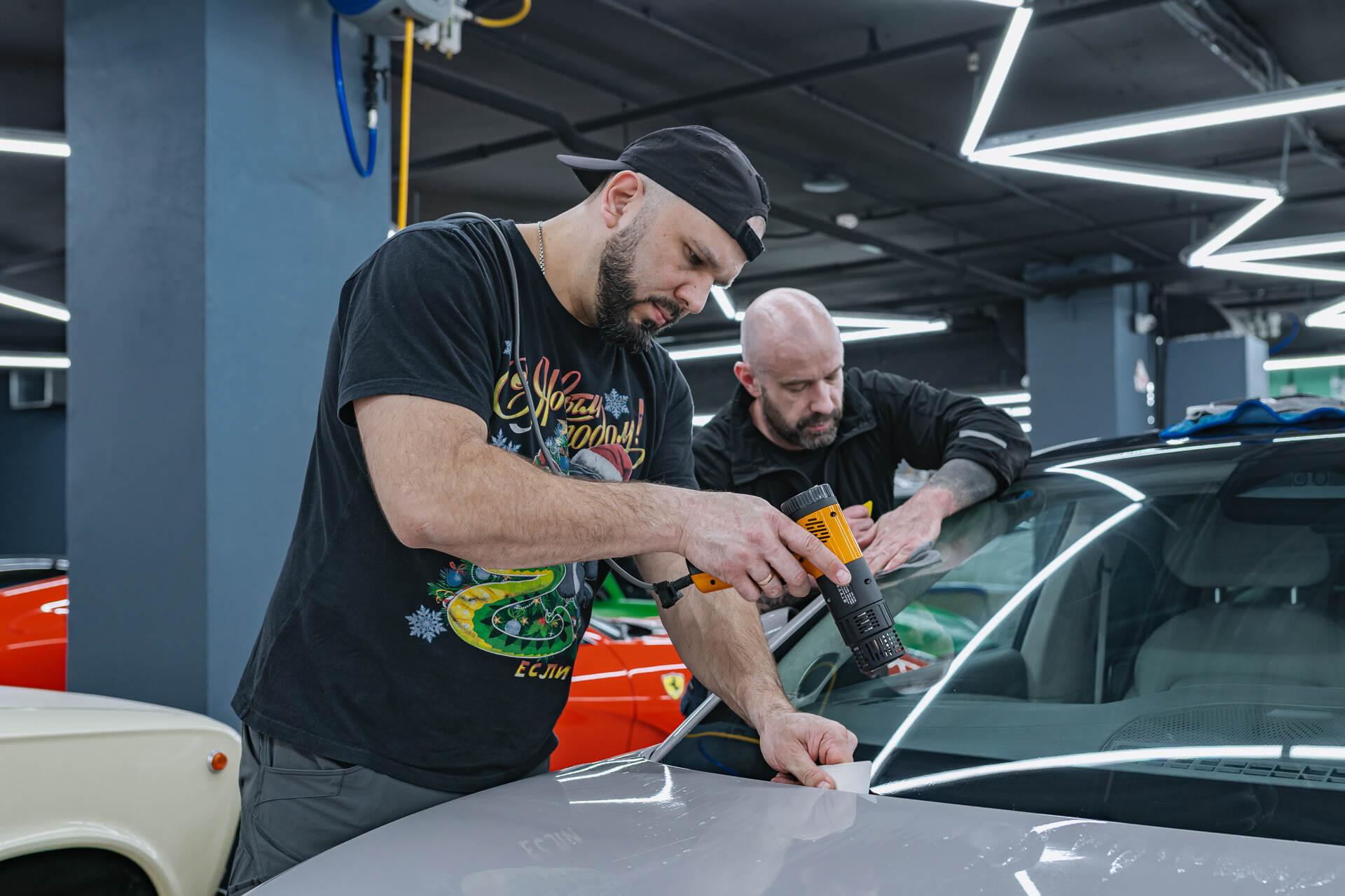 Прогреваем нанесённую плёнку на лобовое стекло Райзинг Ф7 феном.