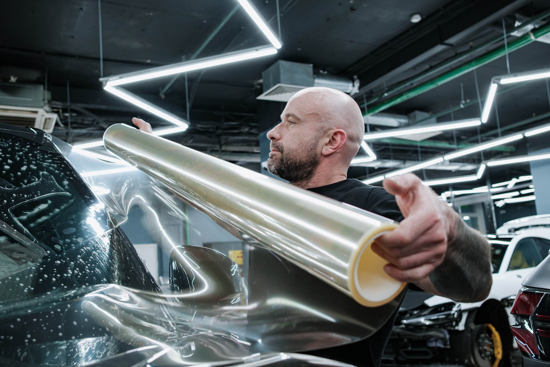 Бронирование лобового стекла Zeekr 9X Ultra начинается с глубокой очистки и обезжиривания поверхности, затем мастер вырезает полотно плёнки и общего мотка нужного размера, обрабатывает его мыльным раствором и натягивает на стекло, тщательно выгоняя влагу и складки с помощью ракеля. После фиксации излишки материала аккуратно удаляются лезвием точно по контуру. Процедура требует от трех до шести часов времени – мы не торопимся, а работаем на качество, ведь плёнка пленка RAYNO довольно плотная и имеет толщину около 112 микрон. Работа с таким материалом под силу только опытному специалисту, способному соблюсти технологию и гарантировать безупречное прилегание защиты.