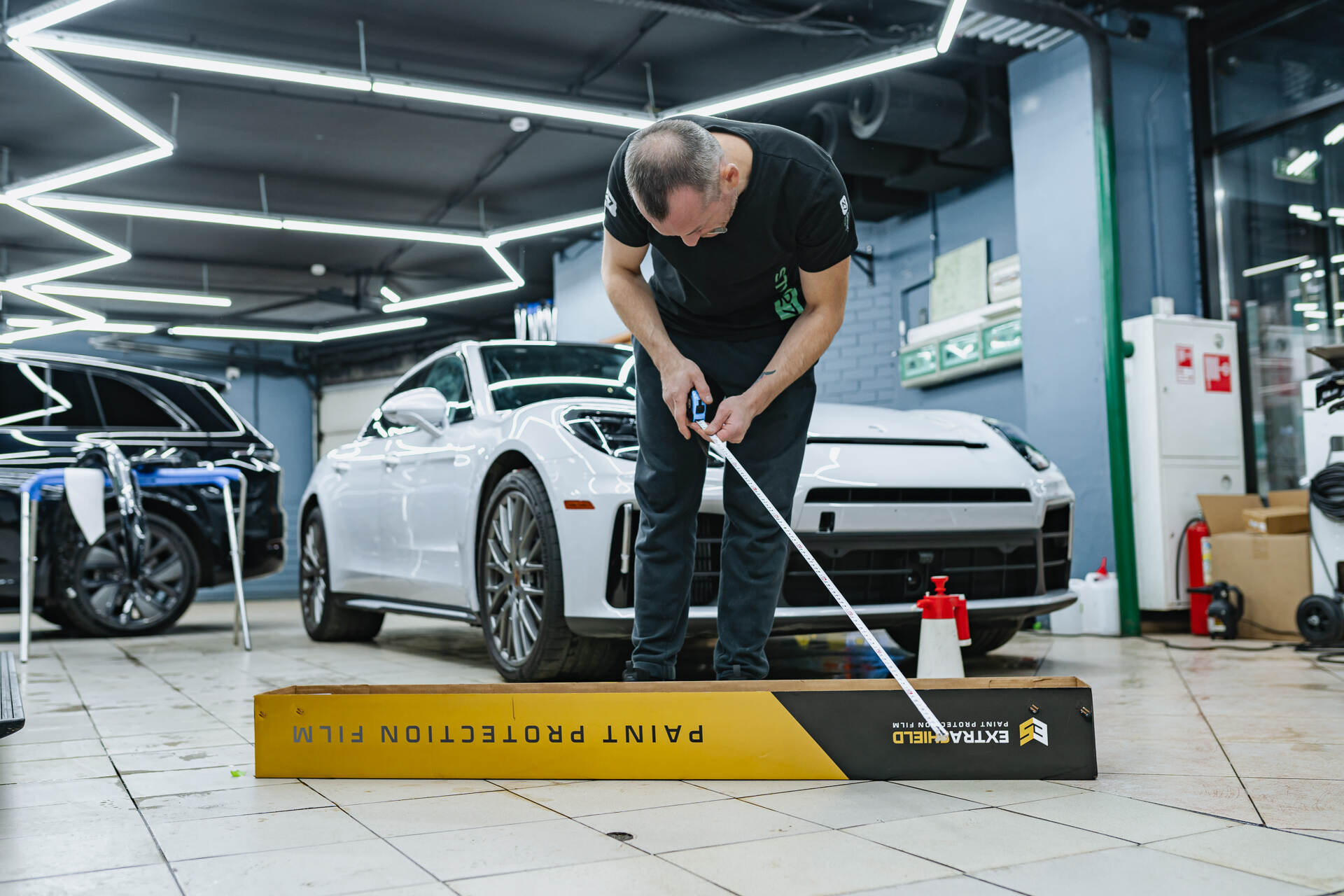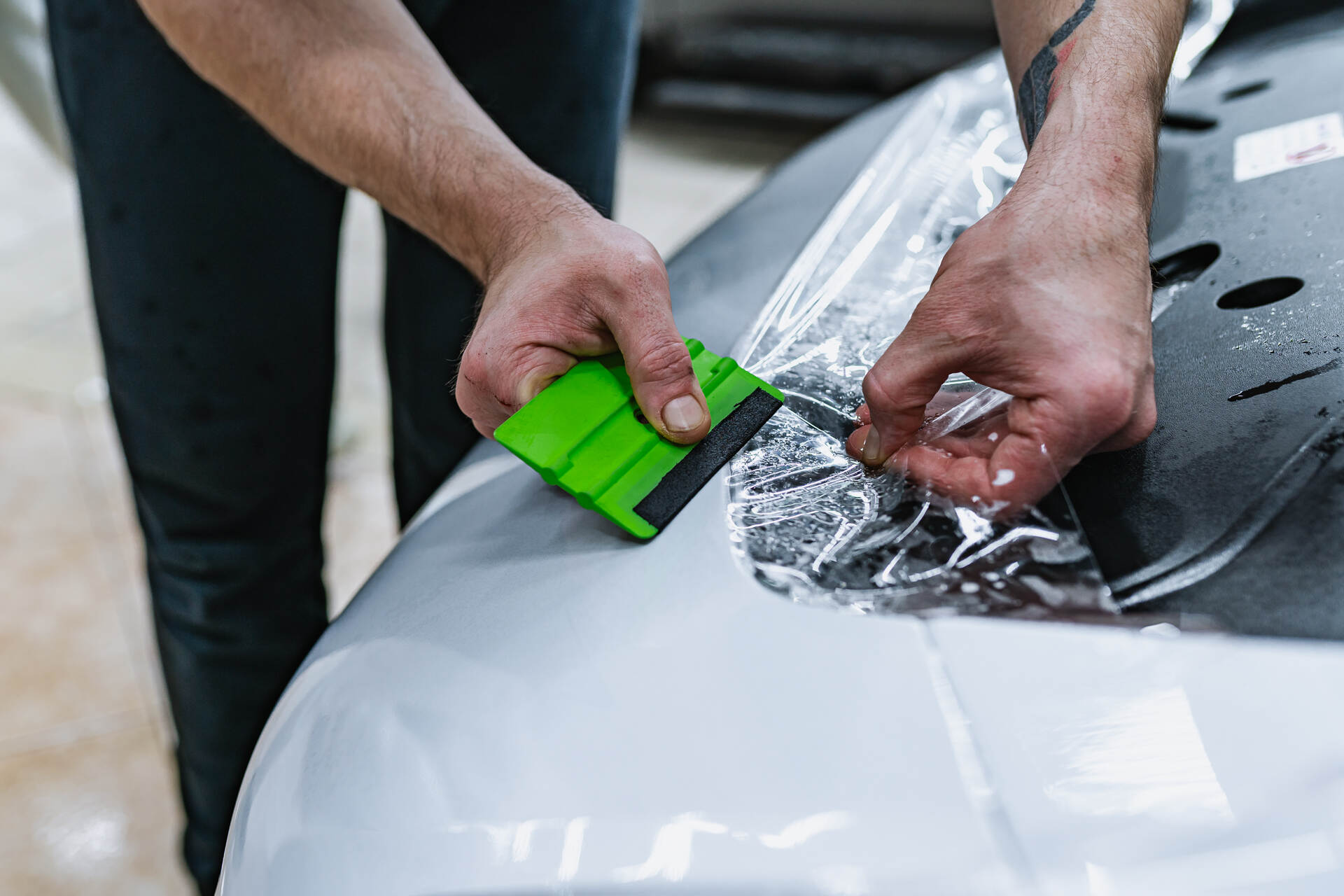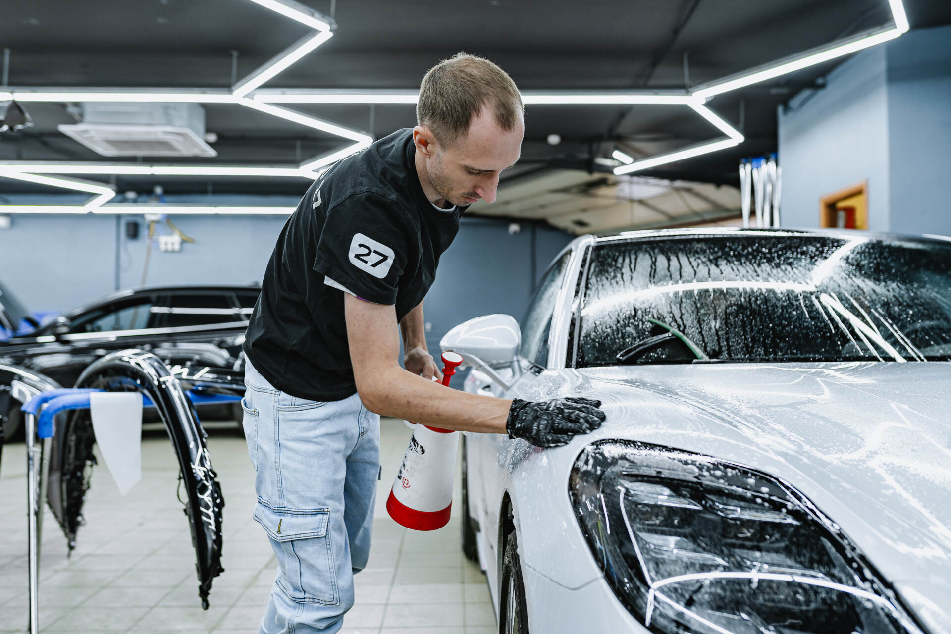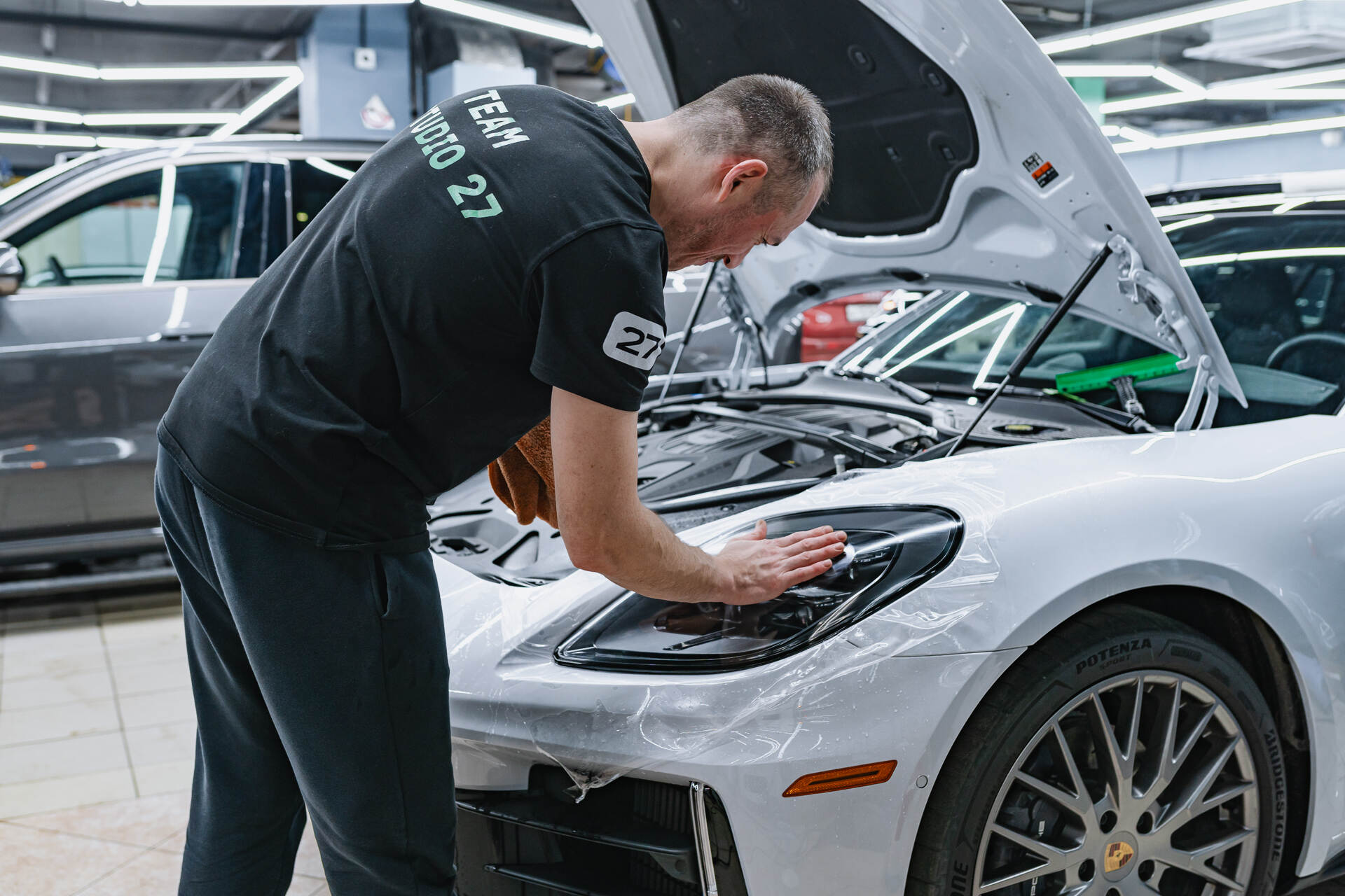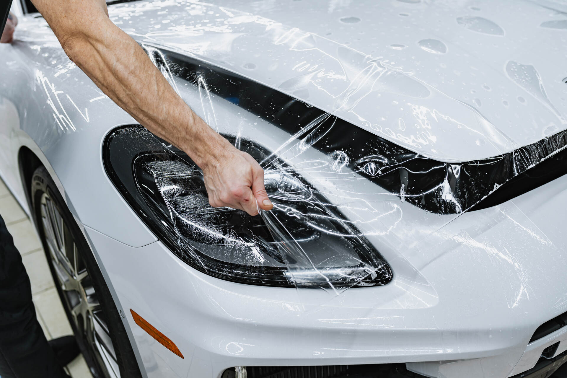 Оклейка кузова Порше Панамера включает в себя защиту капота, фар, бампера, передних крыльев, стоек и зеркал заднего вида. Это наиболее востребованный комплекс, который как раз охватывает всю наиболее уязвимую, «ударную» часть автомобиля. Услуга относится к премиальному сегменту, однако мы говорим о долгосрочном сохранении безупречного внешнего вида машины — здесь каждый расставляет приоритеты сам. Сам процесс нанесения плёнки начинается с тщательной мойки и обезжиривания кузова, также в обязательном порядке полируем кузов, чтобы придать его блеск и гладкость. Затем мы подготавливаем отрезки материала: смачиваем их мыльным раствором и, плотно натягивая на поверхность, тщательно разглаживаем специальным ракелем. В процессе разглаживания мы устраняем возможные складки и полностью выгоняем остатки влаги из-под плёнки.
