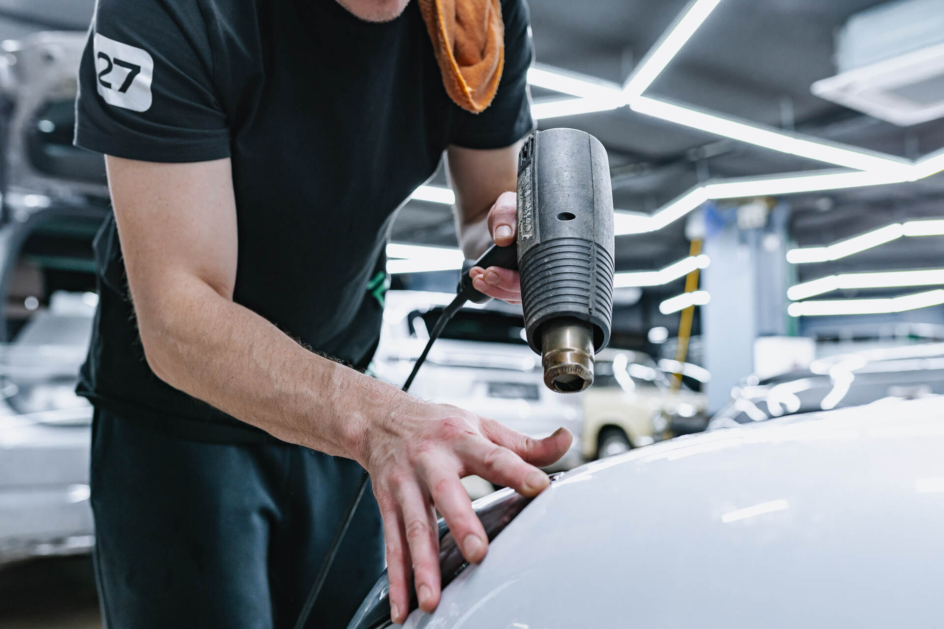 Все элементы кузова Porsche Panamera бронируются по единой технологии, поэтому подробно останавливаться на каждом нет необходимости. Итак, плёнка нанесена, и следующим шагом мы подгоняем её размеры с помощью лезвия. После этого участки с плёнкой прогреваются промышленным феном для окончательной фиксации материала: под воздействием температуры защитный слой плотно облегает поверхности, идеально повторяя все их контуры и изгибы. Стоит отметить, что плёнка Spectroll Premium абсолютно прозрачна, и эта прозрачность сохранится на протяжении многих лет эксплуатации.
