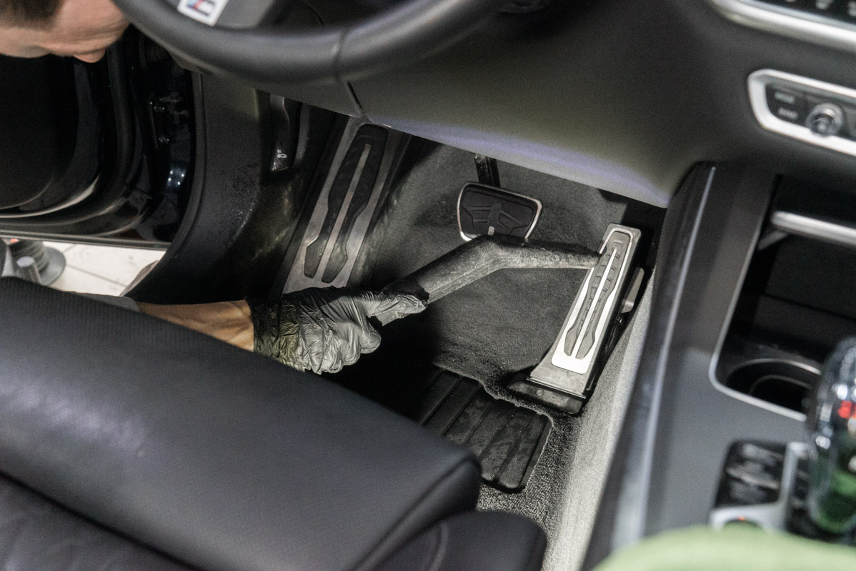 Работа по химчистке интерьера BMW X5 G05 начинается с уборки при помощи мощного пылесоса, охватывая даже самые скрытые стыки внутри салона и пространство багажного отсека. Следом за этим на кресла, элементы дверных панелей и фронтальную консоль распределяются специализированные чистящие средства, которые гарантируют качественное расщепление грязи в глубоких слоях без риска появления неэстетичных пятен или разводов. Итоговым действием становится тщательное удаление остатков влаги и просушивание поверхностей с применением направленного потока сжатого воздуха. В своей практике мы доверяем только флагманским чистящим продуктам от глобальных лидеров индустрии, таких как Koch и LeTech, чья репутация в профессиональном детейлинг-сообществе безупречна. Данные препараты обеспечивают предельно деликатное воздействие на элитные отделочные материалы, демонстрируя при этом максимально возможную результативность в борьбе с любыми видами загрязнений.