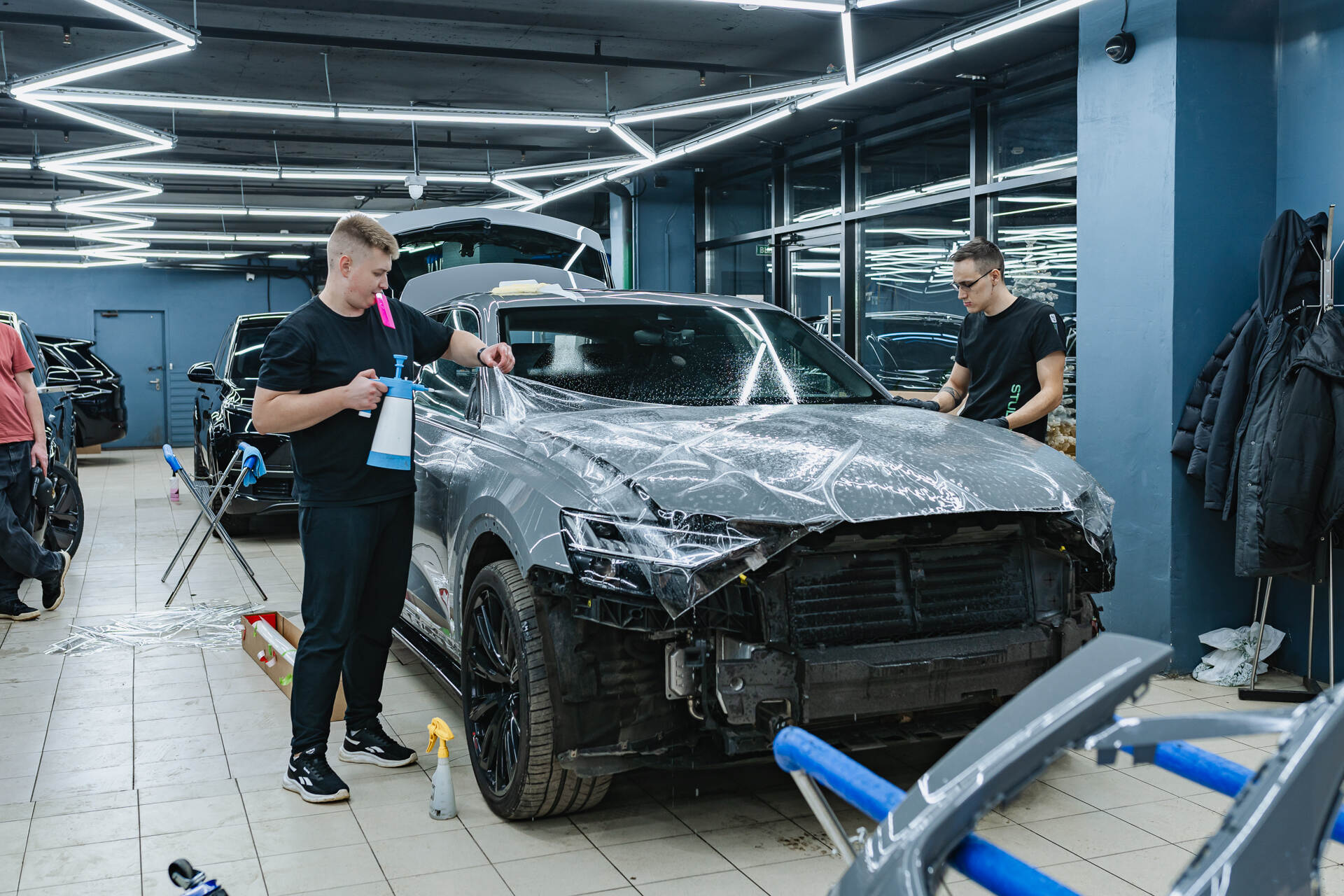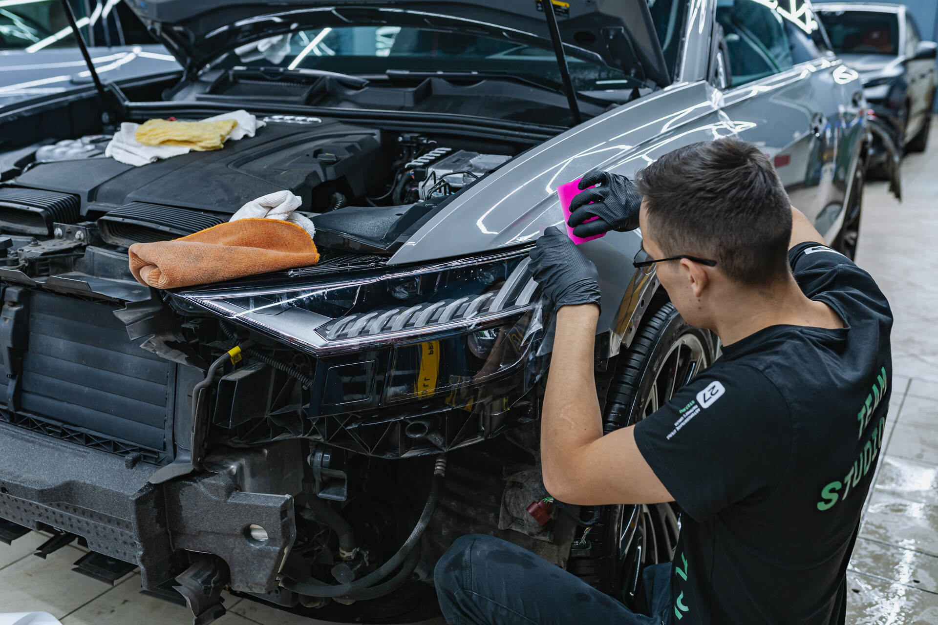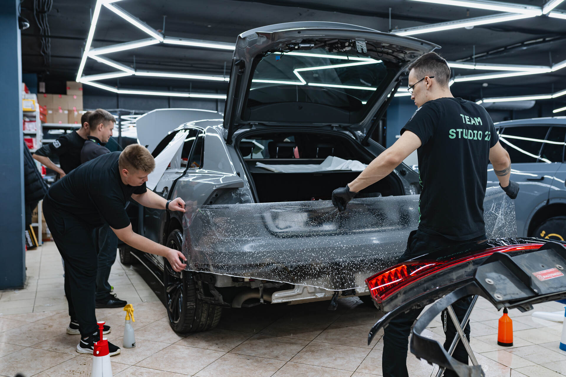 Бронирование кузова Audi Q8 полиуретаном занимает в среднем до трёх дней, включая обязательный этап подготовки, но опять же сроки работы мы всегда обсуждаем индивидуально в зависимости от загруженности цеха. В первую очередь мы тщательно очищаем и обезжириваем поверхности кузова, а при необходимости полируем их до идеального блеска для безупречной адгезии. Чтобы покрытие было максимально долговечным и визуально незаметным, мастера частично демонтируют кузовные элементы, что позволяет аккуратно завернуть края пленки внутрь. Такой профессиональный подход исключает отслоение материала и гарантирует эстетичный вид автомобиля после завершения всех работ.