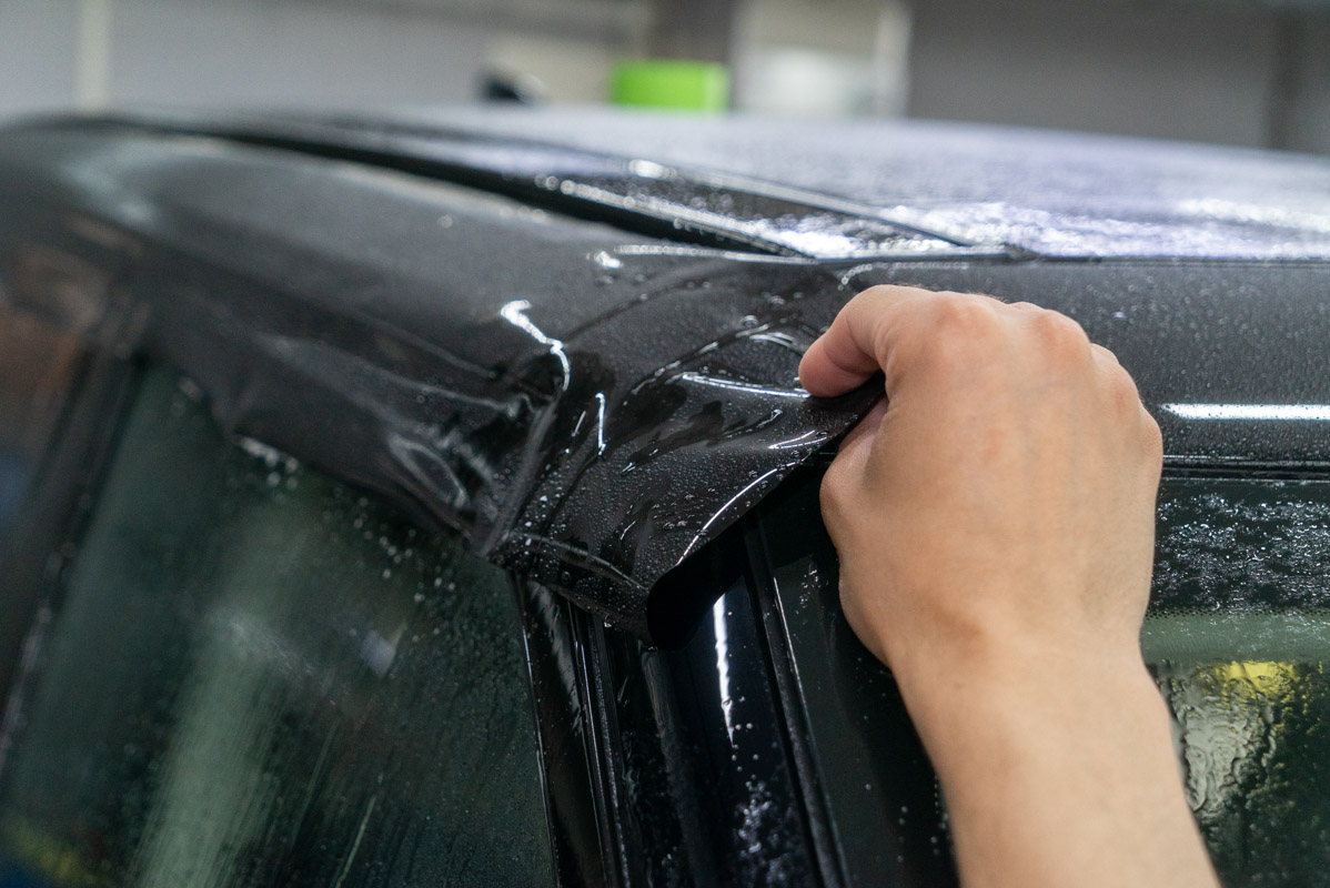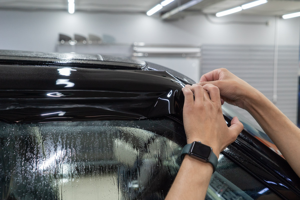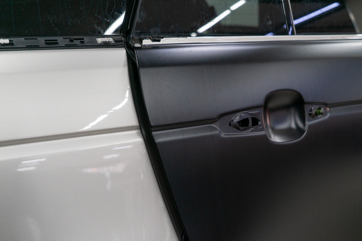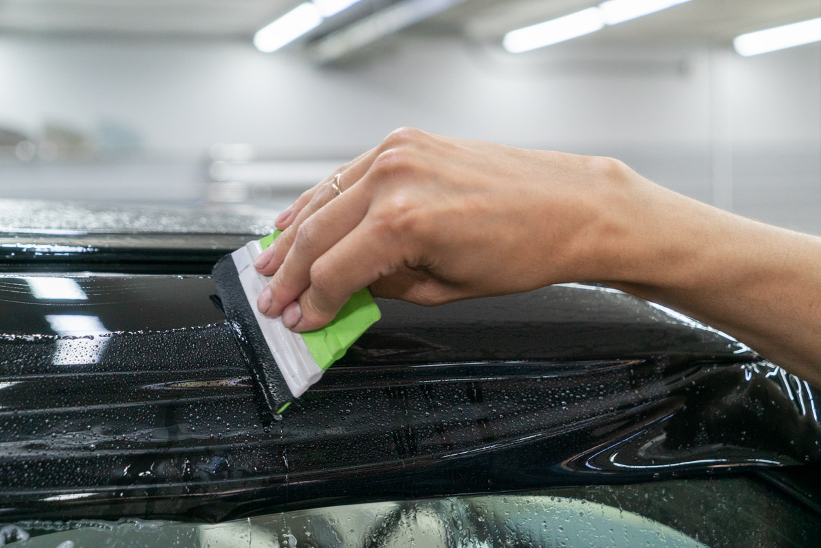 Оклейка Land Rover Range Rover матовым чёрным полиуретаном требует исключительной концентрации, поэтому на работу отводится минимум три дня с учетом загрузки цеха и сложности кузовных форм. Процесс начинается с тотальной очистки: автомобиль тщательно отмывают и обезжиривают специальными составами для достижения максимальной адгезии. При необходимости мастера полируют микродефекты, восстанавливая идеальную гладкость лака перед монтажом плёнки. На финальном этапе полиуретан наносится на поверхности, где специалист методично выгоняет остатки воздуха и влаги пластиковым ракелем. Такая скрупулезная техника гарантирует безупречное прилегание брони без пузырей и складок, обеспечивая бескомпромиссное качество защиты.