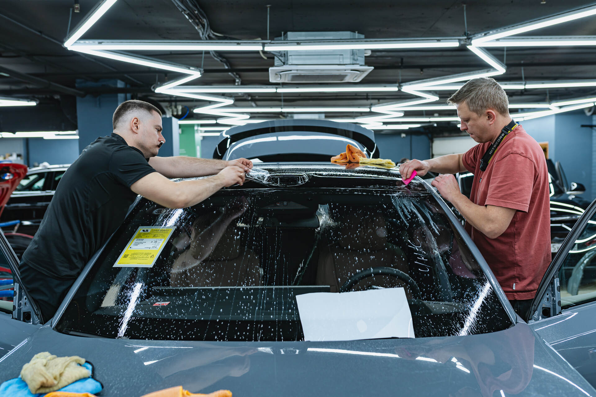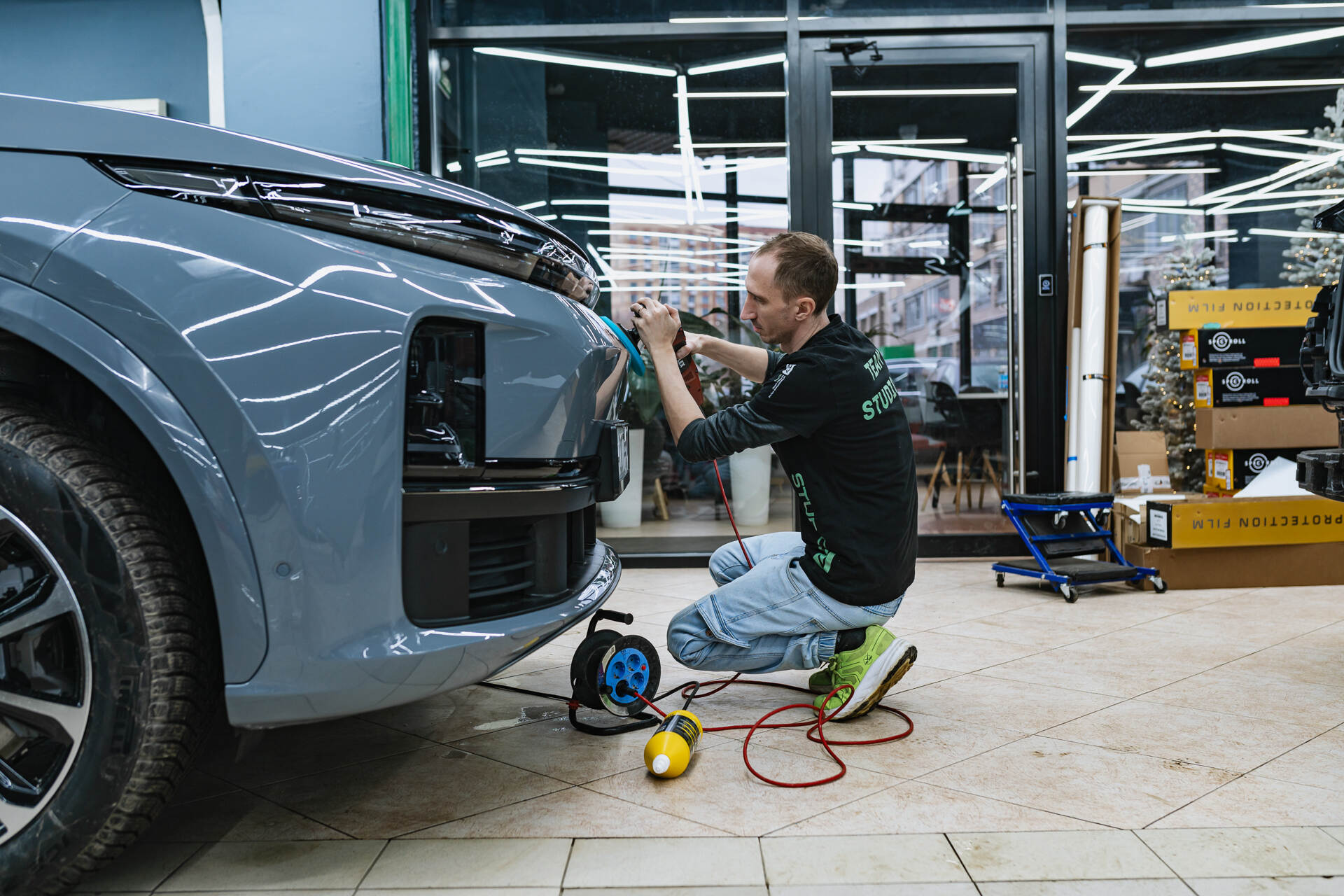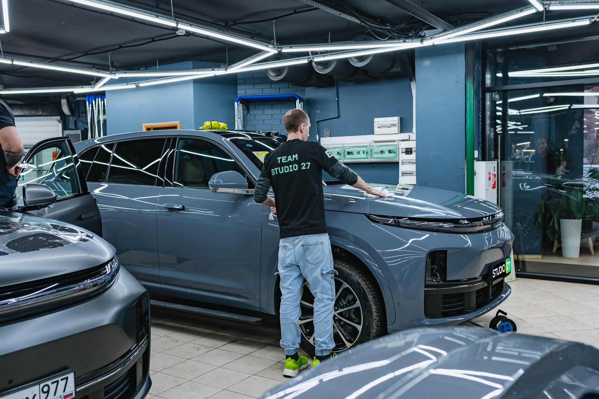 Подготовка к бронированию Lixiang L7 2025 Рестайлинг начинается с комплексной очистки и обезжиривания всех поверхностей. Если в ходе диагностики обнаруживаются мелкие дефекты или потертости, мы обязательно проводим локальную полировку этих зон. Далее мастера приступают к раскрою защитного полотна из рулона, подготавливая фрагменты нужного размера. Непосредственно перед нанесением на кузов материал обрабатывается мыльным раствором, который обеспечивает необходимую подвижность пленки для ее идеального позиционирования на кузове.
