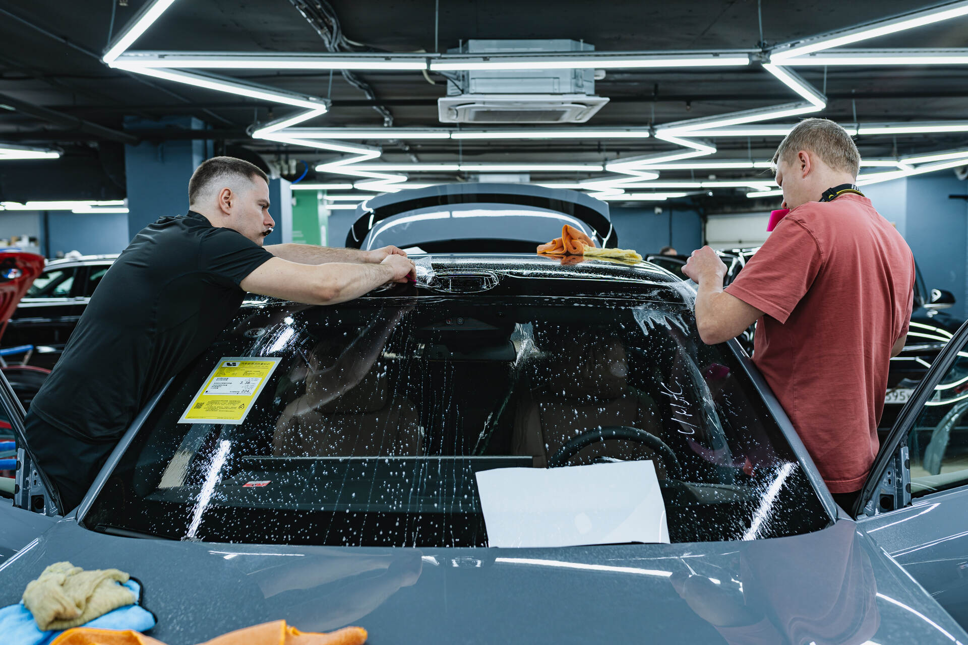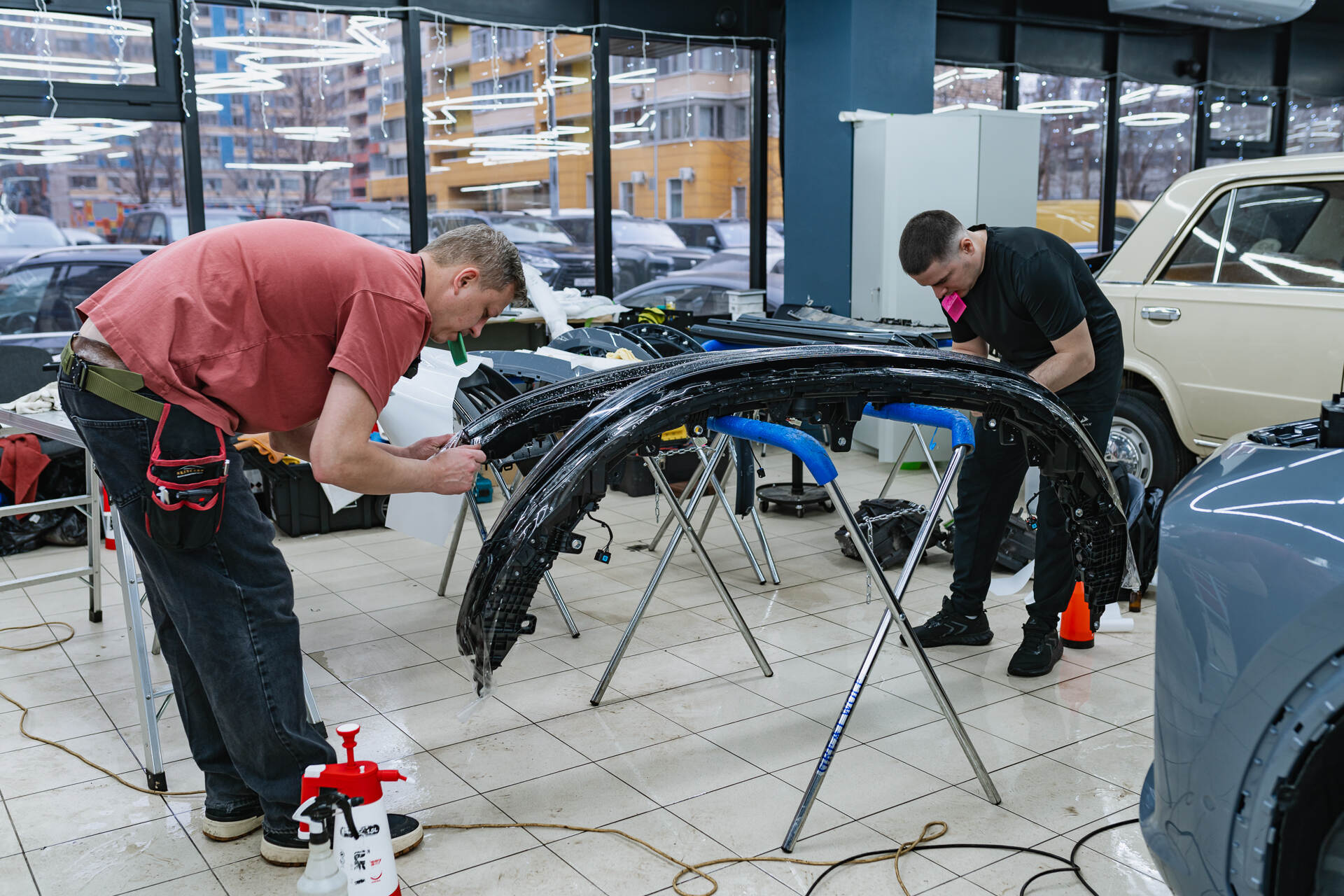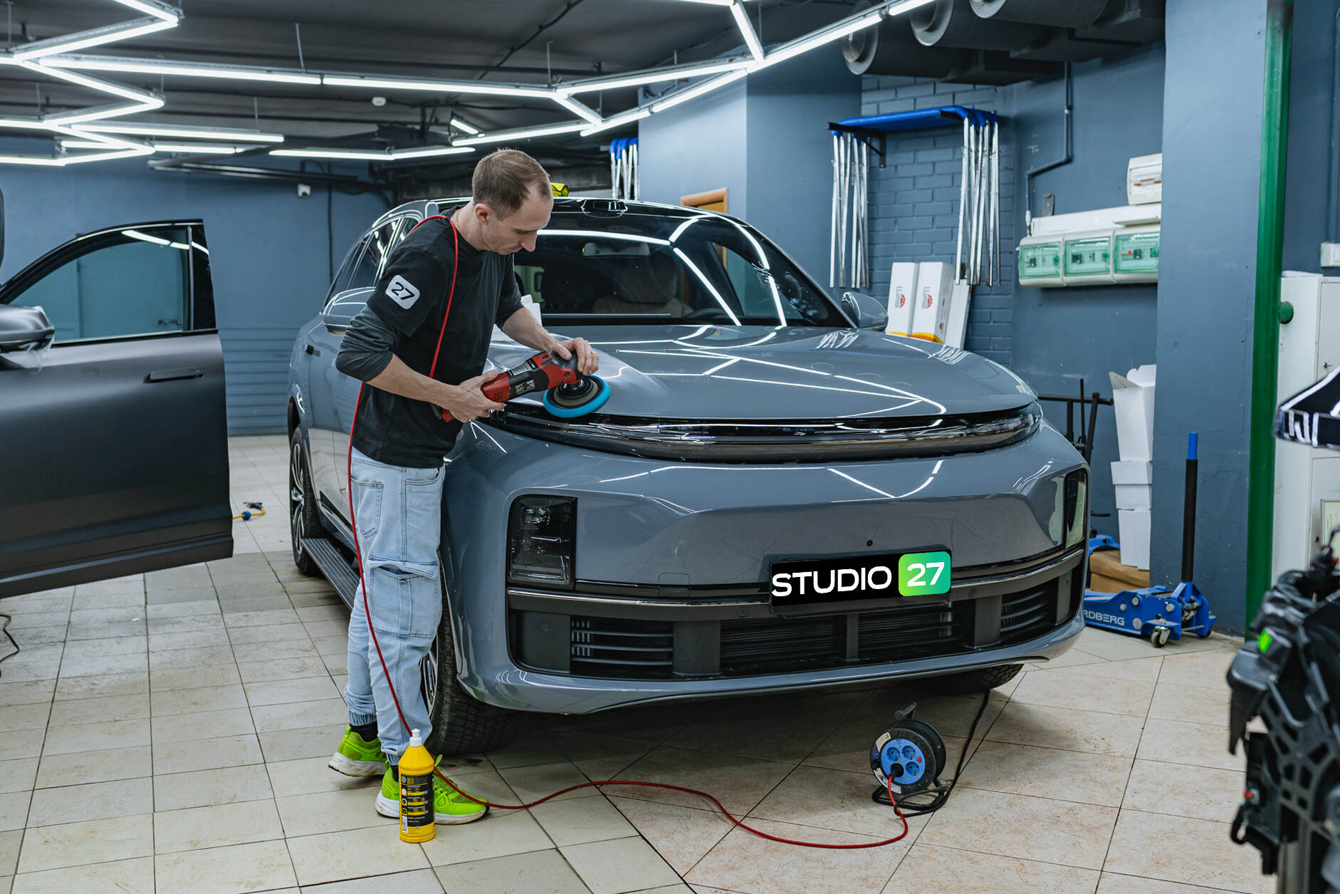 Подготовка к бронированию Lixiang L7 2025 Рестайлинг начинается с комплексной очистки и обезжиривания всех поверхностей. Если в ходе диагностики обнаруживаются мелкие дефекты или потертости, мы обязательно проводим локальную полировку этих зон. Далее мастера приступают к раскрою защитного полотна из рулона, подготавливая фрагменты нужного размера. Непосредственно перед нанесением на кузов материал обрабатывается мыльным раствором, который обеспечивает необходимую подвижность пленки для ее идеального позиционирования на кузове.