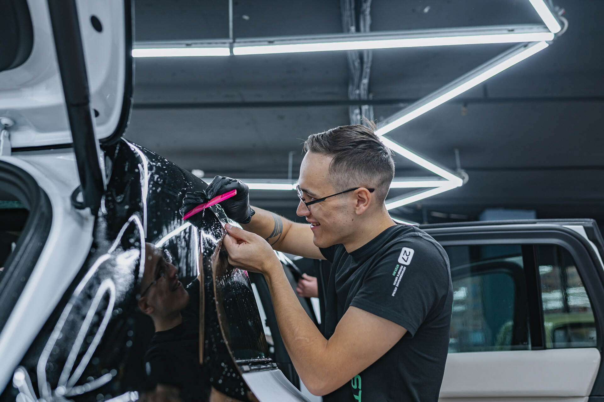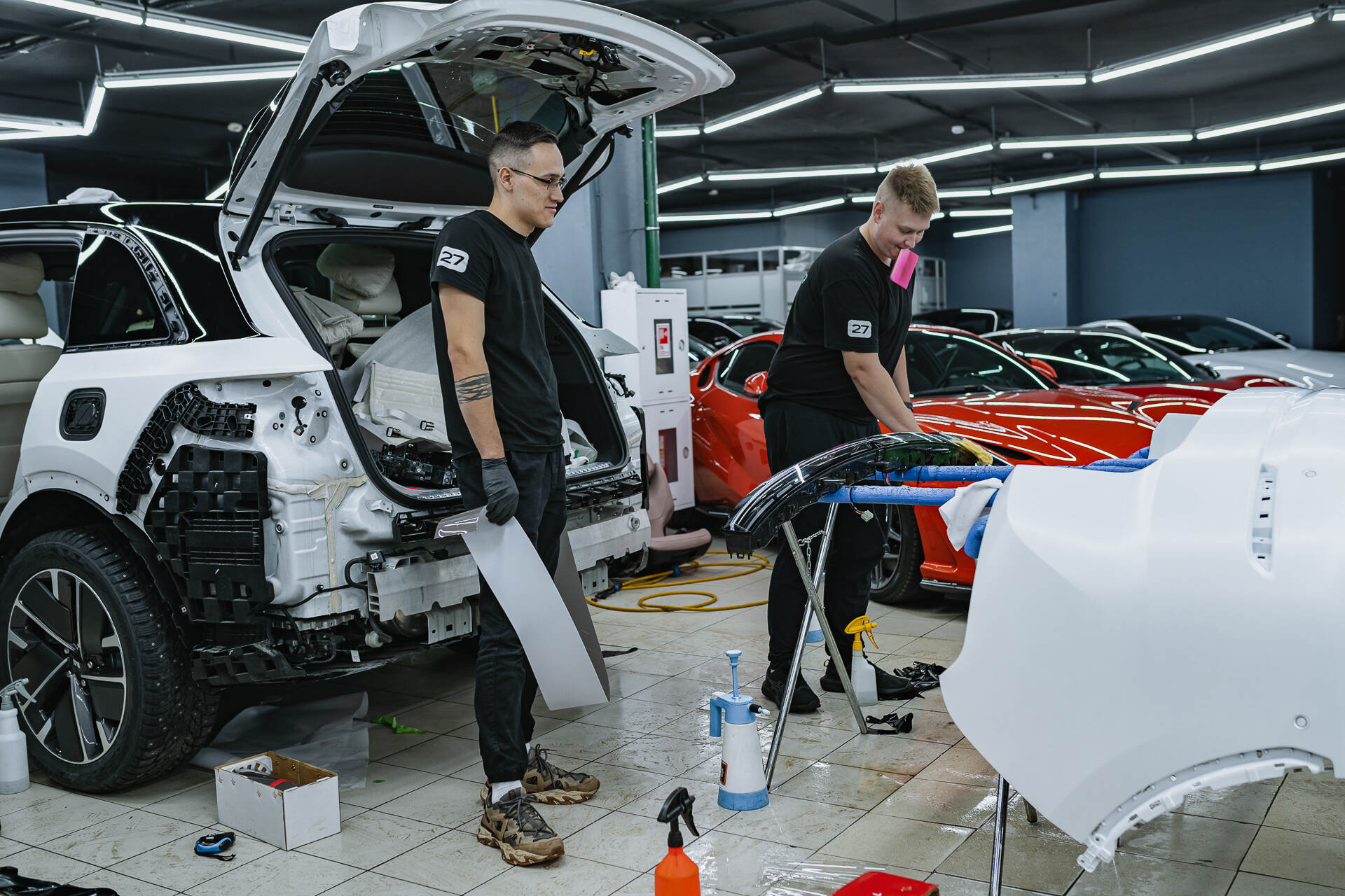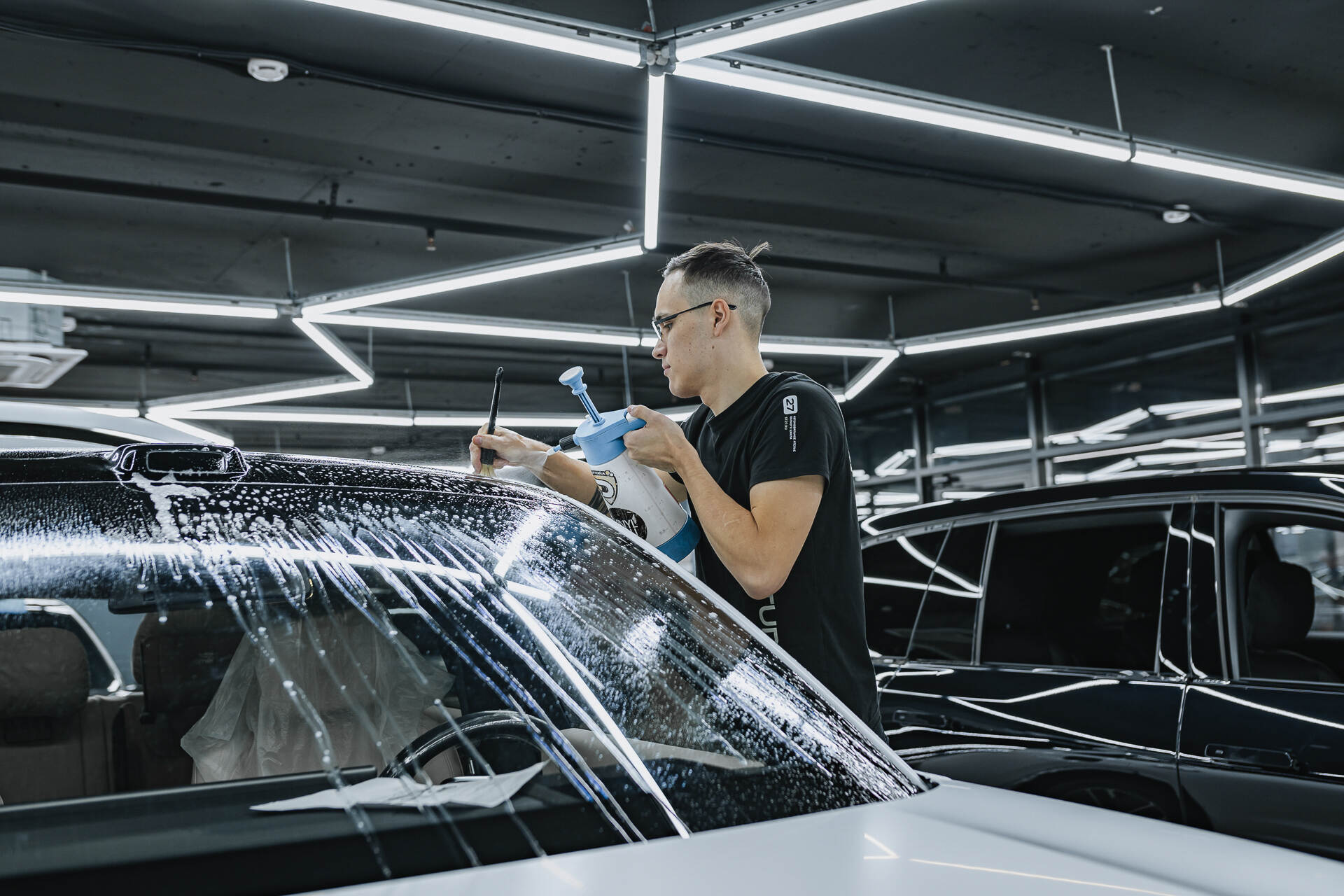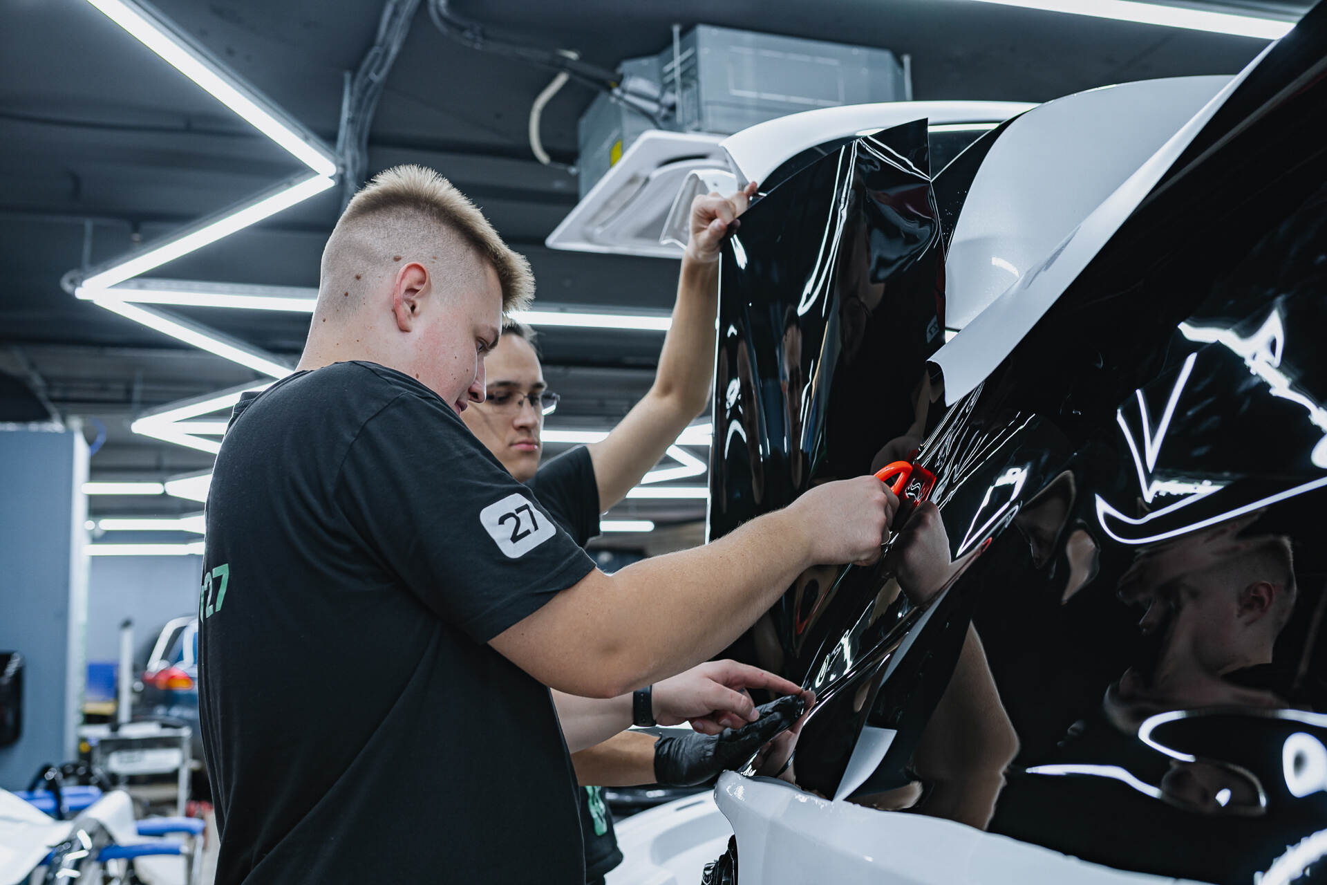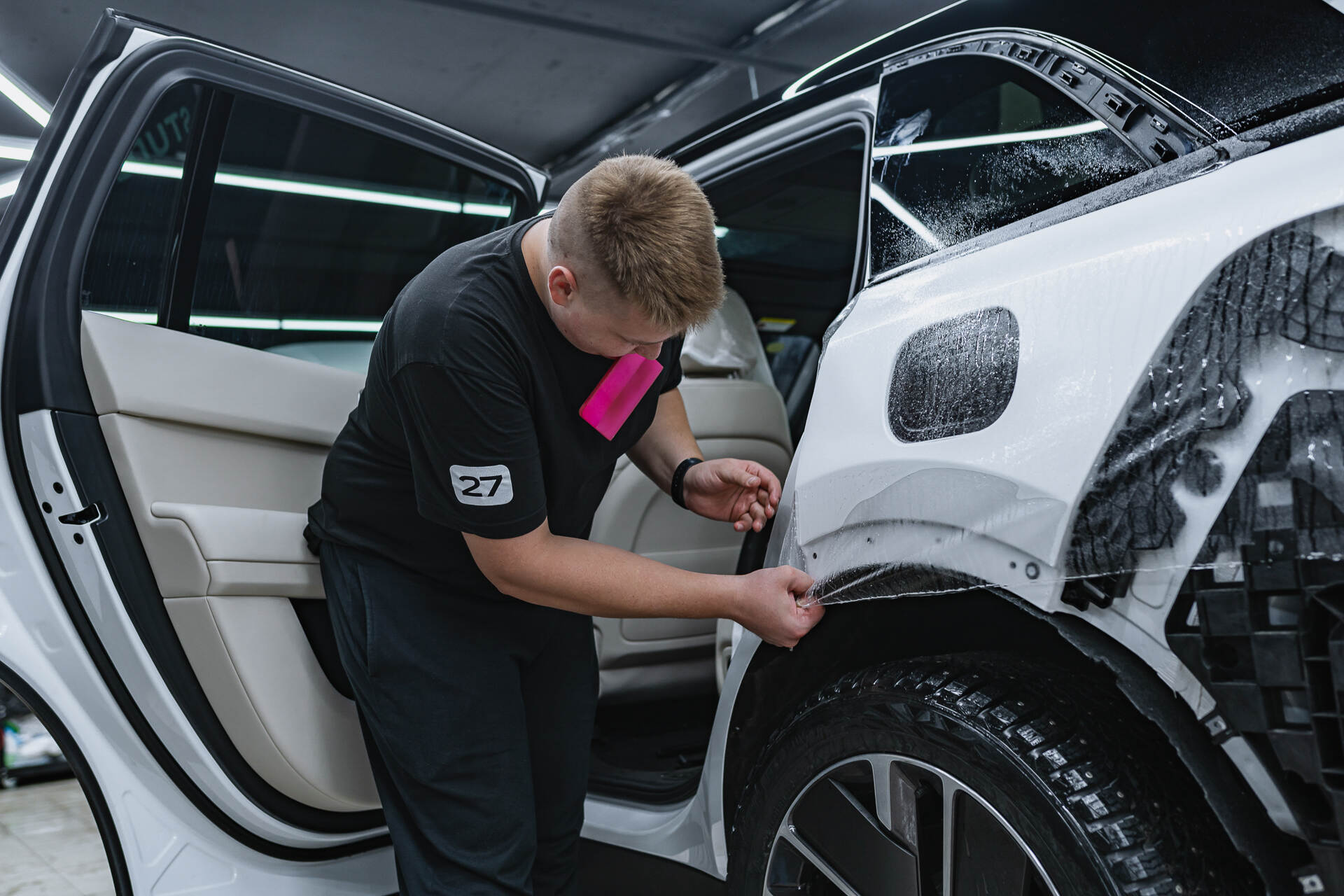 Комплексное бронирование Lixiang L7 2025 Рестайлинг матовым покрытием снизу и чёрным глянцем сверху — это премиальная услуга, гарантирующая безупречную сохранность экстерьера на долгие годы. По времени обычно мы закладываем около трёх дней, но сроки могут варьироваться исходя из загруженности цеха. Работа начинается с глубокой очистки и обезжиривания всех поверхностей кузова для идеальной адгезии, плюс мы в обязательном порядке частично разбираем автомобиль для удобства работы. Подготовленные полотна плёнки, смоченные мыльным раствором, с усилием натягиваются на части кузова и тщательно разглаживаются ракелем. В ходе этого процесса мастер полностью удаляет воздушные складки и остатки влаги, обеспечивая максимально плотное прилегание материала. Такая технология нанесения гарантирует эстетичный вид матовой фактуры и исключительную долговечность защитного слоя.