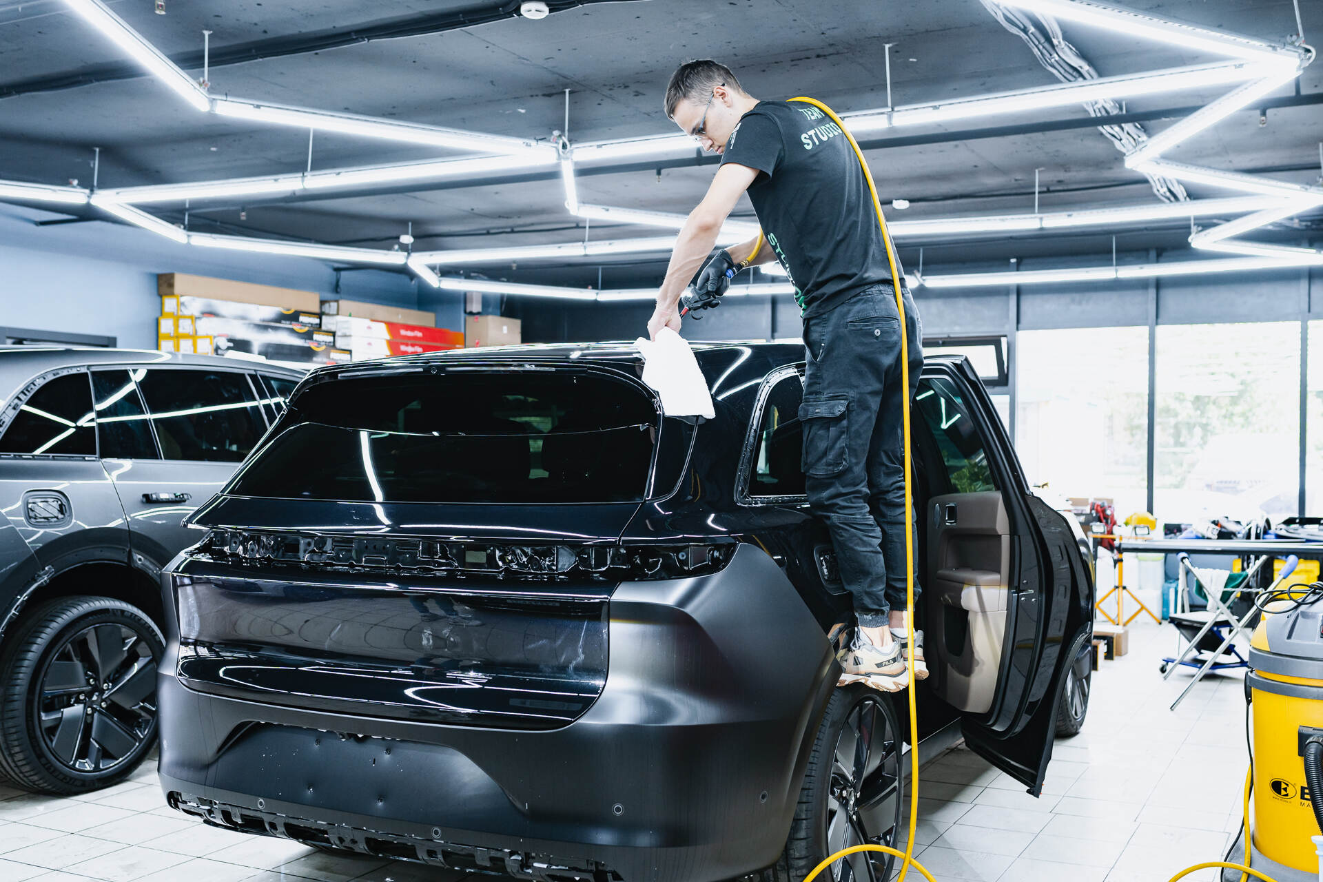 От применения дешевой китайской пленки мы настоятельно рекомендуем воздержаться. В отличие от сертифицированного полиуретанового материала, она обладает ограниченным сроком службы: со временем желтеет под воздействием ультрафиолета, подвержена образованию царапин, а ее толщины недостаточно для эффективной защиты. Американская пленка Spectroll Premium Matte, в свою очередь, сохраняет первоначальные характеристики на протяжении многих лет, не нуждаясь в замене или специальном обслуживании. Нанесение матового защитного покрытия на Lixiang L7 — это трудоемкий процесс, требующий скрупулезного подхода; в работу закладывается не менее трех дней, при этом точные сроки нашими менеджерами всегда согласовываются с клиентом индивидуально.