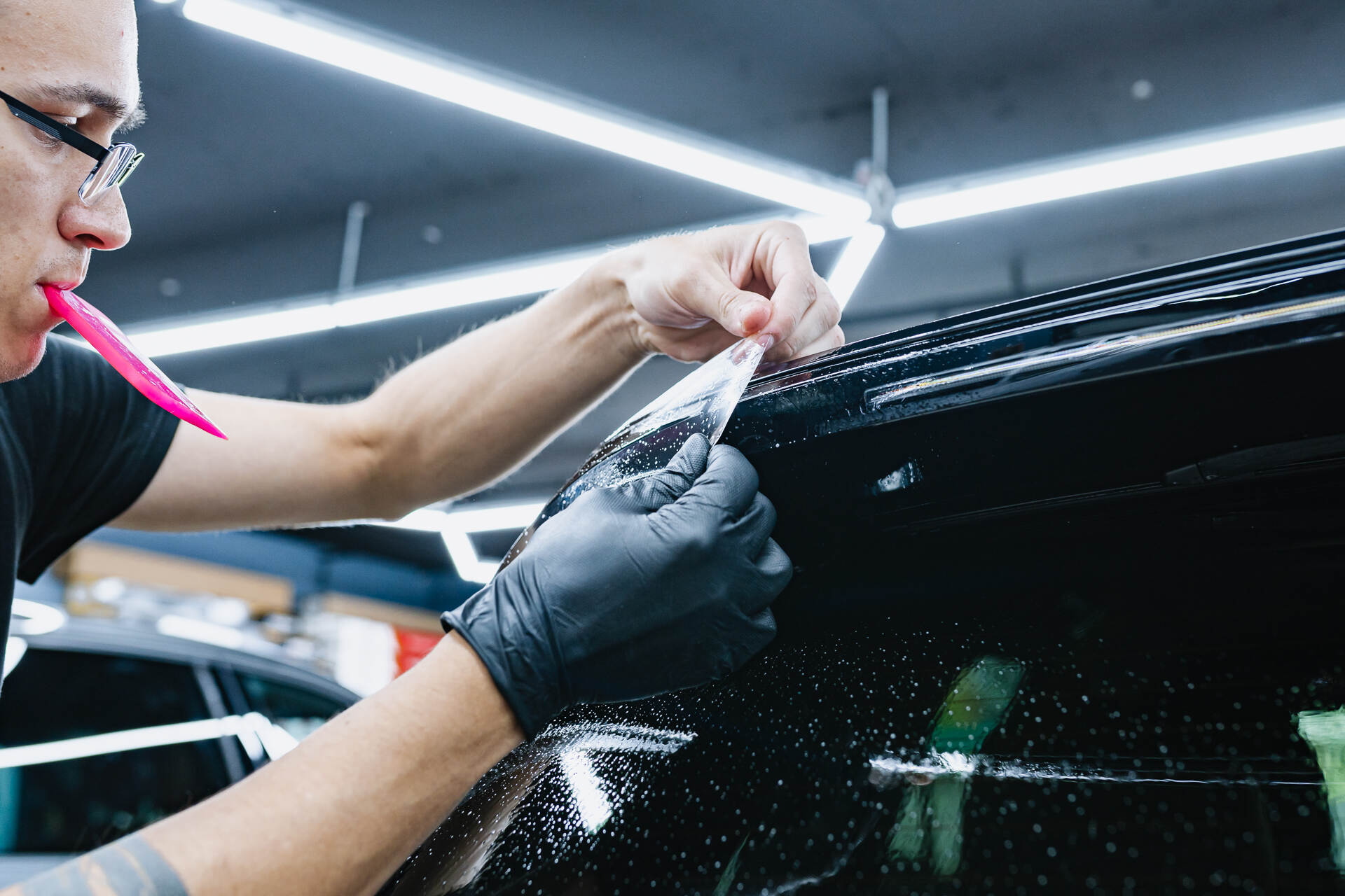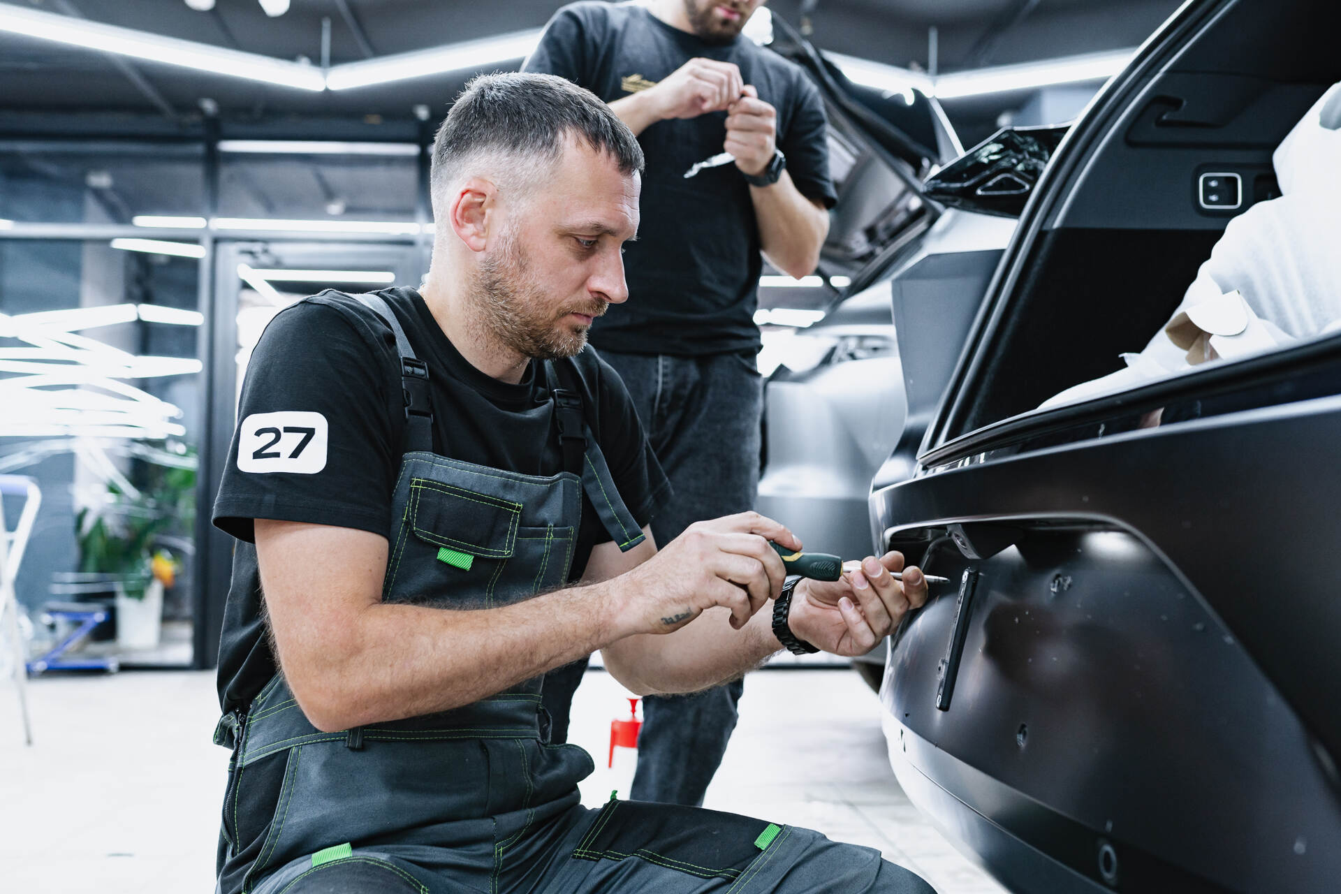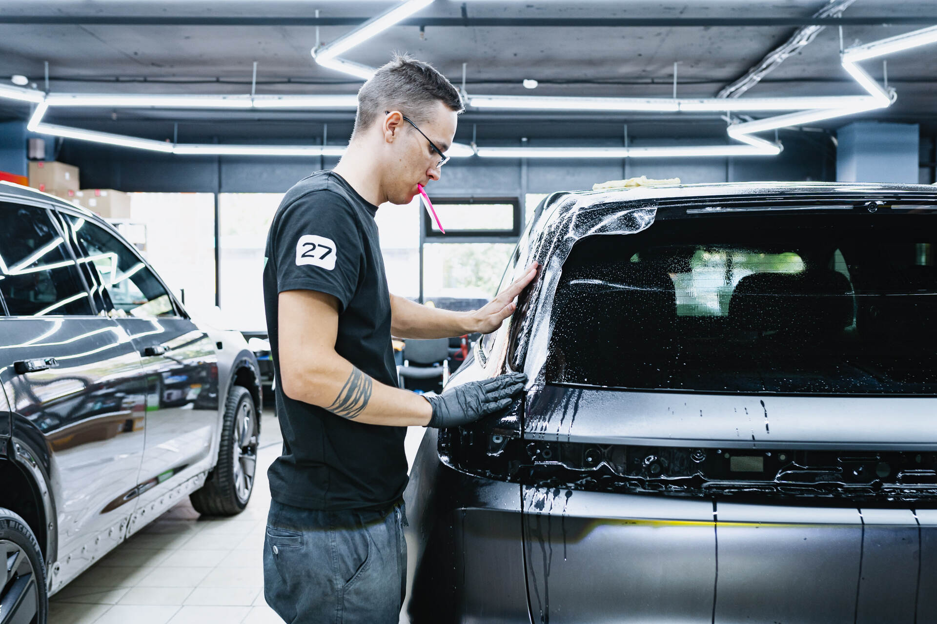 Подготовка кузова представляет собой многоэтапный процесс: поверхность тщательно очищается от пыли, загрязнений и остатков предыдущих покрытий. Специализированные составы полностью удаляют жировые следы, создавая идеальные условия для адгезии пленки. При выявлении незначительных дефектов выполняется локальная полировка для восстановления безупречной гладкости. Поклейка пленки осуществляется на увлажненную основу с последующим выравниванием ракелем, который устраняет воздушные пузыри и выводит из-под пленки излишки влаги, обеспечивая безупречное прилегание без складок.