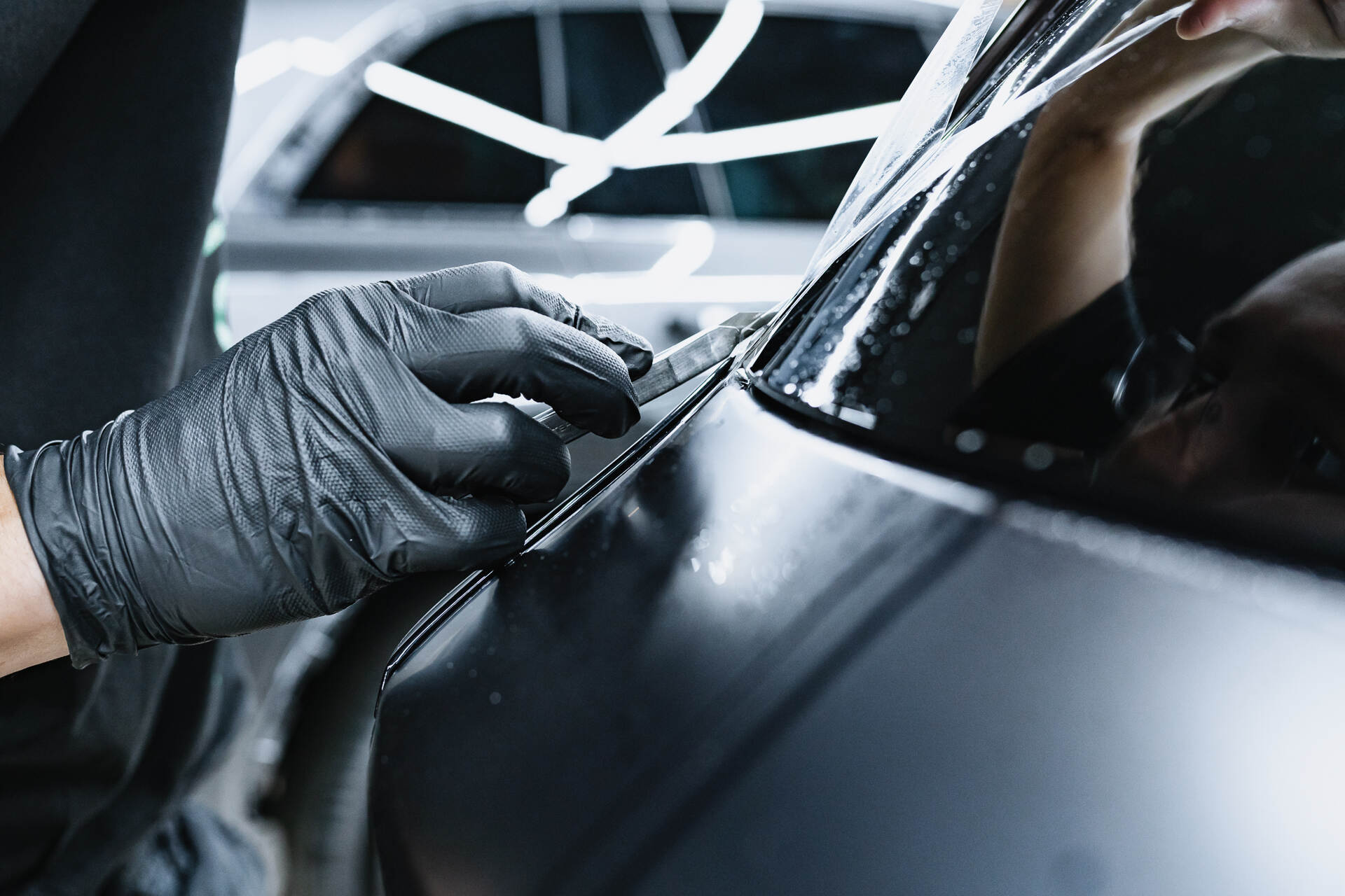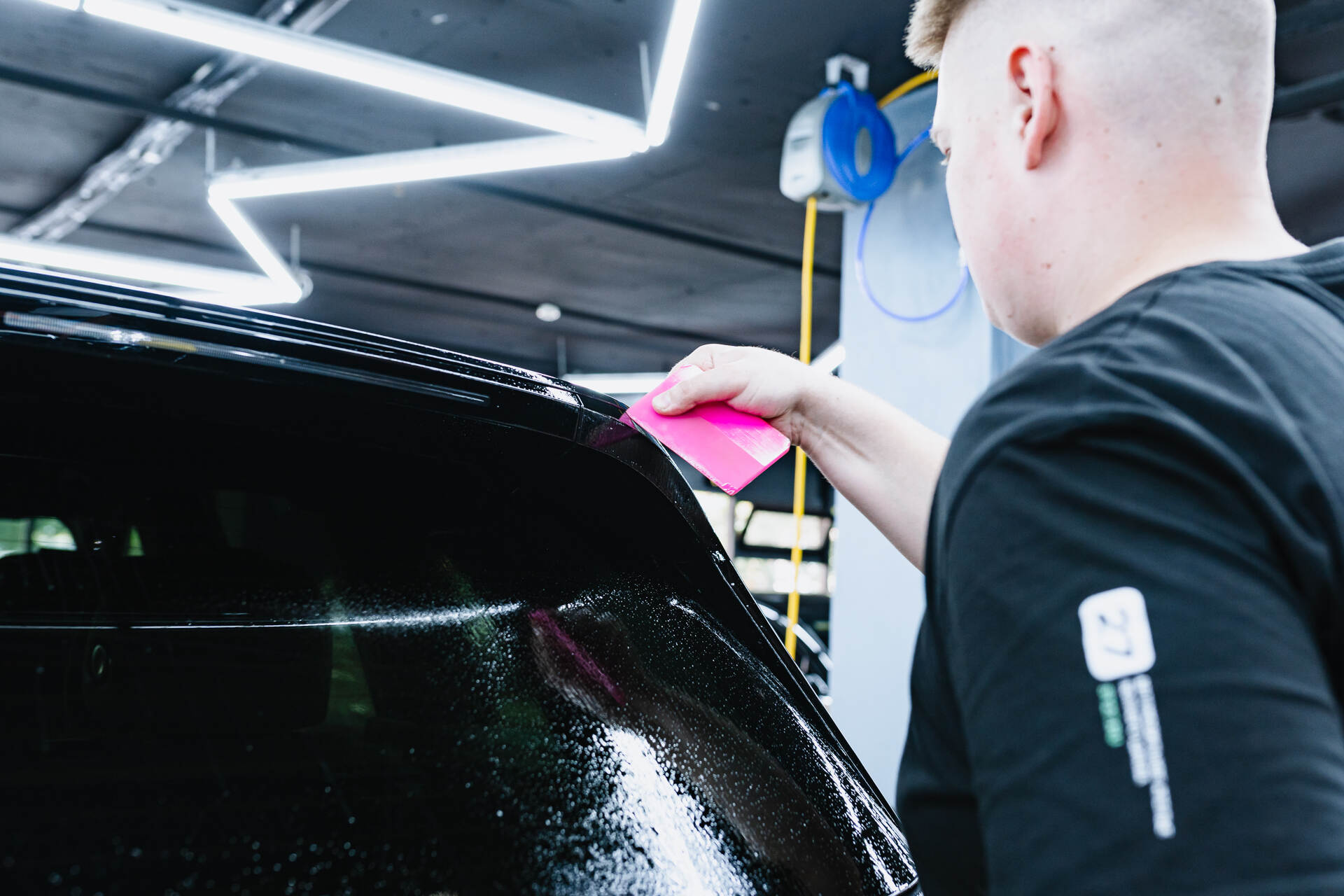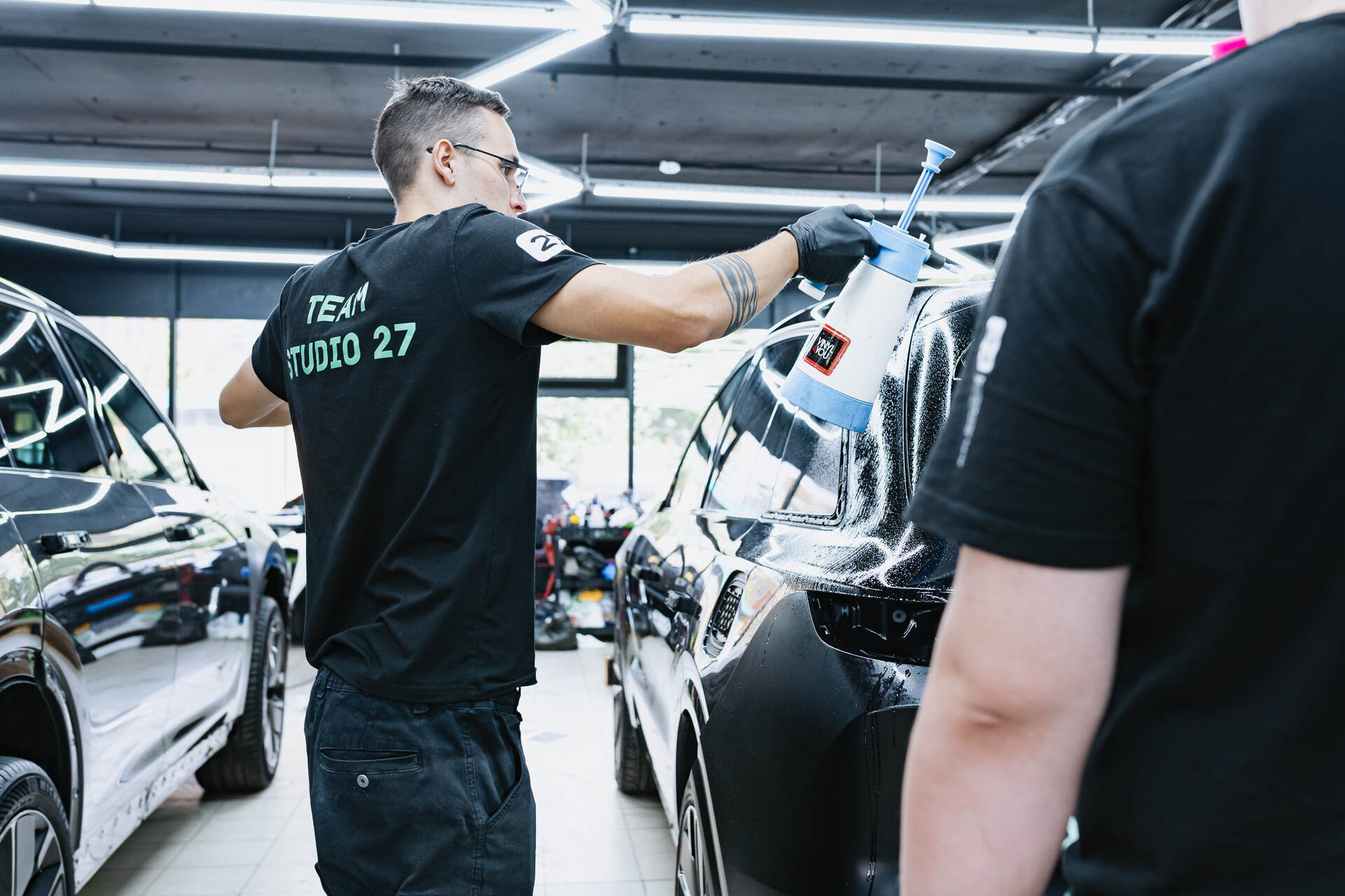 Подготовка кузова представляет собой многоэтапный процесс: поверхность тщательно очищается от пыли, загрязнений и остатков предыдущих покрытий. Специализированные составы полностью удаляют жировые следы, создавая идеальные условия для адгезии пленки. При выявлении незначительных дефектов выполняется локальная полировка для восстановления безупречной гладкости. Поклейка пленки осуществляется на увлажненную основу с последующим выравниванием ракелем, который устраняет воздушные пузыри и выводит из-под пленки излишки влаги, обеспечивая безупречное прилегание без складок.