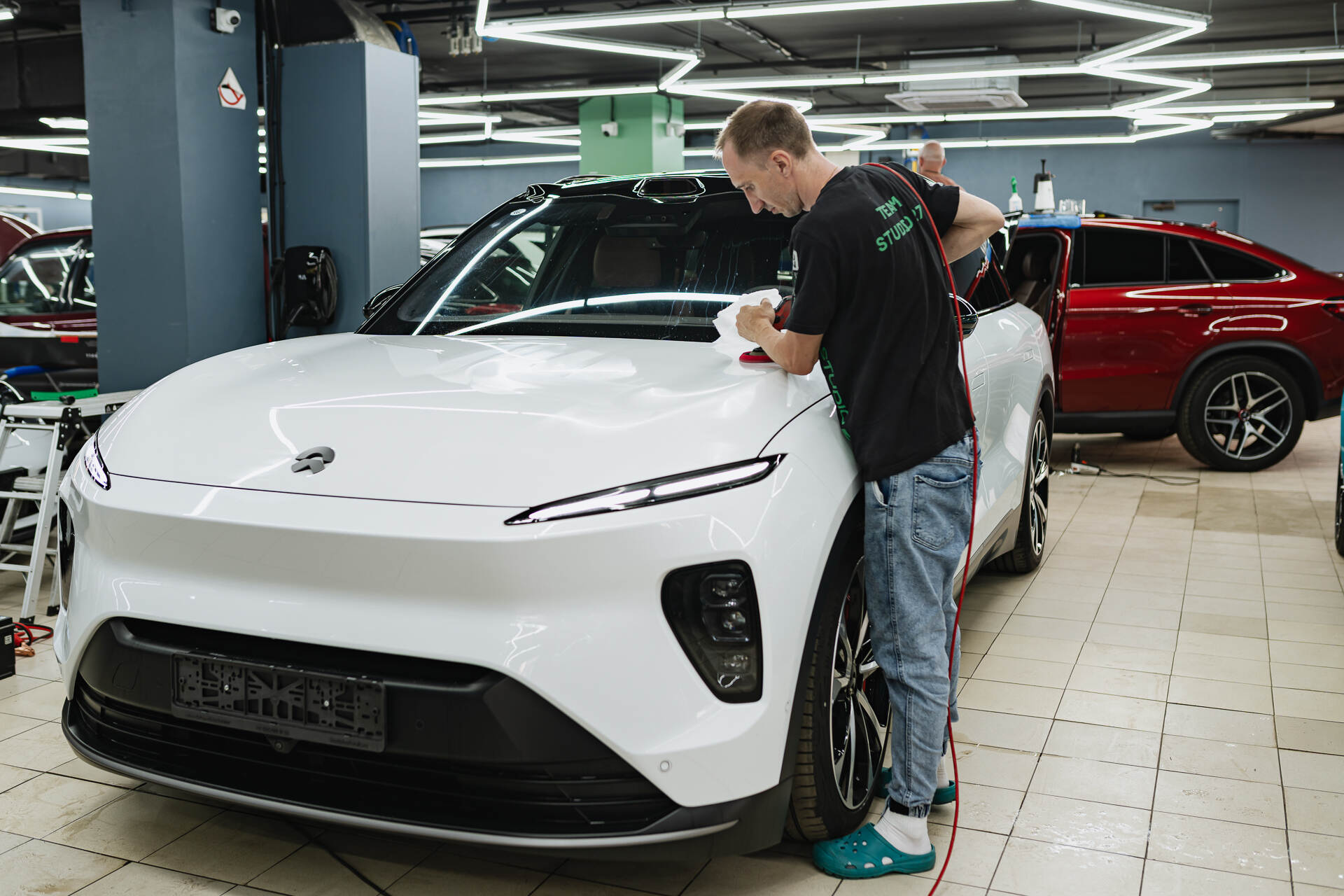 В нашу детейлинг-студию поступил новенький китайский автомобиль NIO ES8 для полной оклейки защитной пленкой. Владелец выбрал этот метод как наиболее эффективный способ уберечь лакокрасочное покрытие от абразивного воздействия дорожного мусора и камней. Без такой брони «отбойная часть» кузова быстро покрывается сетью мелких дефектов, что недопустимо для автомобиля подобного статуса. Мы гарантируем, что после процедуры оклейки NIO ES8 сохранит свой безупречный вид, оставаясь невосприимчивым к агрессивному влиянию пескоструя на трассе на долгое время.