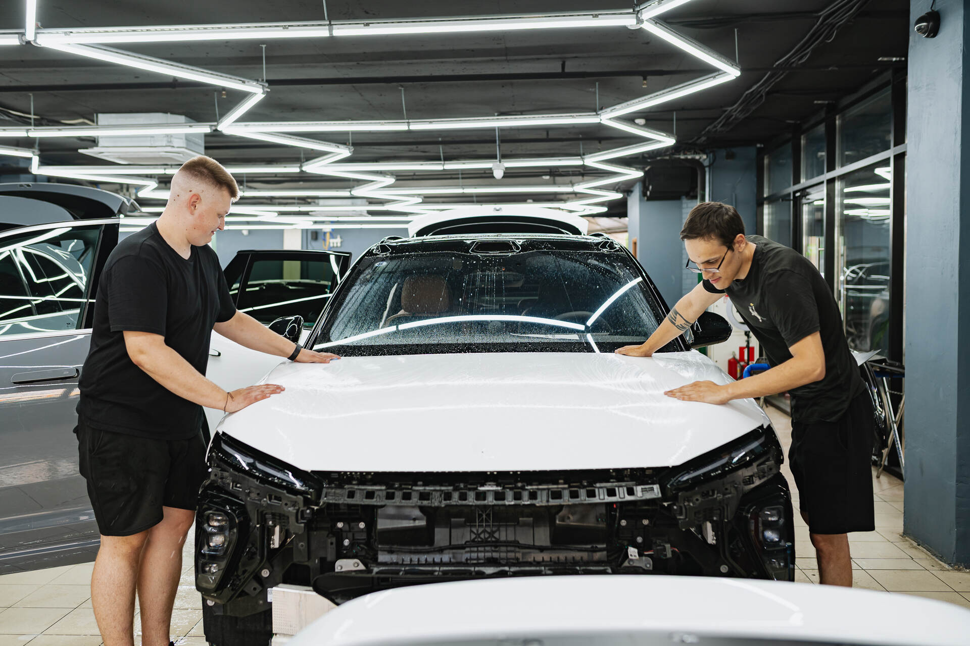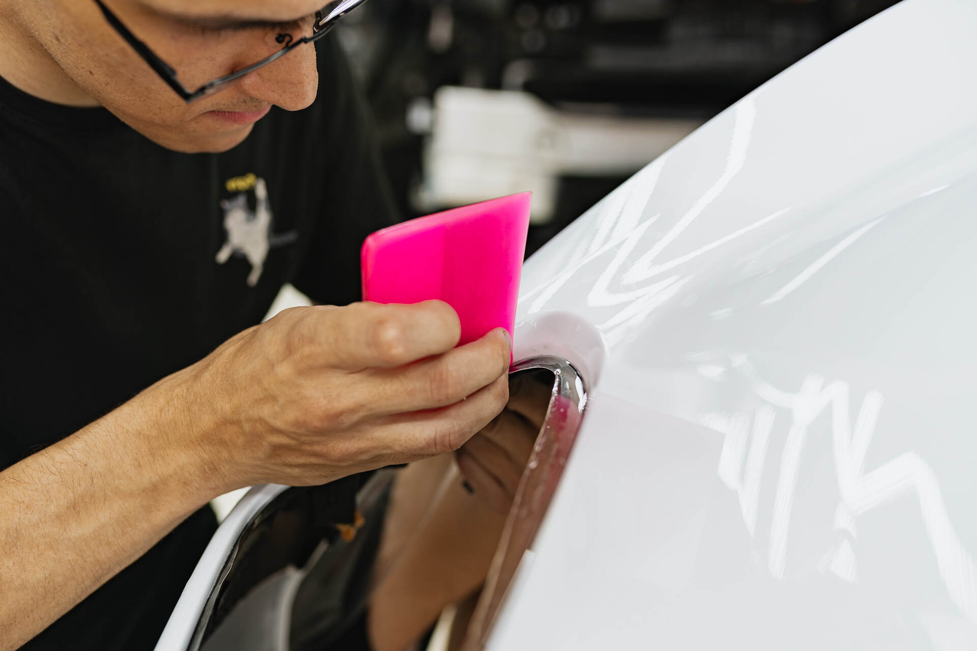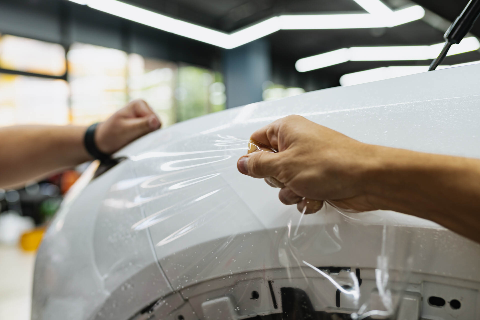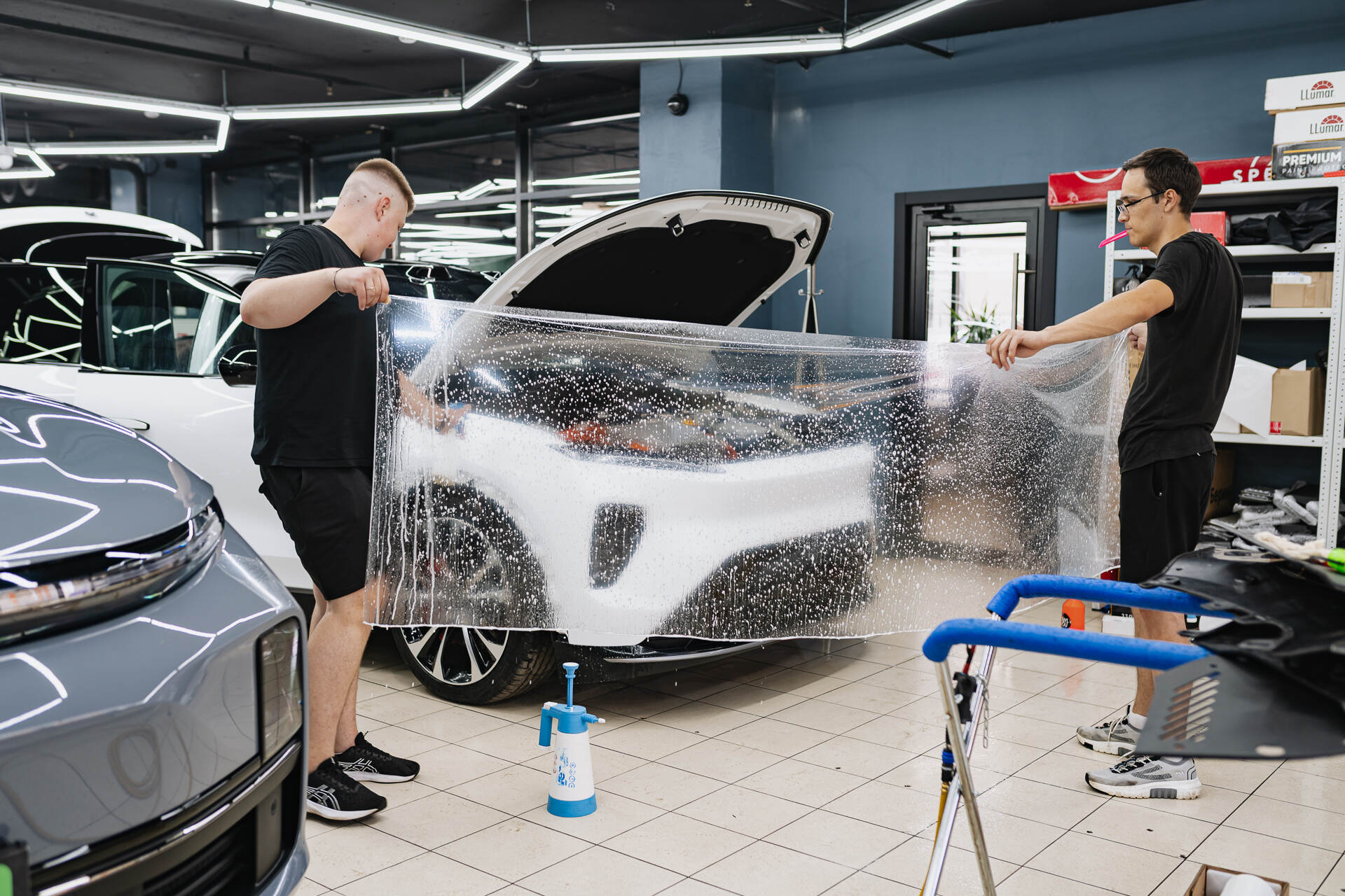 Для безупречного результата мы используем предварительно вырезанные фрагменты, которые мастера ювелирно подгоняют по месту. Работа лезвием требует предельной концентрации, чтобы гарантированно исключить малейший риск повреждения заводской краски. Завершается процесс обязательной термической усадкой: под воздействием промышленного фена полиуретан обретает эластичность и идеально облегает сложные формы кузова. Такая температурная обработка позволяет материалу и поверхности автомобиля стать единым целым, создавая эстетичную и сверхпрочную защитную броню. Благодаря точному позиционированию заготовок плёнки и финальному прогреву, покрытие ложится без изъянов, в точности повторяя каждую линию дизайна.