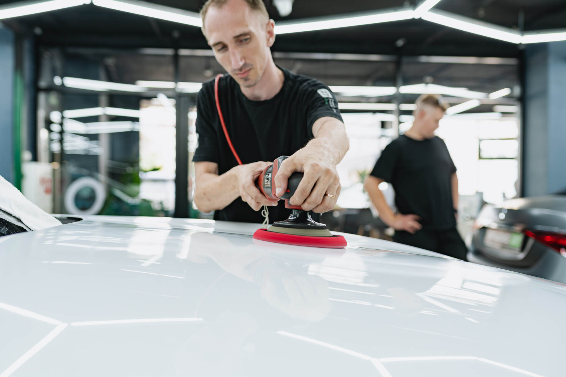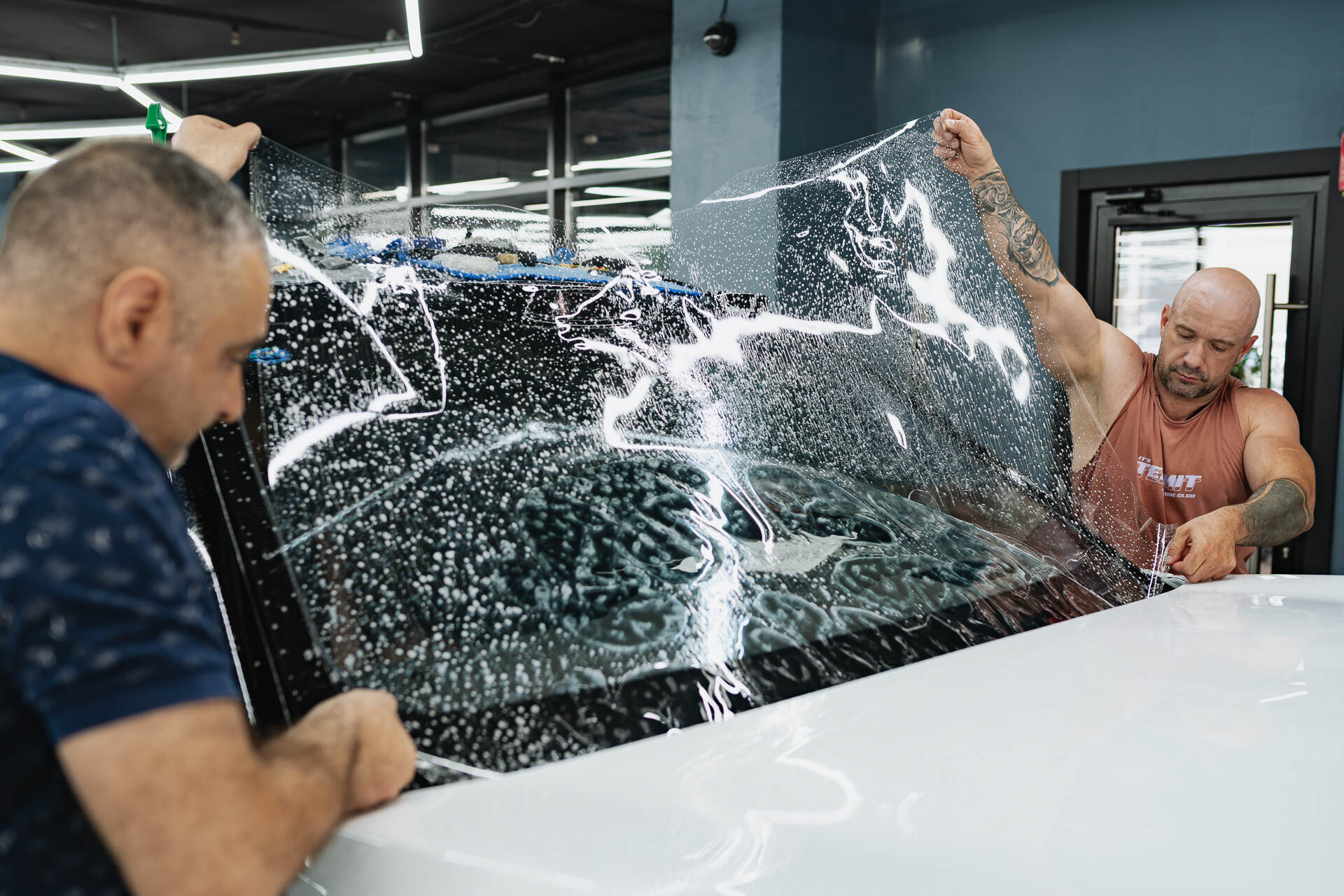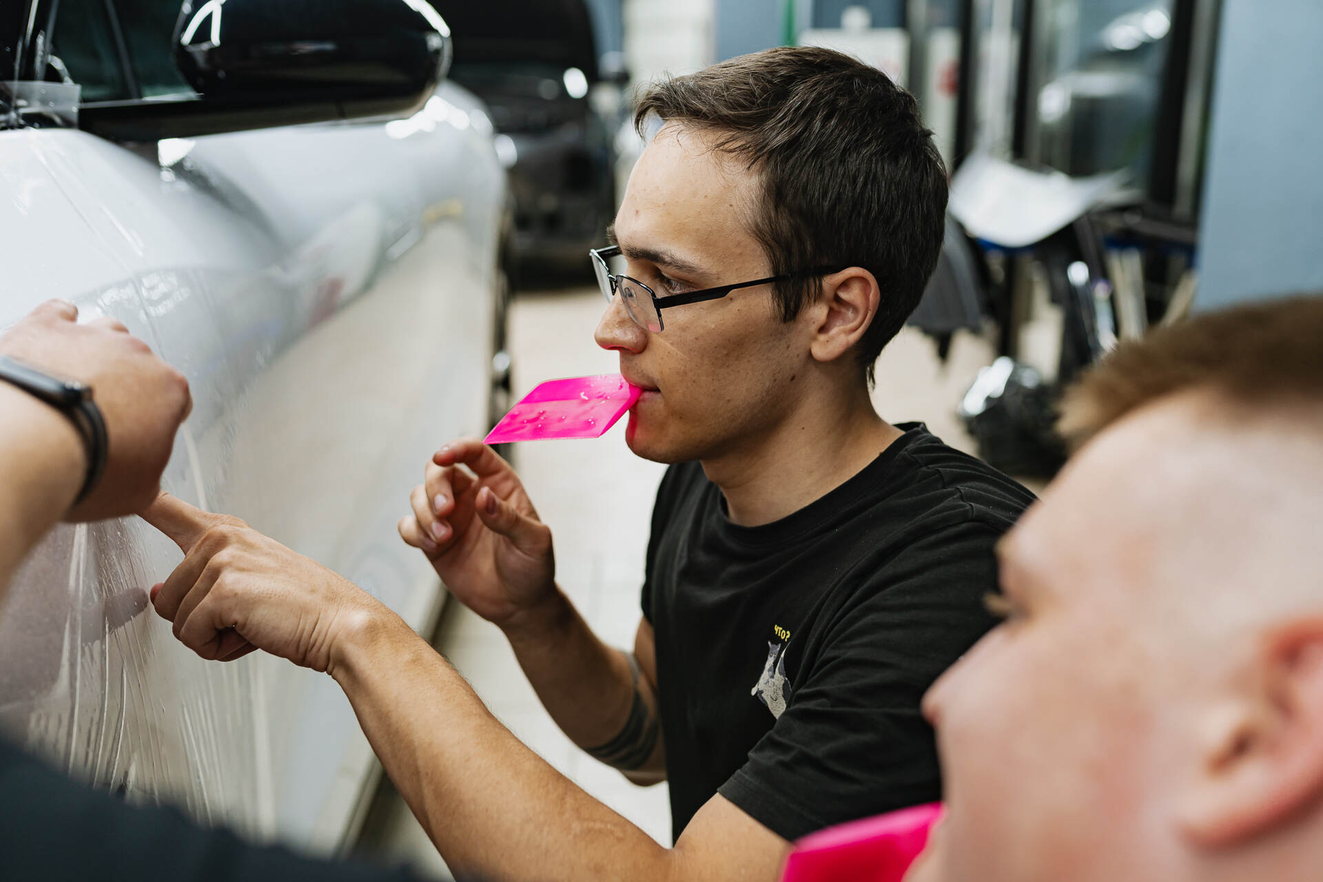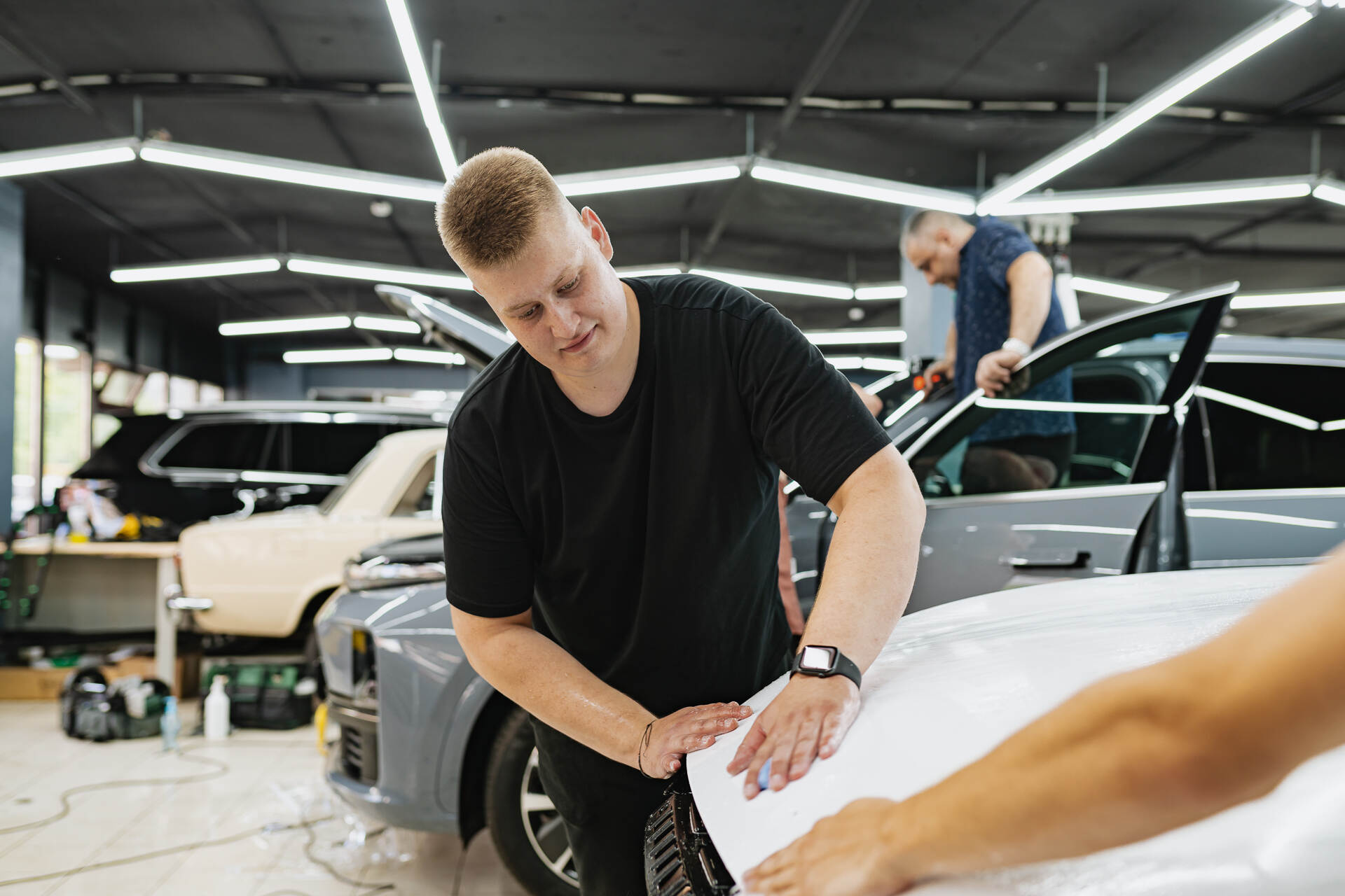 Для безупречного результата мы используем предварительно вырезанные фрагменты, которые мастера ювелирно подгоняют по месту. Работа лезвием требует предельной концентрации, чтобы гарантированно исключить малейший риск повреждения заводской краски. Завершается процесс обязательной термической усадкой: под воздействием промышленного фена полиуретан обретает эластичность и идеально облегает сложные формы кузова. Такая температурная обработка позволяет материалу и поверхности автомобиля стать единым целым, создавая эстетичную и сверхпрочную защитную броню. Благодаря точному позиционированию заготовок плёнки и финальному прогреву, покрытие ложится без изъянов, в точности повторяя каждую линию дизайна.