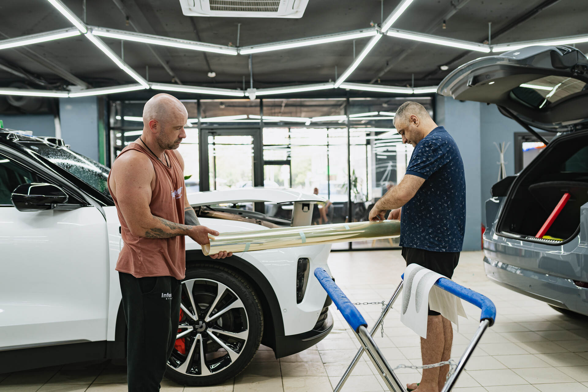 Бронирование кузова NIO ES8 — это трудоемкий процесс, на который мы закладываем 2-3 дня, требующий ювелирной точности на каждом этапе. Работа начинается с комплексной подготовки поверхностей: мастера проводят глубокую очистку, обезжиривание и полировку лака для устранения микродефектов и обеспечения идеальной адгезии. Далее мы разбираем кузов для удобства работы, а сама технология оклейки кузова подразумевает предварительный раскрой полотна строго по форме кузовных элементов и его обработку мыльным раствором. Влажная пленка аккуратно позиционируется на деталях, после чего специалист с помощью ракеля методично вытесняет остатки влаги и воздуха. Такая скрупулезная техника разглаживания позволяет полностью исключить появление складок или пузырей, гарантируя монолитное и незаметное защитное покрытие.