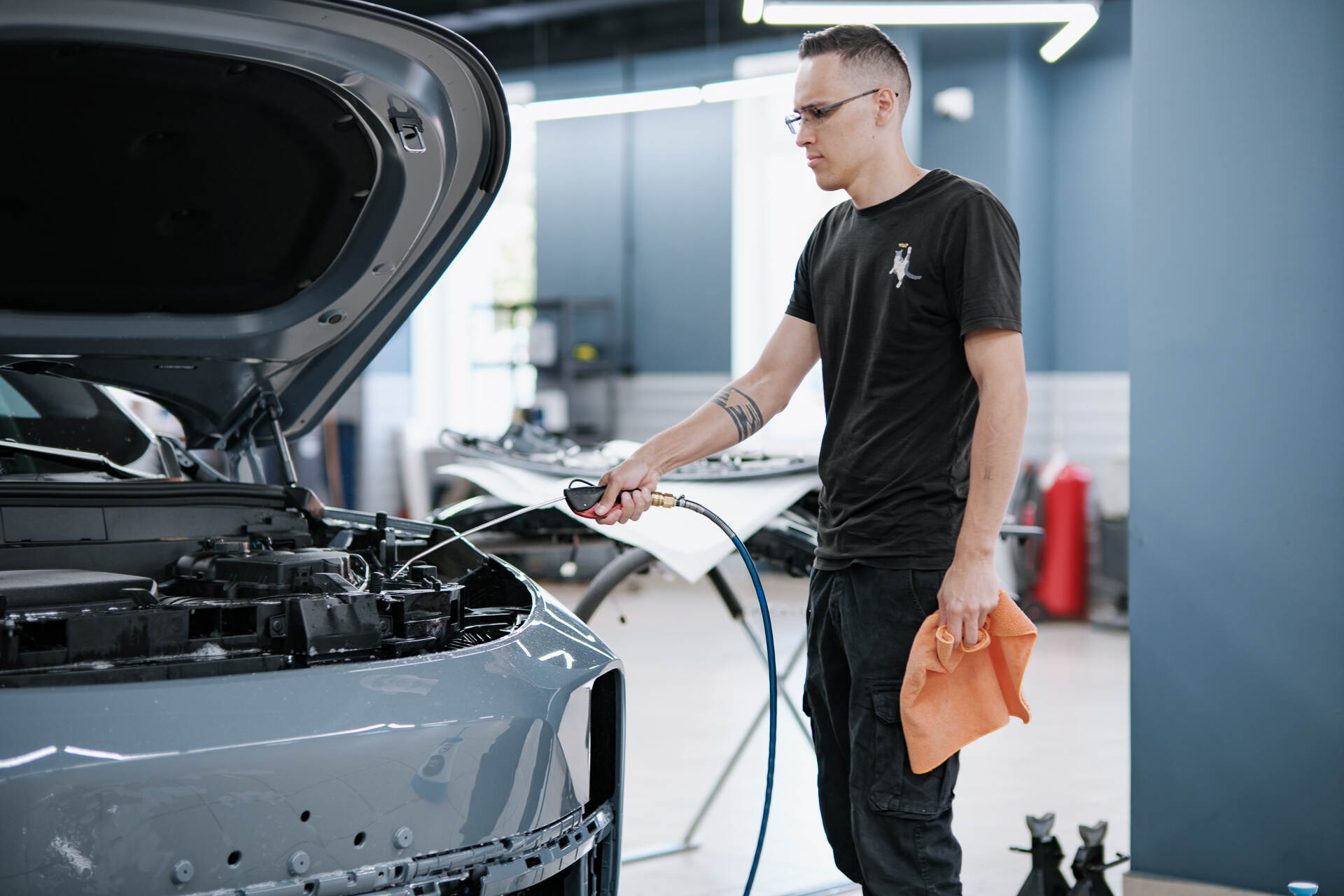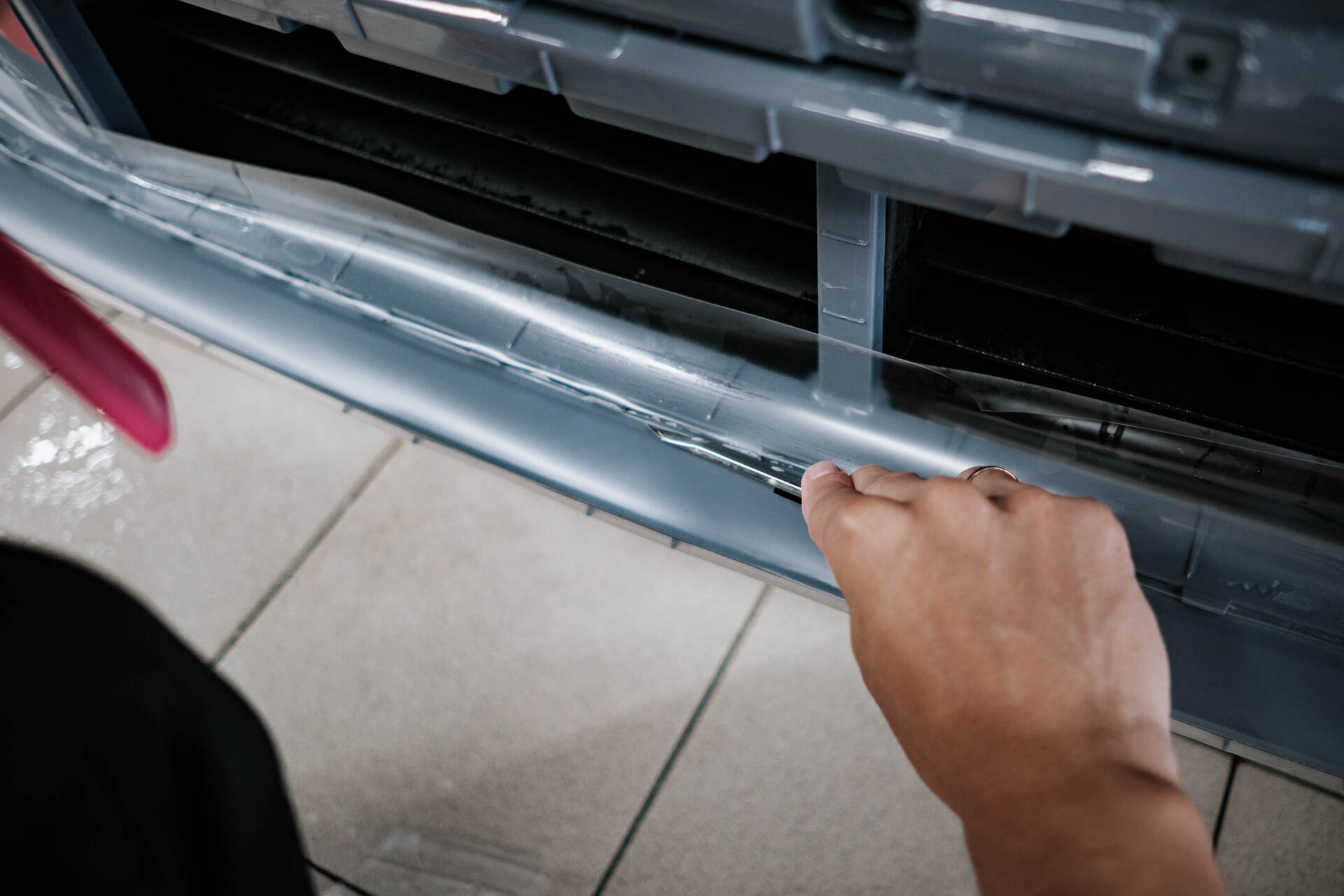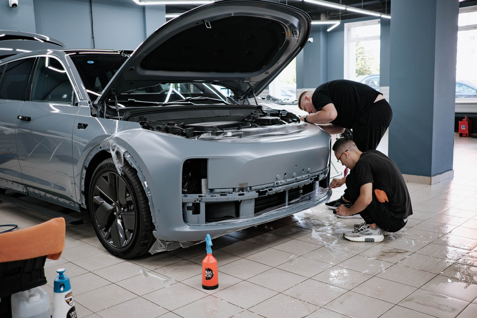 Лишние куски плёнки мы срезаем прямо на автомобиле лезвием, но не стоит переживать – следов не останется, так как наши мастера профессионалы своего дела. Для финального закрепления результата мы используем промышленный фен: термическая обработка заставляет полиуретан точно повторить сложный рельеф кузова Lixiang L7 Blue Grey, формируя с ним единую защитную систему. Такое полное бронирование консервирует первозданный экстерьер на долгие годы, сохраняя эстетику нового автомобиля. Примечательно, что пленка Spectroll Premium Matte допускает многократную полировку, позволяя владельцу возвращать покрытию идеальный лоск без вреда для самой защиты. В итоге автомобиль получает не только надежный барьер от внешних угроз, но и возможность поддерживать безупречный вид на протяжении всего срока эксплуатации.