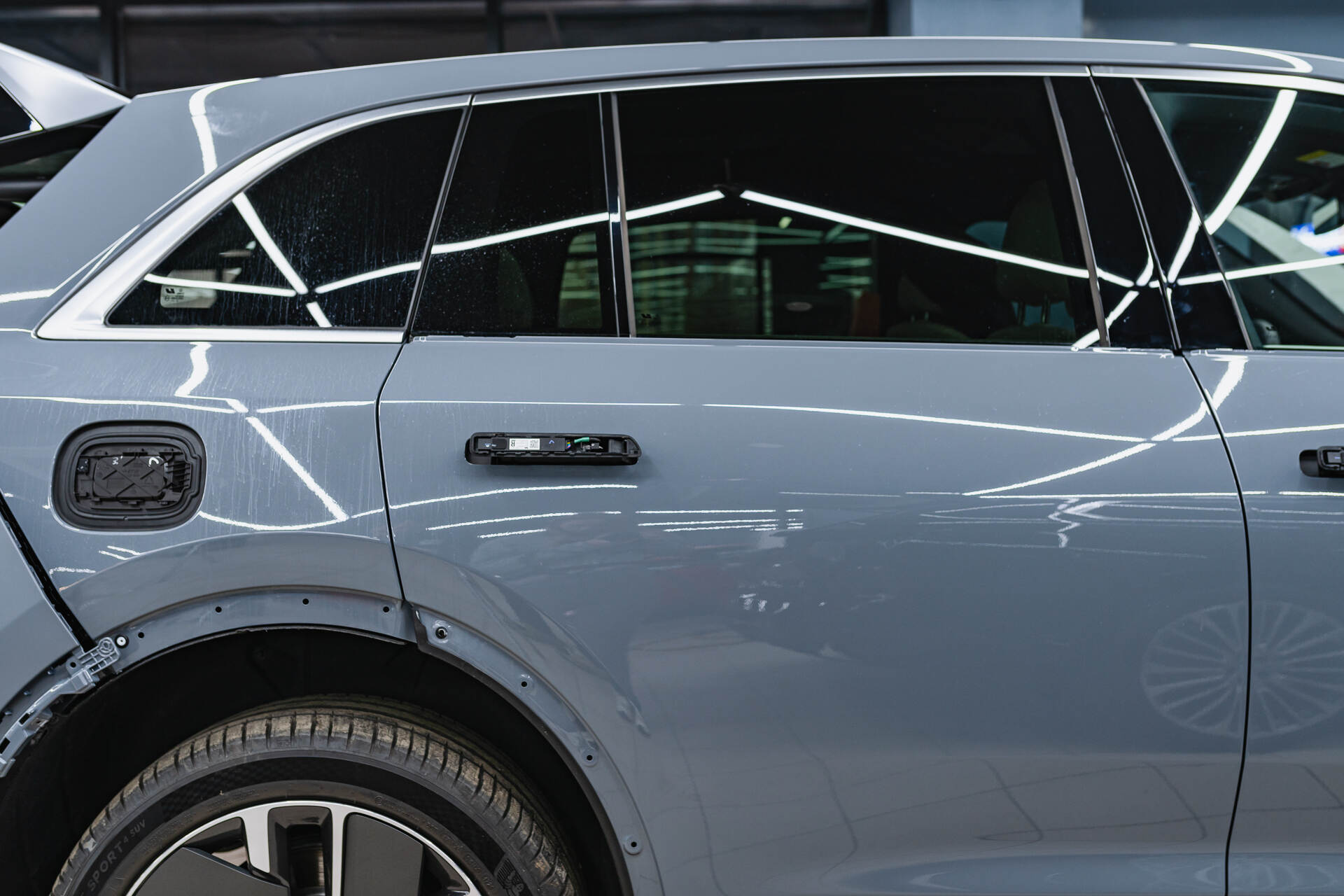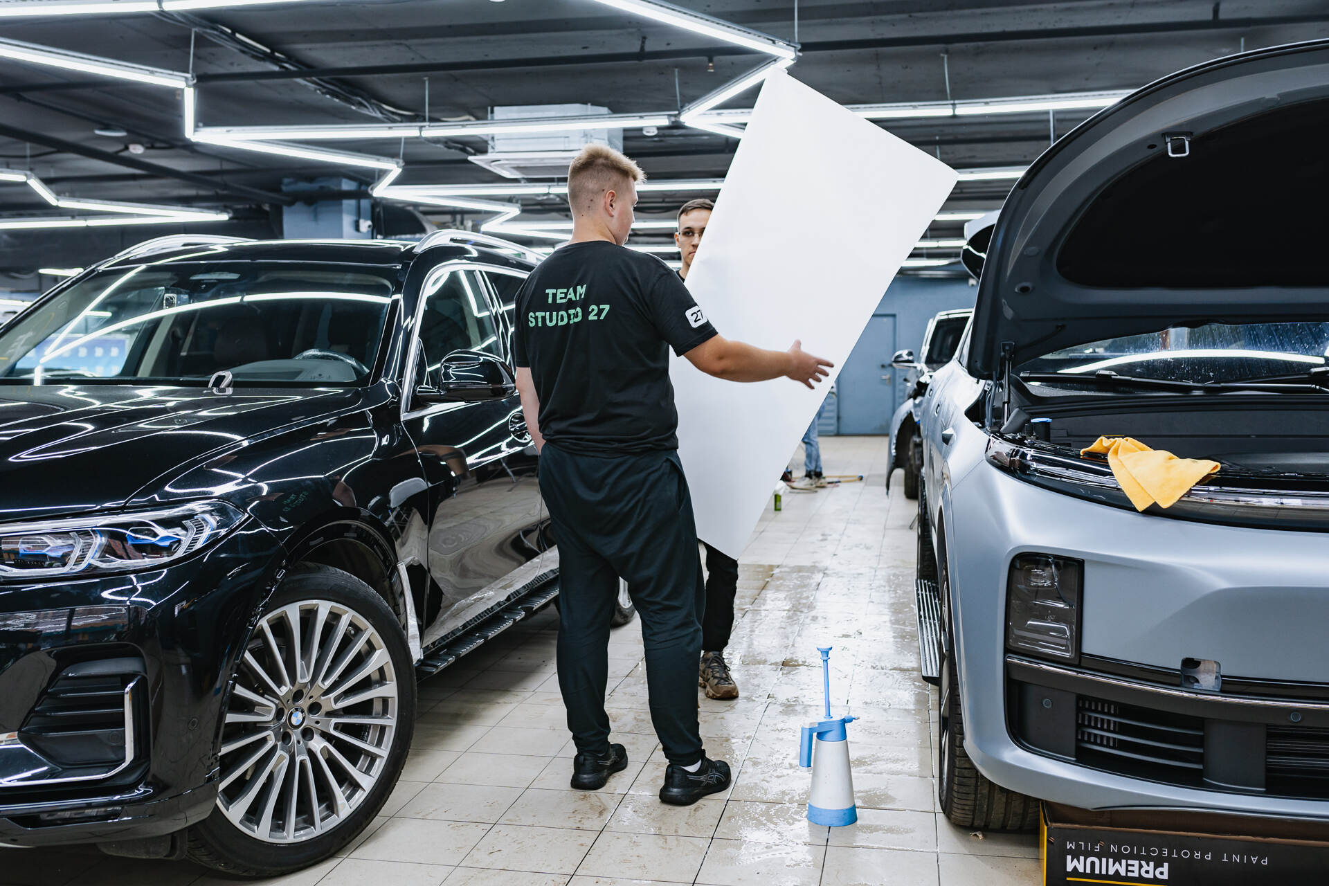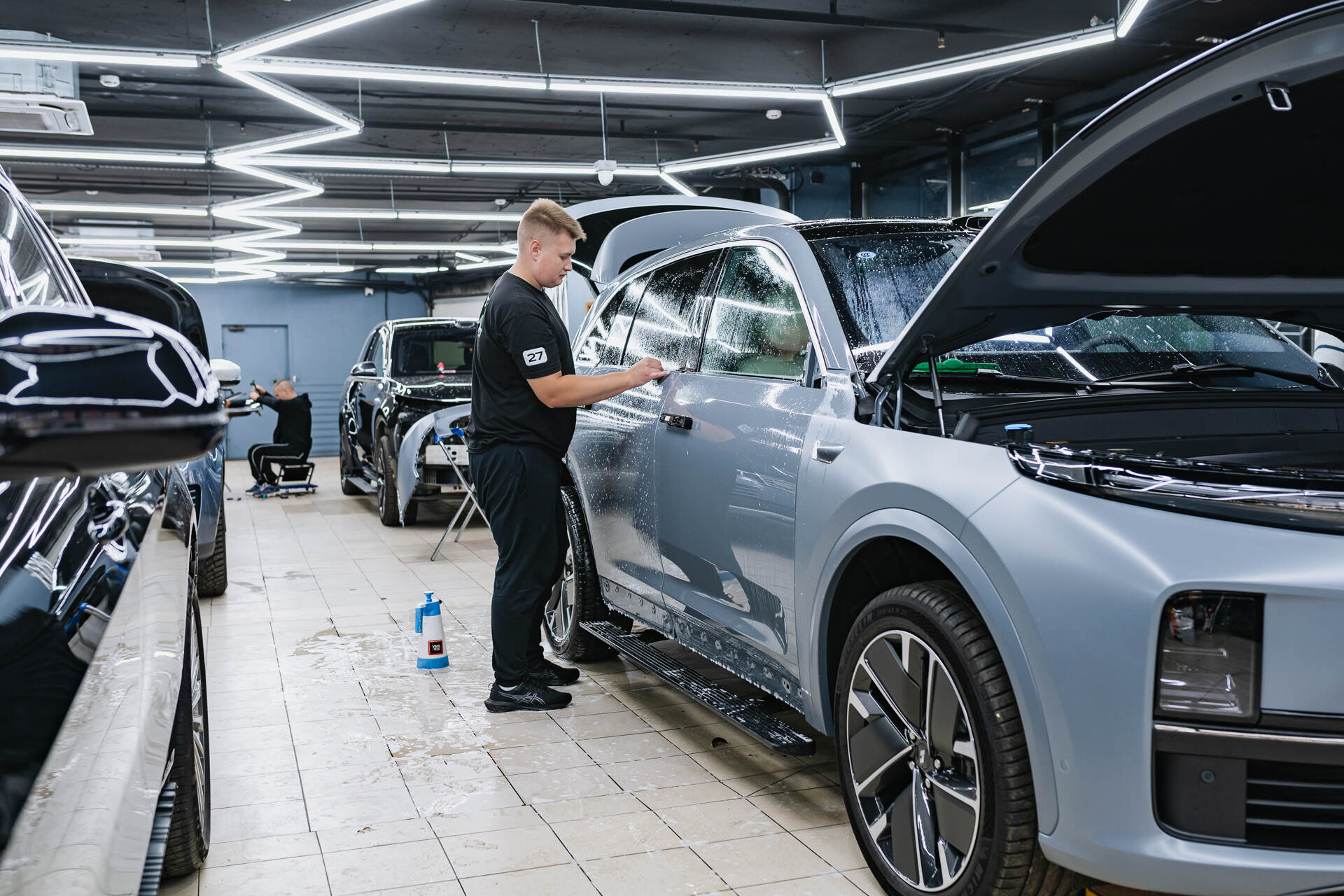 Прежде чем мы приступим к непосредственному нанесению защитной матовой плёнки на автомобиль Lixiang L7 Рестайлинг 2025, необходимо провести тщательную очистку поверхности кузова и фар. Сама процедура оклеивания выполняется по выверенной методике, что подразумевает обязательное увлажнение кузова для обеспечения лучшего сцепления материала с поверхностью. После того, как поверхность кузова будет полностью очищена и отполирована (это необходимо, чтобы устранить возможные царапины и прочие дефекты), мы приступаем к вырезанию из общего рулона кусков плёнки Spectroll Premium Matte нужного размера. Затем мы обрабатываем их мыльным раствором и плотно натягиваем на кузов автомобиля. Используя специальный инструмент, ракель, мы тщательно разглаживаем плёнку, одновременно удаляя любые пузырьки воздуха и все излишки влаги.