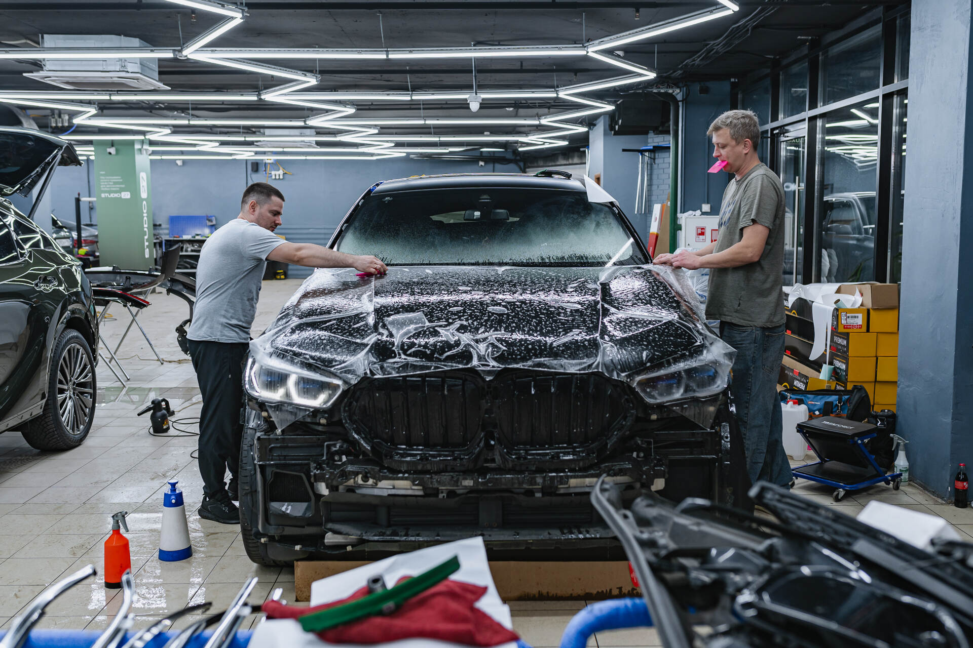 Полная оклейка кузова BMW X6 бронепленкой — это довольно трудоемкая и кропотливая процедура, которая требует около 48-72 часов работы. Прежде чем мы сможем приступить к непосредственному нанесению защитного покрытия, необходимо тщательно подготовить поверхность автомобиля – эта подготовка включает в себя глубокую очистку и полное обезжиривание абсолютно всех элементов кузова, а также полировку, чтобы придать кузову блеск и удалить мелкие имеющиеся дефекты. Сама технология нанесения брони на кузов состоит из нескольких важных этапов. Сначала мы занимаемся выкраиванием отдельных элементов пленки, которые должны точно соответствовать контурам различных частей автомобиля. Каждый такой фрагмент предварительно обрабатывается специальным мыльным раствором, что является ключевым для достижения идеального прилегания. Материал аккуратно наносится на кузов во влажном состоянии, после чего наши мастера, используя жесткий ракель, тщательно разравнивают поверхность. Это необходимо для устранения малейших складок и одновременного удаления всей излишней влаги из-под защитного слоя.
