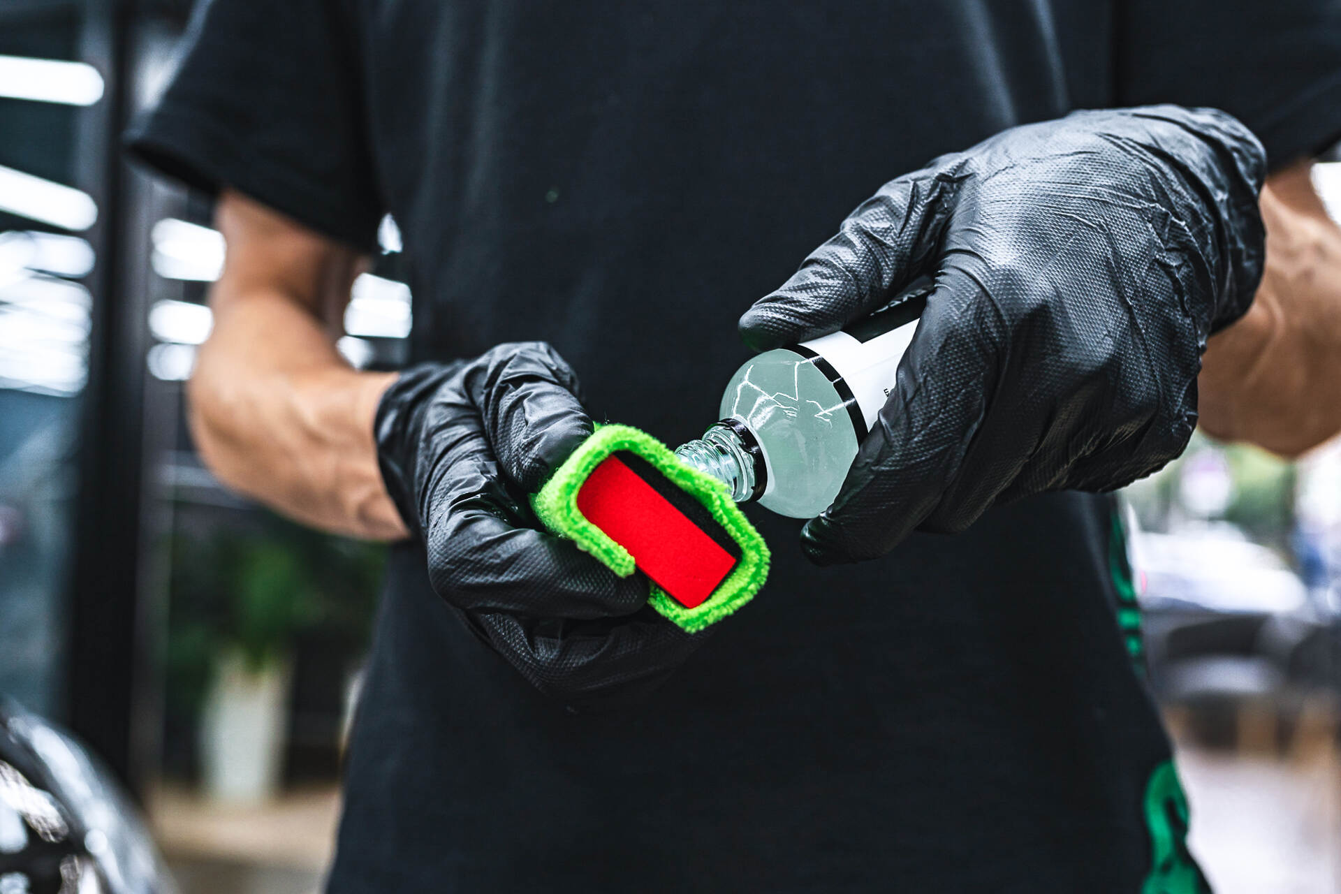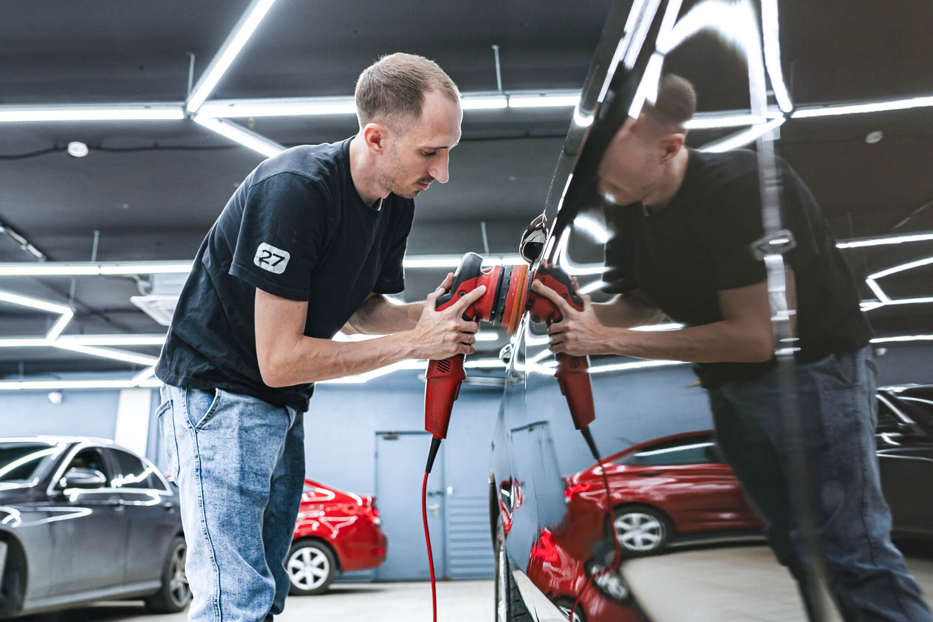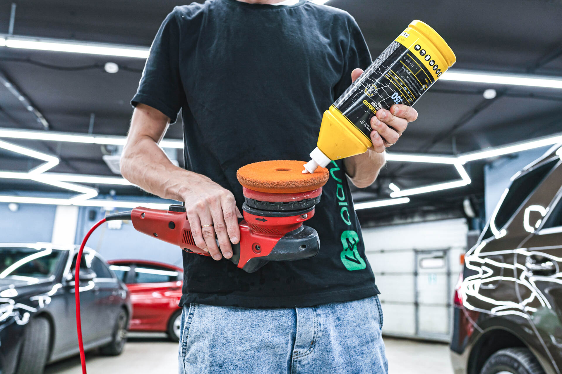 Учитывая наличие визуальных дефектов на кузове, которые формируются в любом случае при эксплуатации автомобиля, мы проводим для начала глубокую абразивную полировку. Эта процедура эффективно устраняет следы воздействия пескоструя и мелких камней, создавая идеальную основу для последующего нанесения керамического покрытия. Методика работы всегда подбирается индивидуально — состояние лакокрасочного покрытия определяет необходимую интенсивность полировки. В данном случае полировка представляет собой тщательную обработку поверхностей профессиональным оборудованием: разноформатные полировальные насадки-круги в сочетании с подобранными абразивными составами последовательно устраняют микроскопические повреждения, возвращая покрытию первоначальную глубину и глянец. Такой подход гарантирует безупречную подготовку поверхности для финишного нанесения защитной керамики.