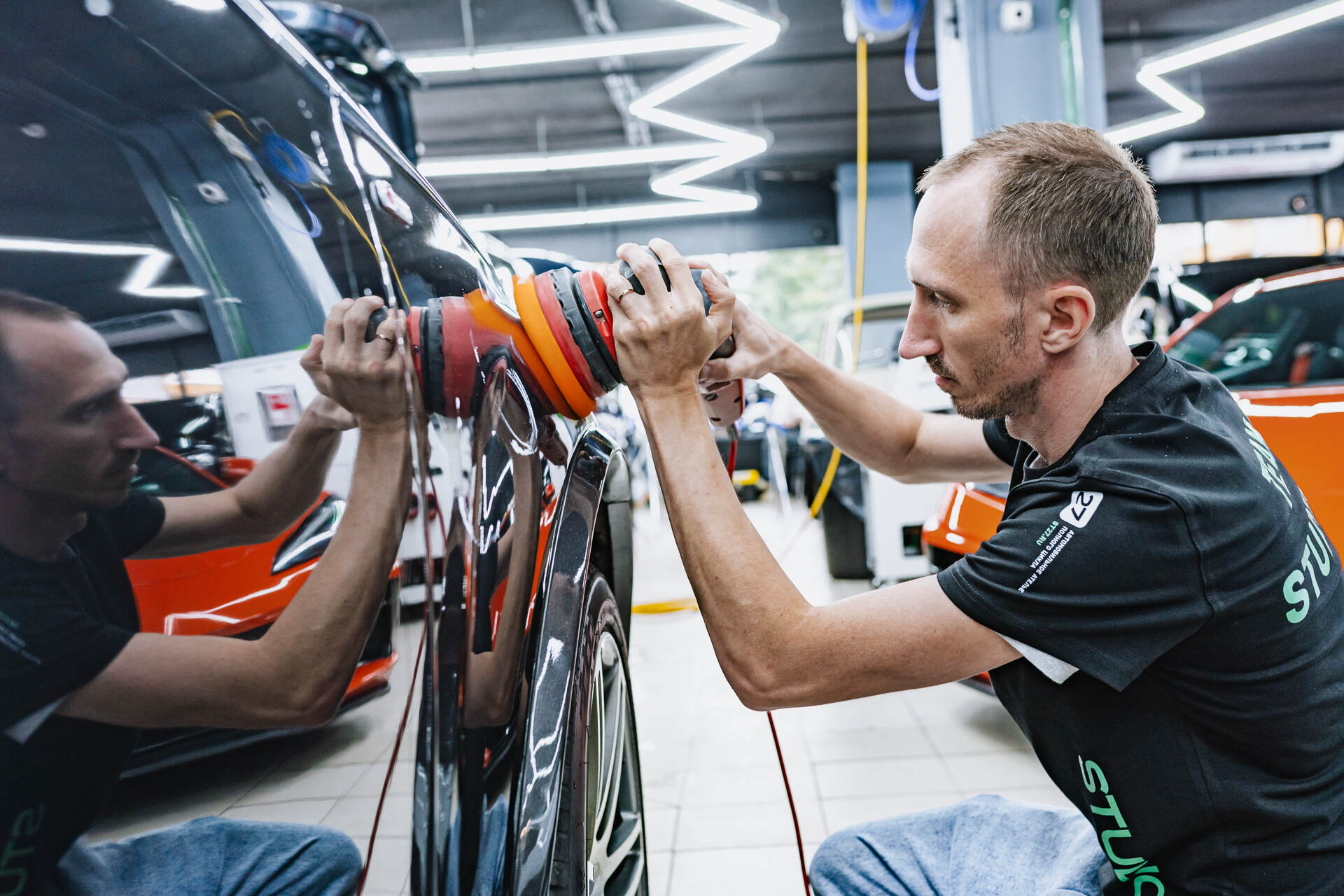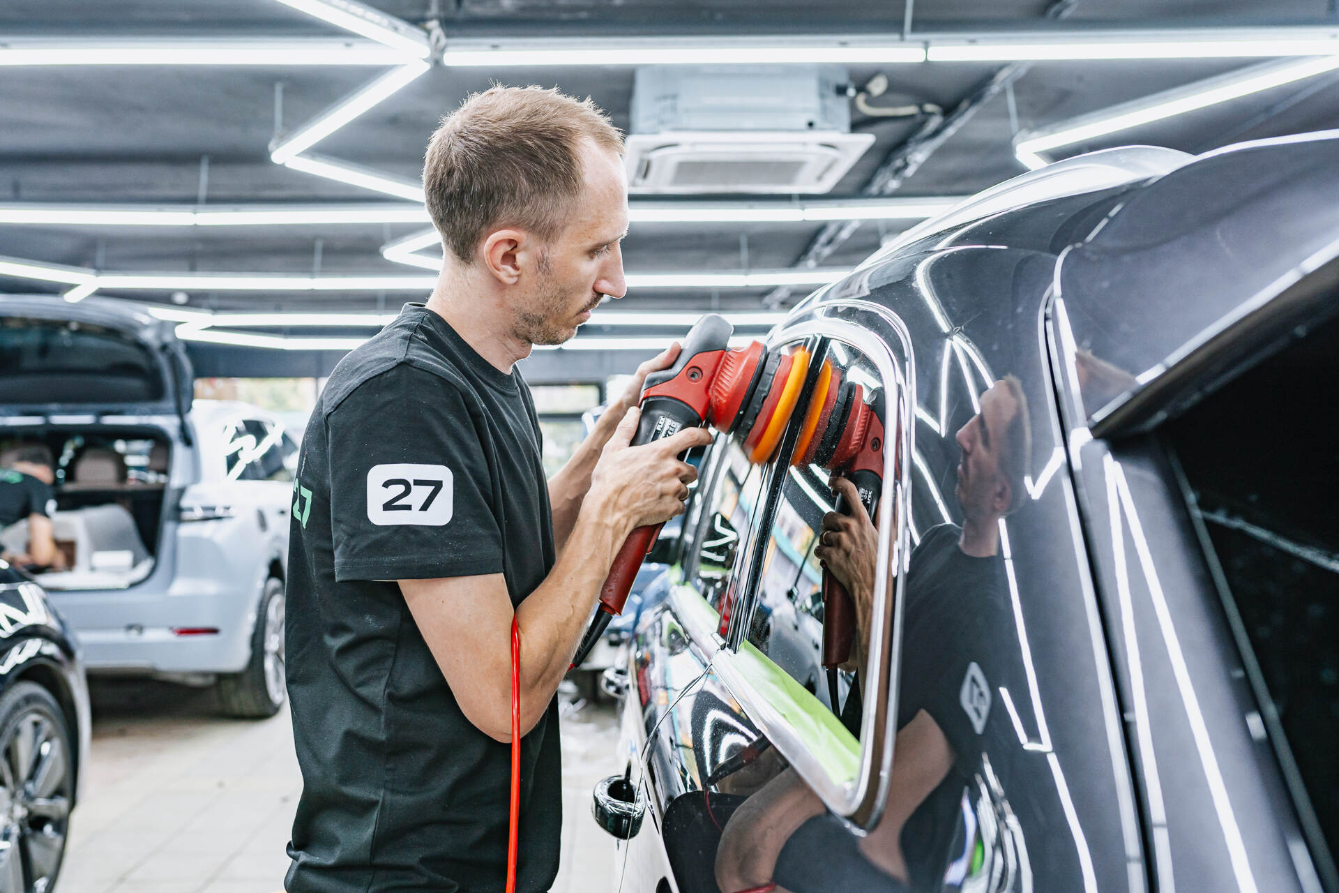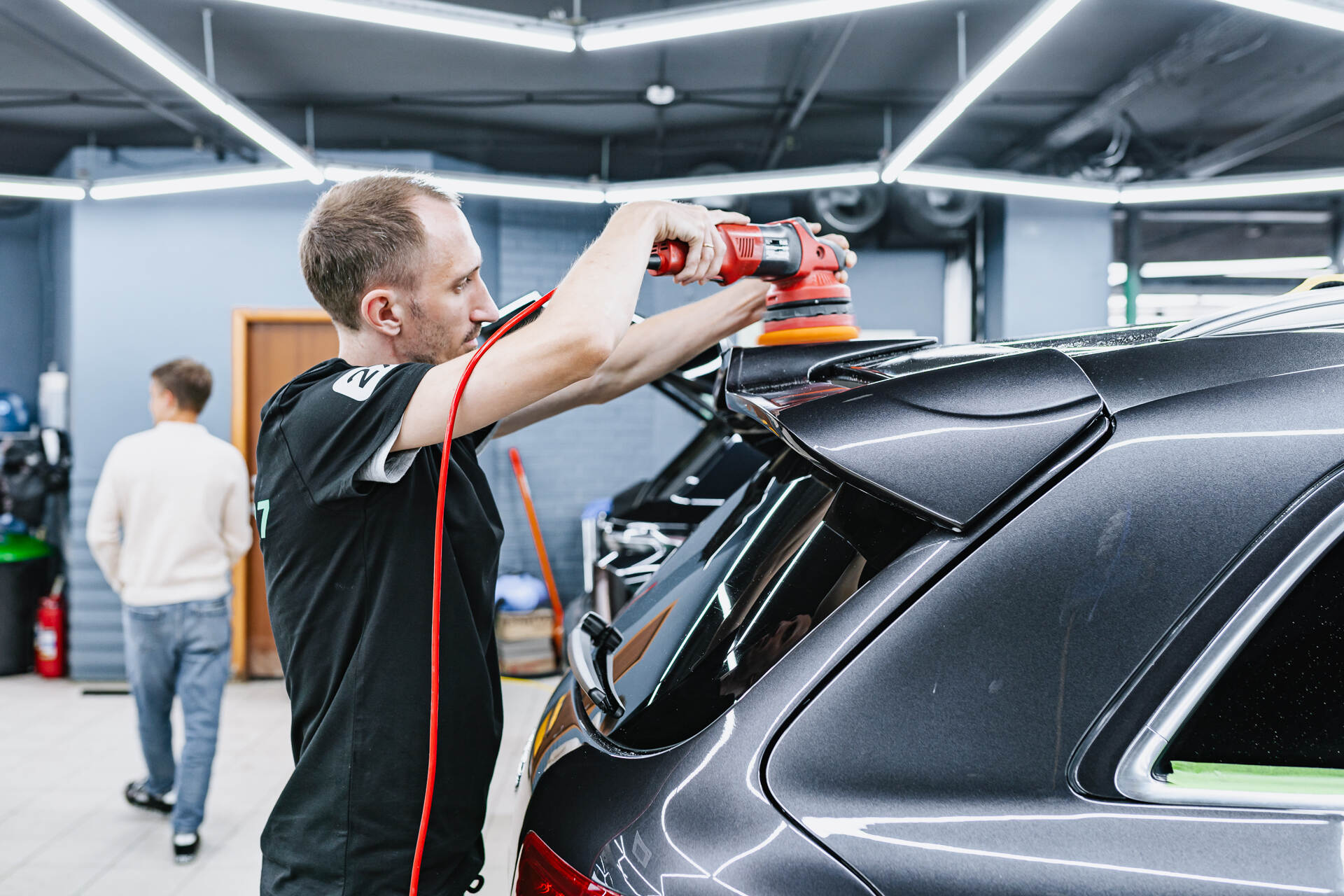 Полировка кузова — это технология восстановления лакокрасочного покрытия, направленная на возвращение первоначального глянца и устранение мелких повреждений. Процесс включает три основных этапа восстановительных работ. Сначала проводится тщательная подготовка поверхности с полным удалением различных загрязнений: дорожной пыли, грязи, битумных пятен, следов насекомых и птичьего помета. Затем выполняется шлифовка, в ходе которой аккуратно удаляется поврежденный слой лака и выравниваются микронеровности поверхности. Финальная стадия представляет собой полировку специальными пастами, эффективно заполняющими мельчайшие трещины и создающими идеально гладкую поверхность с глубоким блеском. В результате автомобиль обретает безупречный внешний вид, сопоставимый с заводским состоянием.