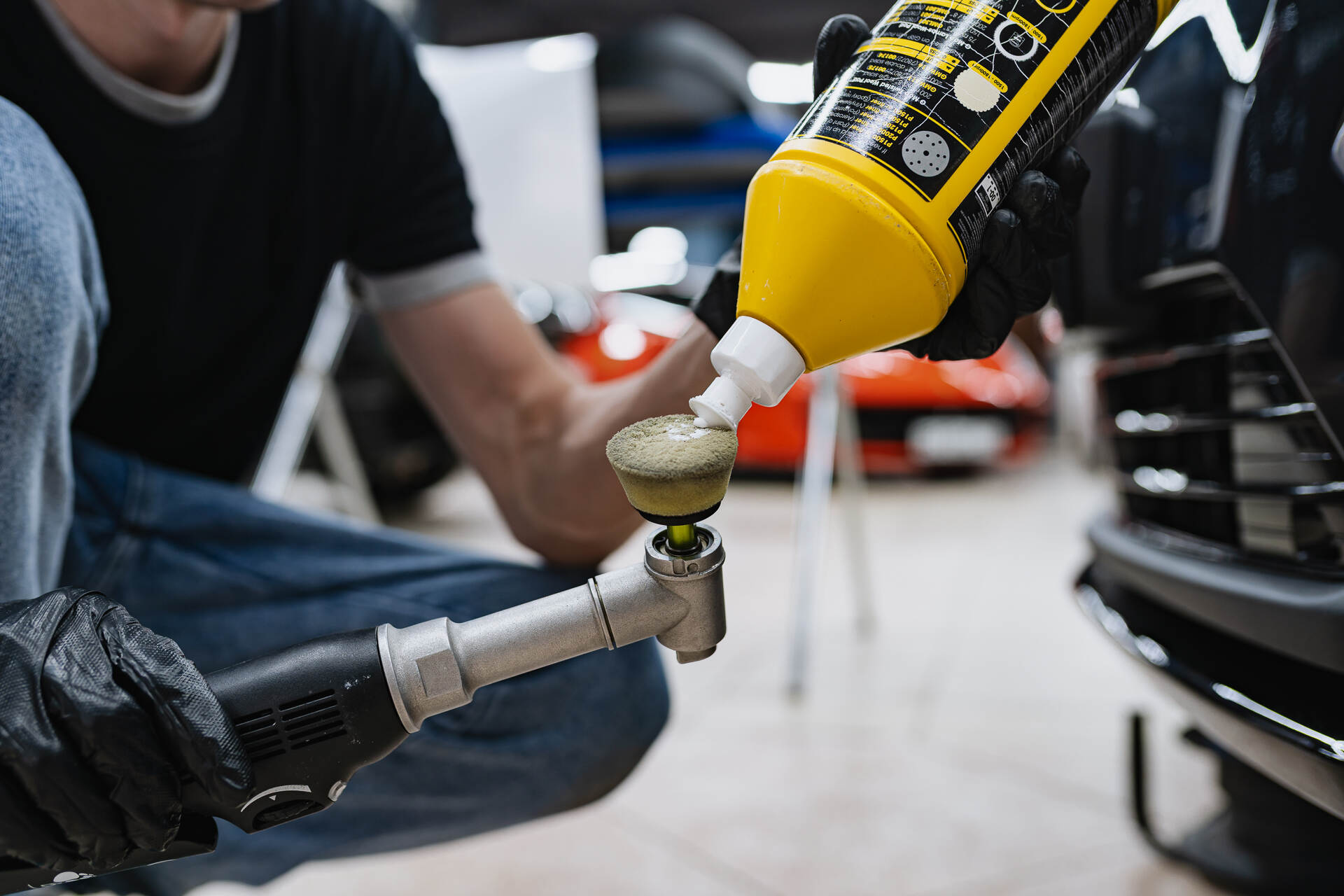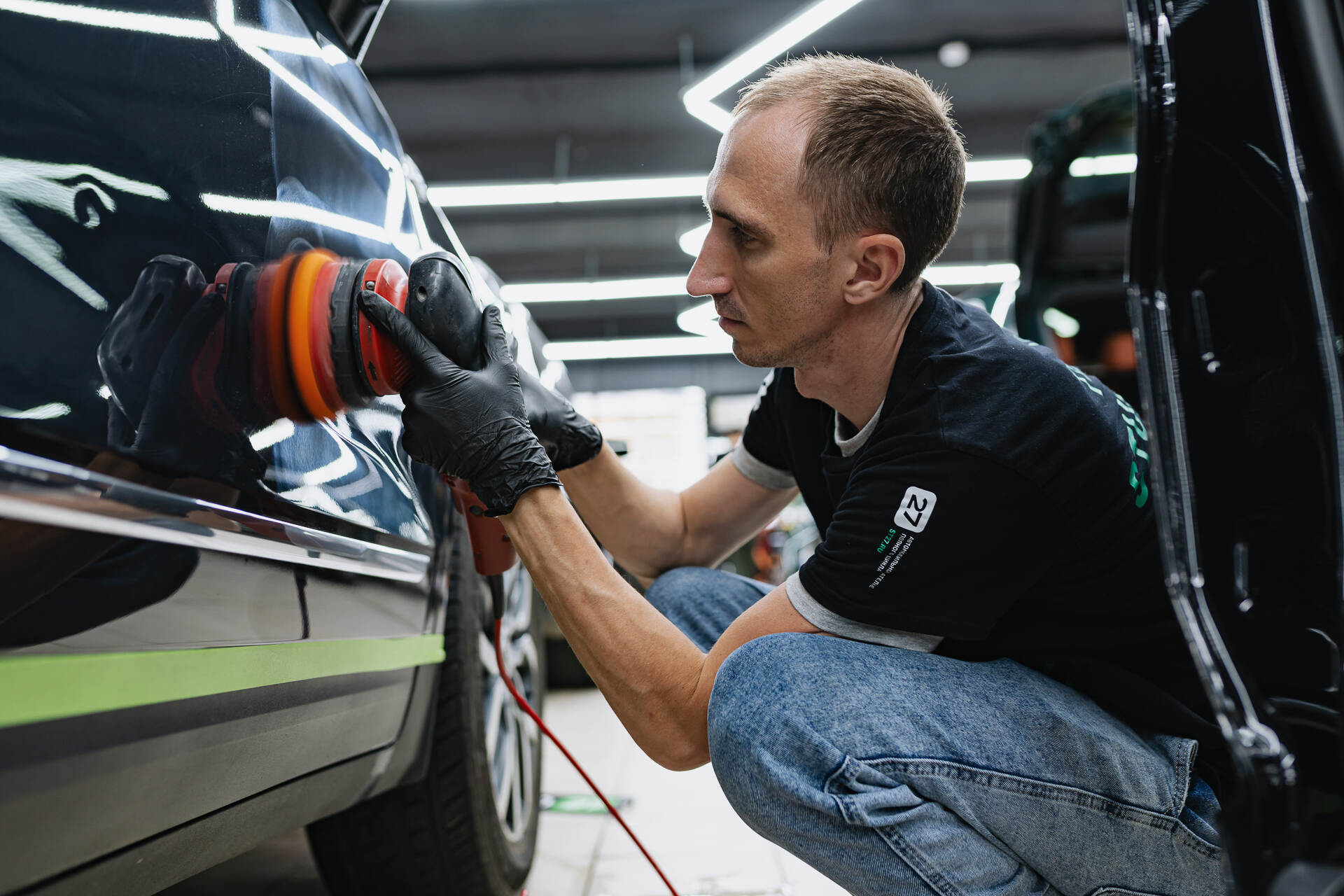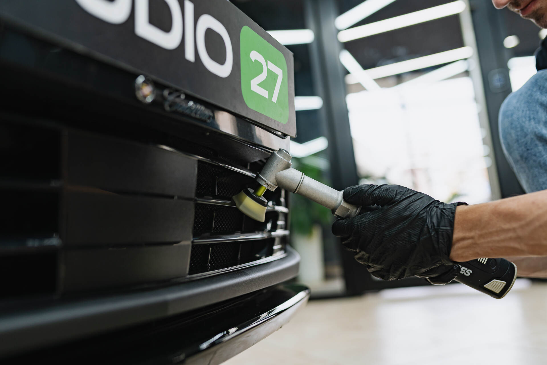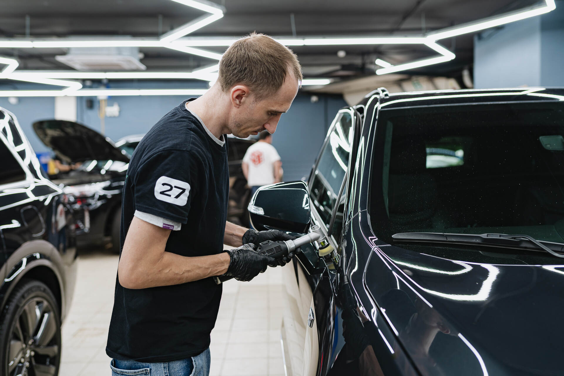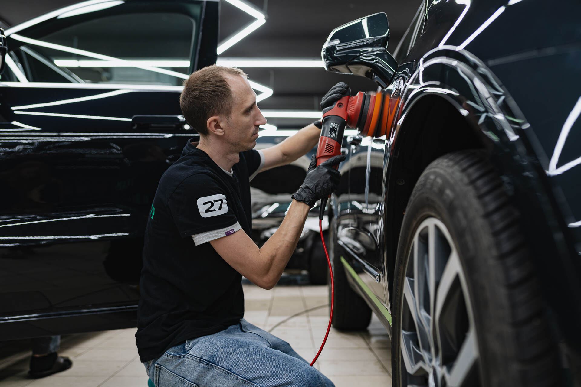 Поскольку кузов этого автомобиля имел некоторые визуальные дефекты, вызванные пробегом, мы приняли решение выполнить глубокую абразивную полировку. Данная процедура позволит эффективно устранить малейшие следы воздействия пескоструя и мелких камешков непосредственно перед нанесением керамического покрытия. Подход к работе всегда подбирается строго индивидуально — состояние каждого конкретного кузова определяет необходимую степень полировки. В нашем случае полировка кузова представляет собой тщательную обработку поверхностей с применением высококлассного профессионального оборудования. Разноразмерные полировальные круги в сочетании с тщательно подобранными абразивными составами позволяют эффективно устранить микроскопические дефекты, полностью возвращая покрытию его первоначальный насыщенный глянец. Такой методичный подход гарантирует идеальную подготовку поверхности для последующего нанесения защитной керамики.