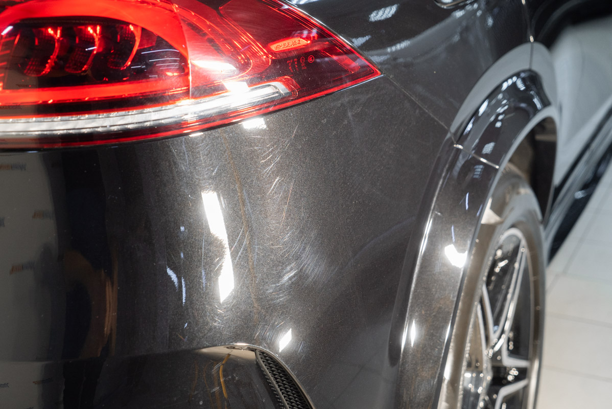 Постепенно лаковый слой транспортного средства утрачивает свои эстетические и функциональные характеристики, покрываясь сетью мелких повреждений и потертостей. Чтобы эффективно справиться с подобными возрастными изменениями, наши специалисты прибегают к технологии глубокой абразивной полировки, которая дает возможность полностью восстановить первозданный облик автомобиля. Наглядным подтверждением эффективности данной процедуры послужил проект по обновлению внешнего вида автомобиля Mercedes-Benz GLE 400d, который заехал в наш цех в весьма неудовлетворительном состоянии — практически каждая кузовная деталь автомобиля была густо покрыта микроскопическими царапинами и потертостями от пескоструя. Использование многоэтапной полировки позволило нам бесследно устранить все накопленные дефекты на кузове, вернув лакокрасочному покрытию его заводскую глубину, насыщенность цвета и зеркальное отражение.