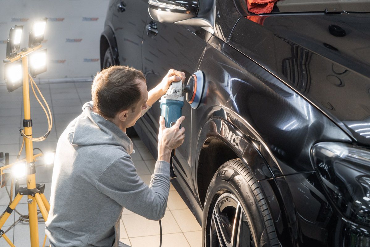 Итак, полировки кузова Mercedes-Benz GLE 400d стартует с тщательной инспекции кузова под направленным светом для обнаружения всех изъянов. После деликатной очистки от дорожного налета мастера приступают к поэтапной обработке поверхностей полировочными пастами разной зернистости. С помощью профессионального оборудования и кругов различного диаметра последовательно полируются все внешние элементы автомобиля, что позволяет эффективно устранить сеть царапин, следы окисления и мелкие несовершенства лака.