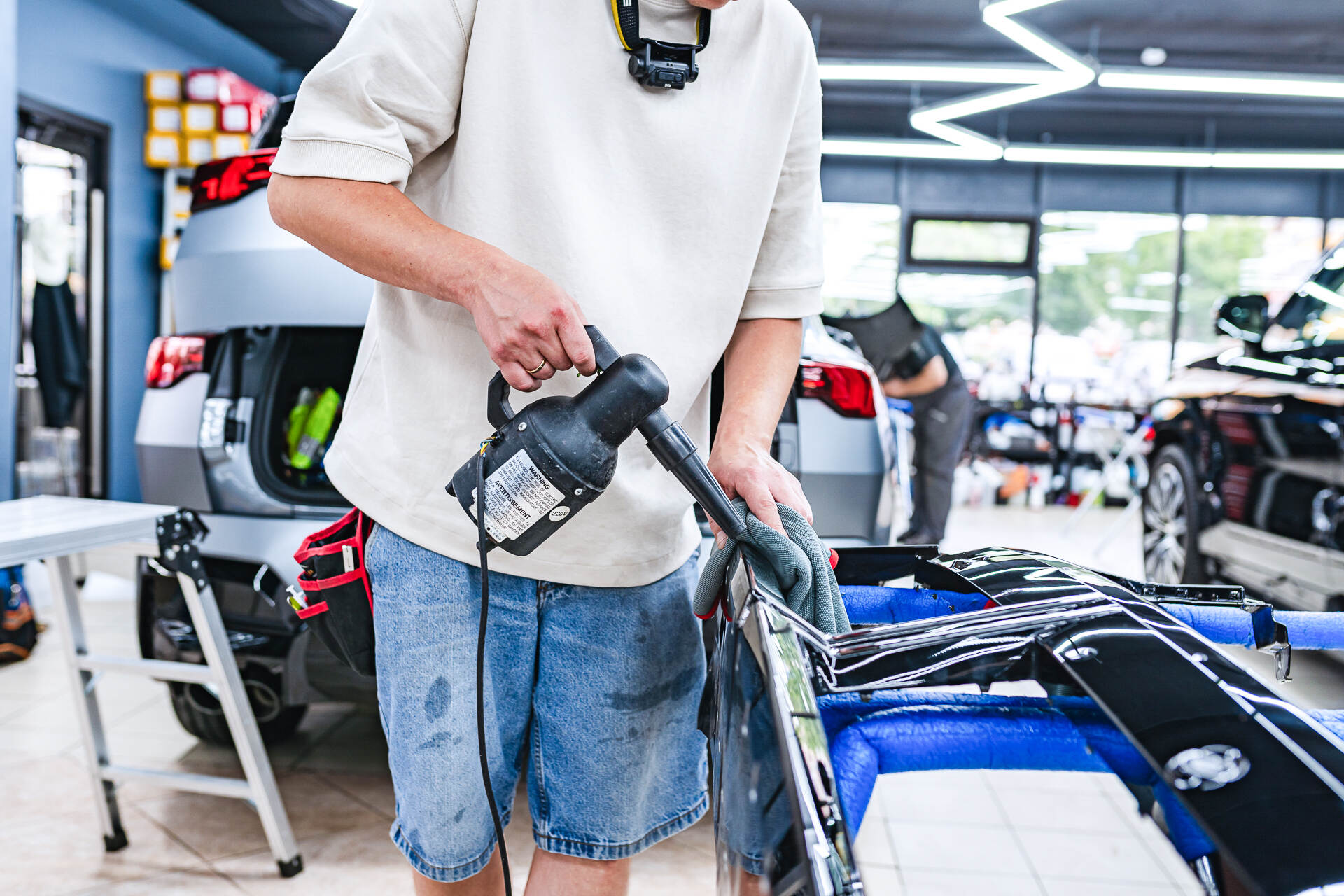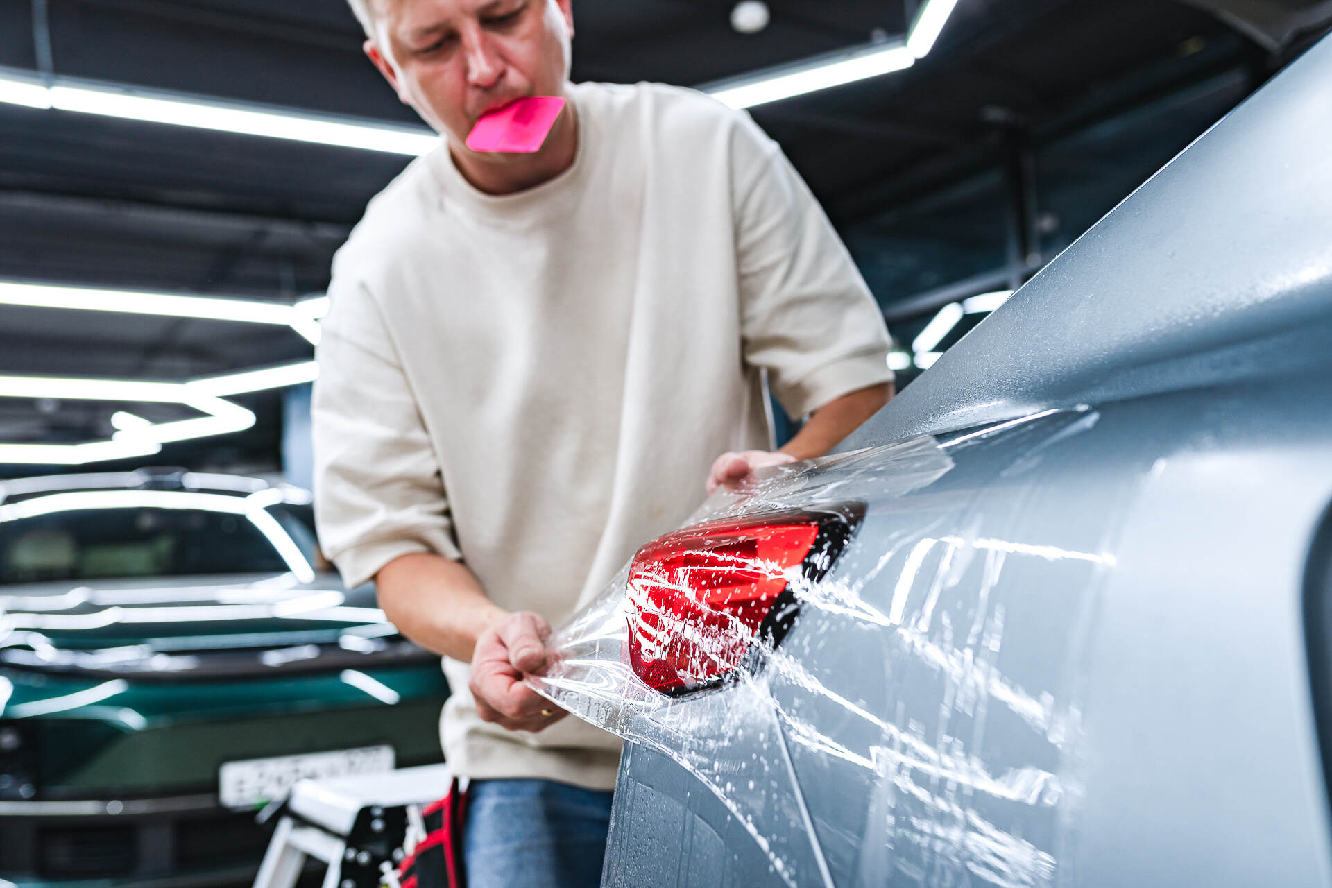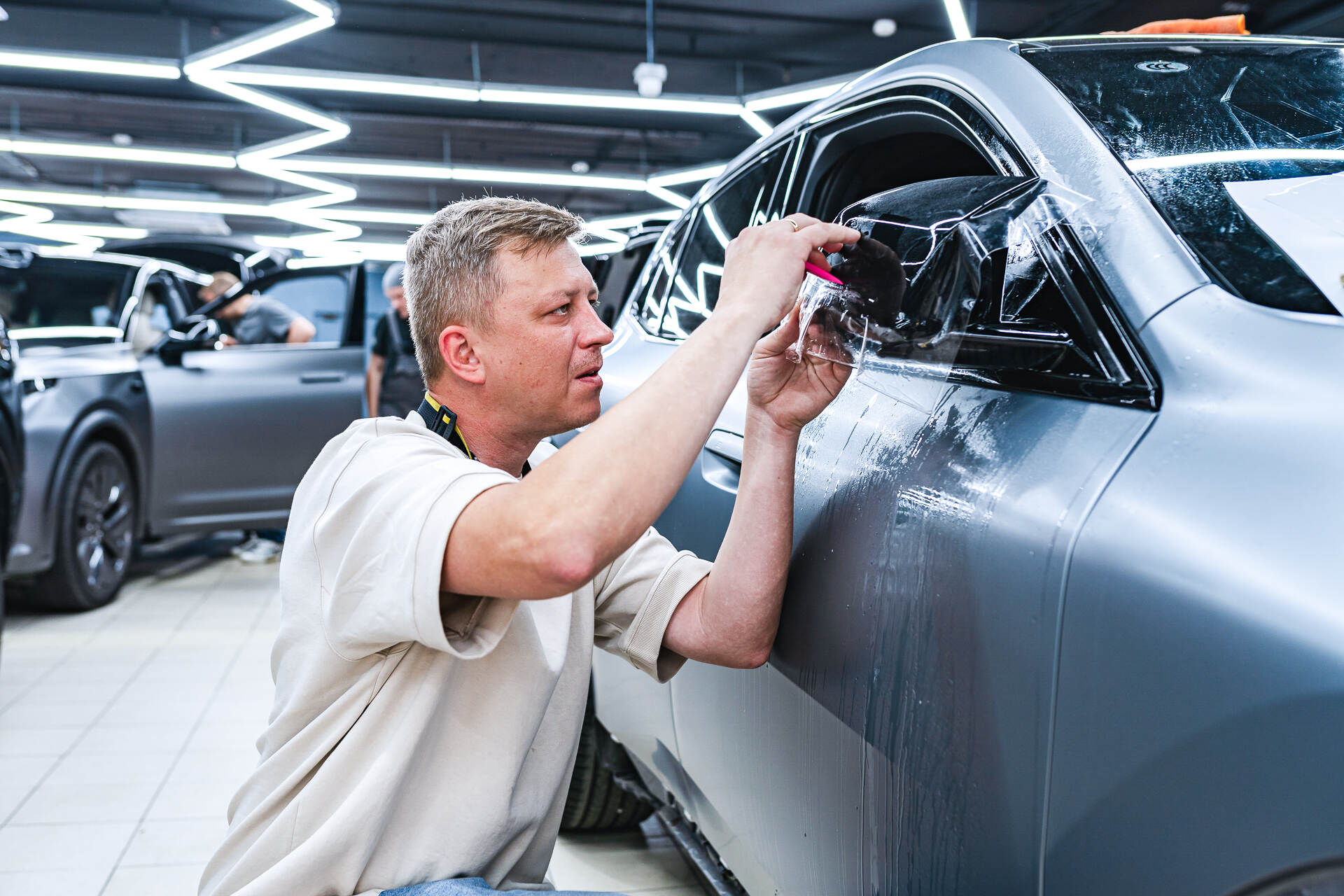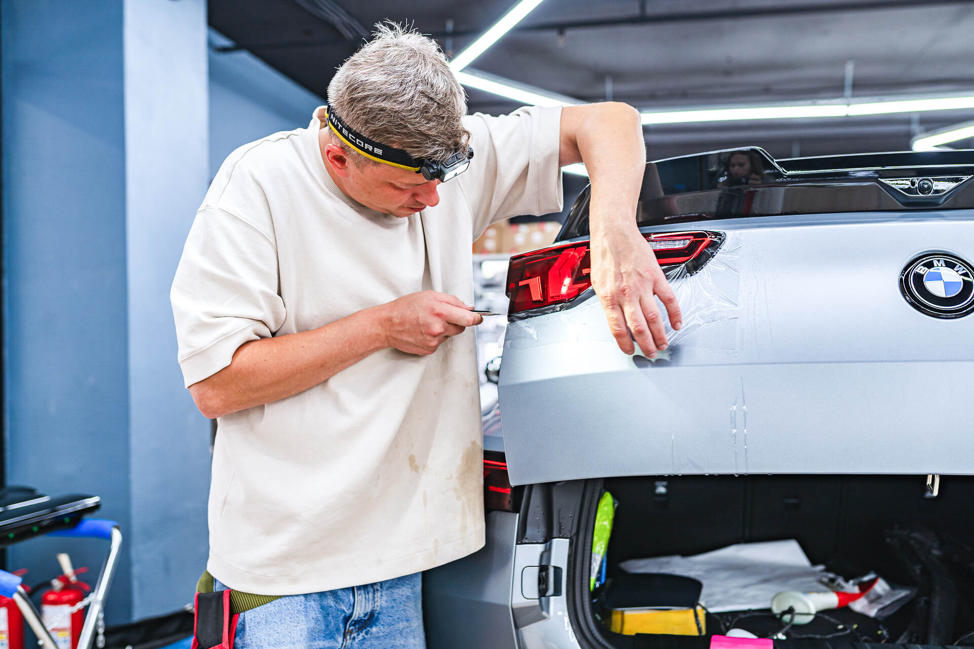 Процесс оклейки кузова BMW X2 матовым покрытием требует скрупулезного подхода и внимания к деталям. Рекомендуемый срок выполнения работ составляет не менее трех суток (конкретные временные рамки определяются индивидуально после осмотра автомобиля). Подготовка кузова к оклейке состоит из нескольких стадий: тщательная мойка для удаления всех видов загрязнений, обезжиривание специальными составами для создания идеальной адгезии, и при необходимости — локальная полировка для устранения микронеровностей кузова.