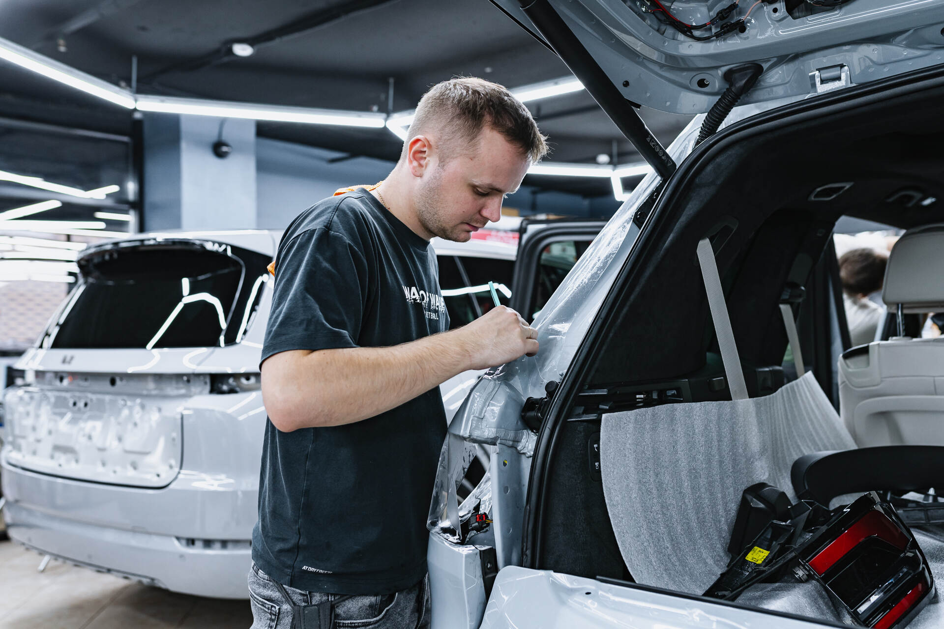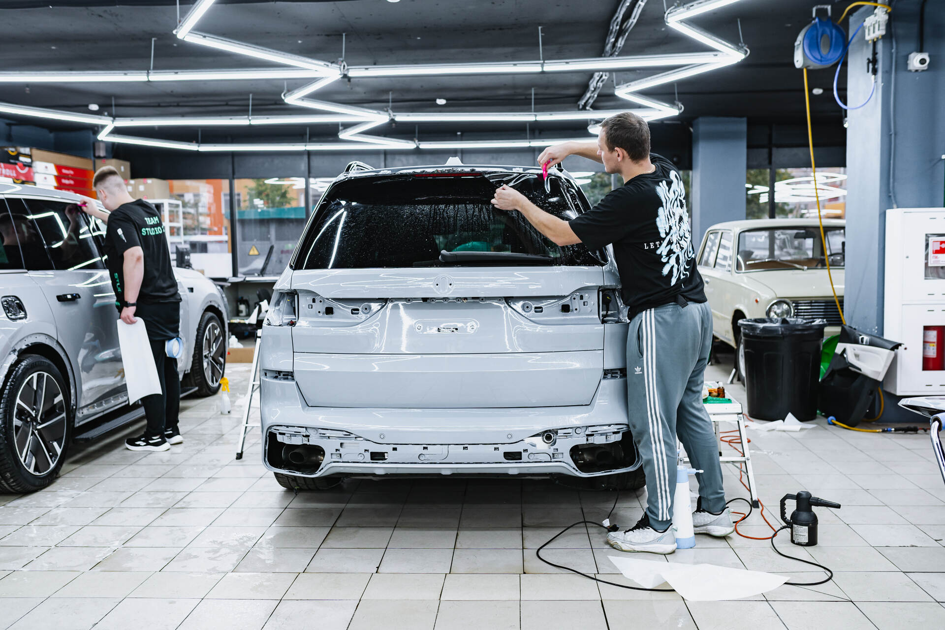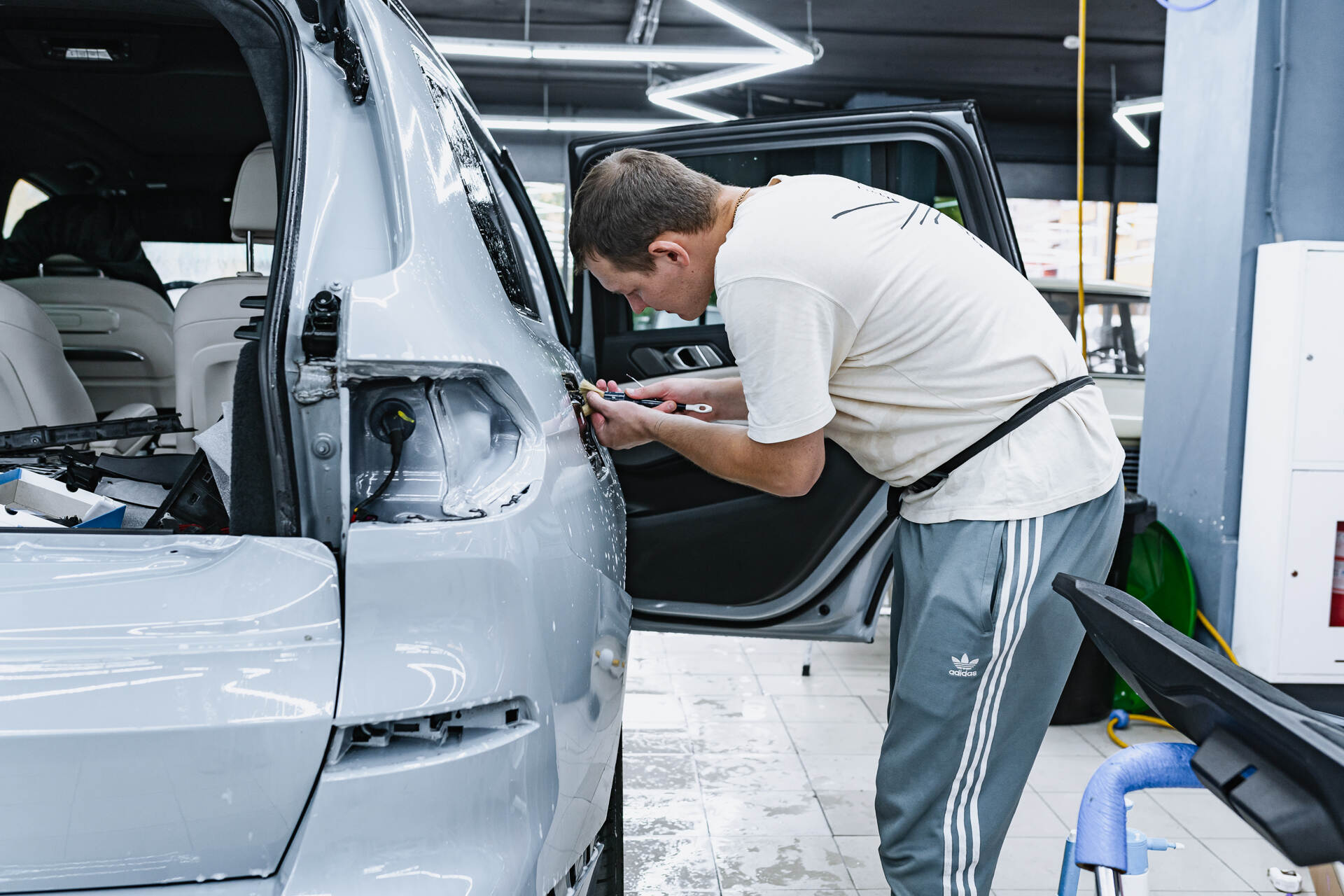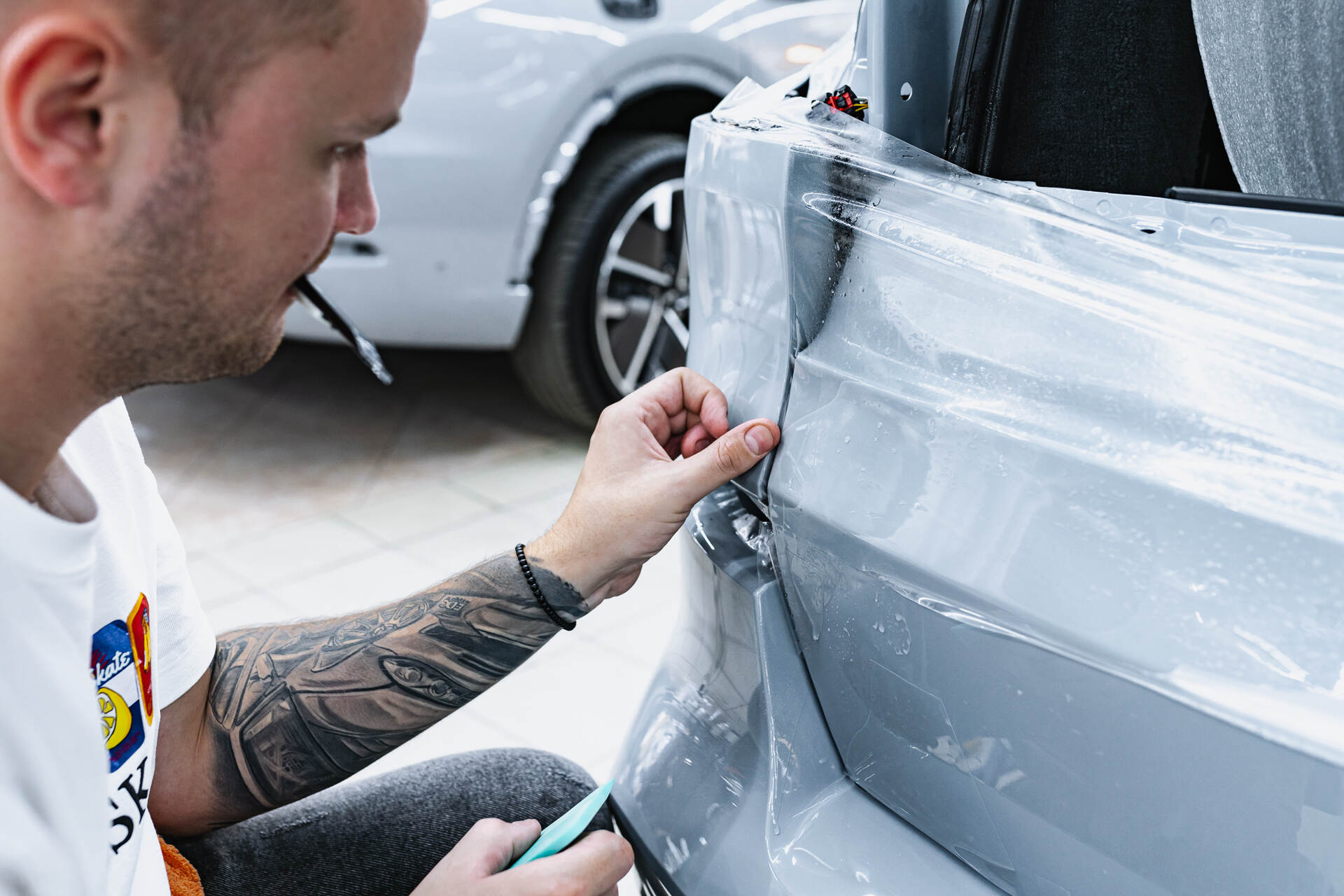 При бронировании кузова BMW X7 G07 Рестайлинг мы уделяем первостепенное внимание защите наиболее уязвимых элементов: капота, фар, бампера, передних крыльев, стоек кузова, зеркал заднего вида. Но конкретно в данном кейсе мы затянем бронеплёнкой все внешние участки авто, что означает полную защиту кузова. Такой комплексный подход обеспечивает надежную сохранность именно тех зон, которые наиболее подвержены повреждениям в процессе эксплуатации. Несмотря на то, что эта услуга относится к премиальному сегменту, она представляет собой разумное вложение в долгосрочное сохранение безупречного внешнего вида вашего автомобиля. Каждый владелец самостоятельно определяет степень важности такой защиты для себя. Технологический процесс нанесения защитной пленки включает несколько этапов: работа начинается с тщательной мойки и обезжиривания поверхностей кузова. Затем подготовленные фрагменты пленки обрабатываются мыльным раствором и с натяжением фиксируются на кузовных элементах. С помощью профессионального ракеля мастер тщательно разглаживает полиуретановое покрытие, одновременно устраняя возможные складки и удаляя излишки влаги из-под материала. Эта ювелирная работа требует большого опыта и аккуратности, но именно она гарантирует безупречное прилегание защитного слоя полиуретана к кузову.