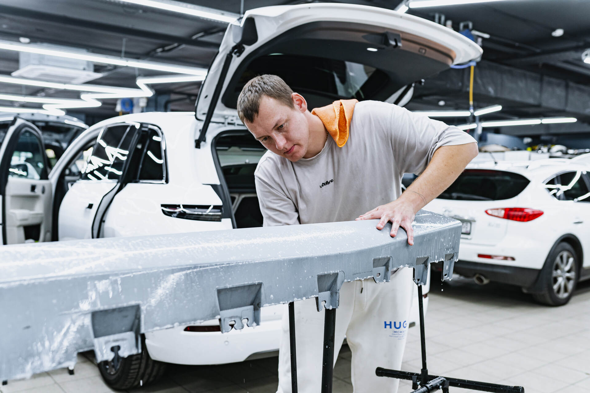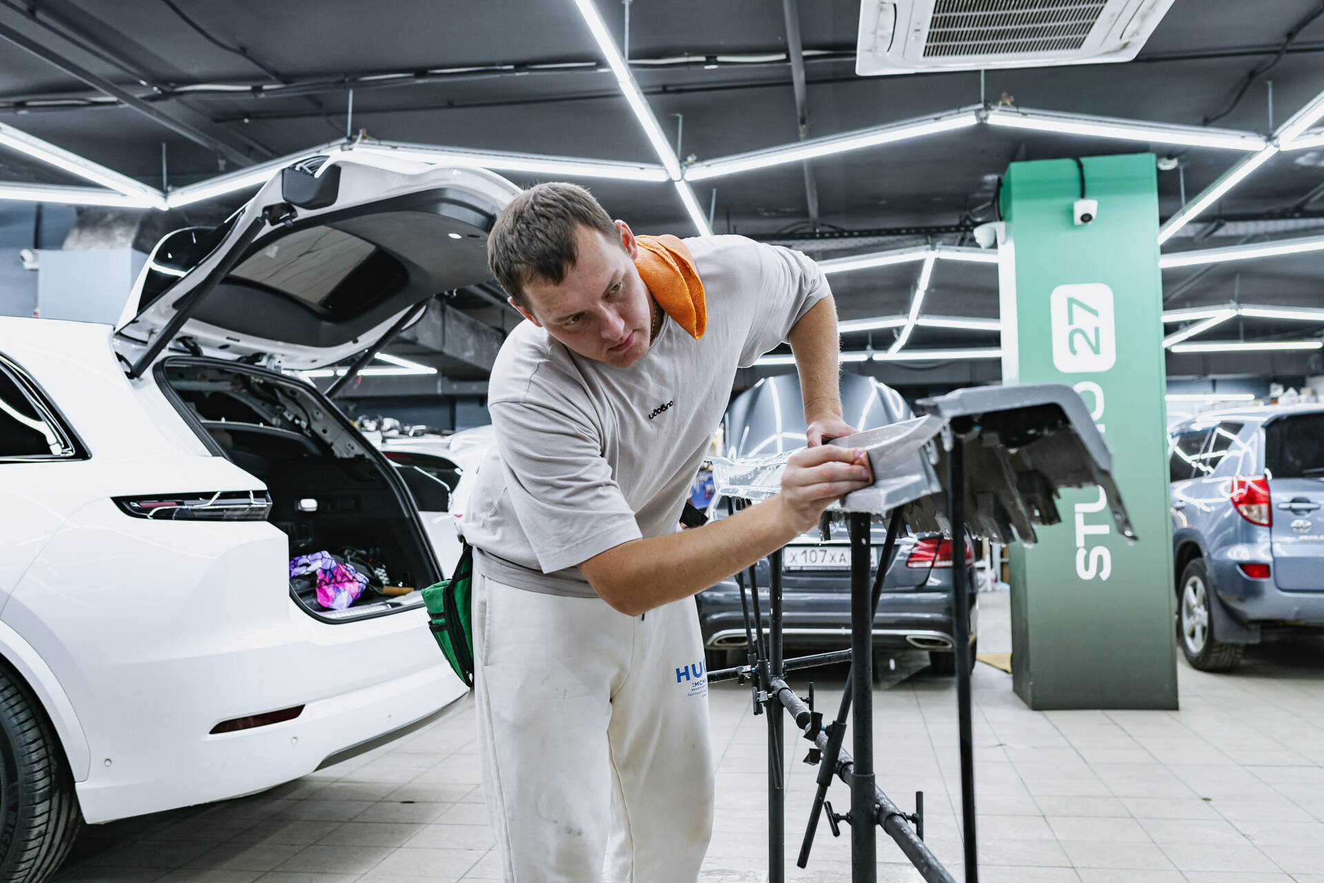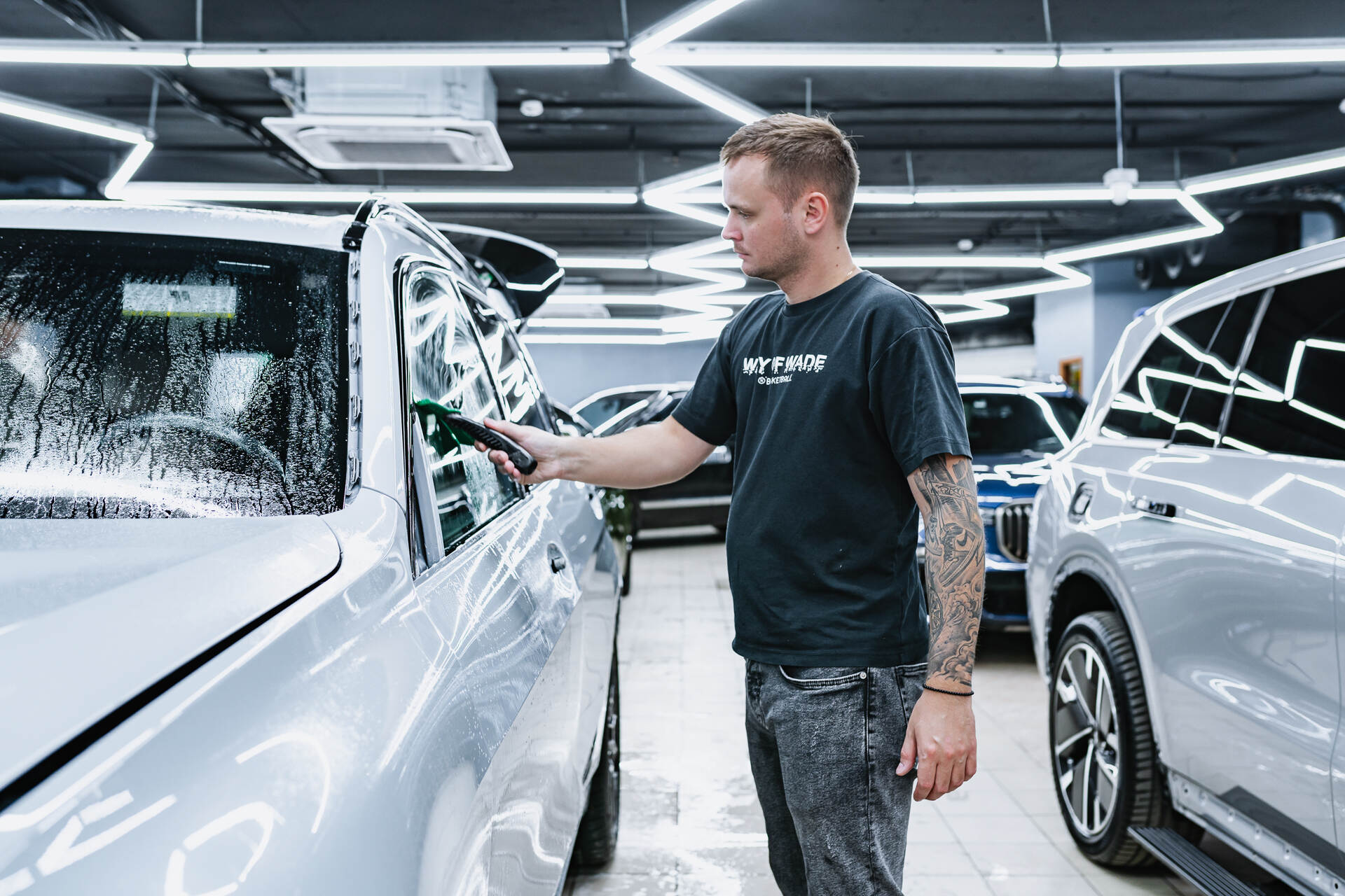 При бронировании кузова BMW X7 G07 Рестайлинг мы уделяем первостепенное внимание защите наиболее уязвимых элементов: капота, фар, бампера, передних крыльев, стоек кузова, зеркал заднего вида. Но конкретно в данном кейсе мы затянем бронеплёнкой все внешние участки авто, что означает полную защиту кузова. Такой комплексный подход обеспечивает надежную сохранность именно тех зон, которые наиболее подвержены повреждениям в процессе эксплуатации. Несмотря на то, что эта услуга относится к премиальному сегменту, она представляет собой разумное вложение в долгосрочное сохранение безупречного внешнего вида вашего автомобиля. Каждый владелец самостоятельно определяет степень важности такой защиты для себя. Технологический процесс нанесения защитной пленки включает несколько этапов: работа начинается с тщательной мойки и обезжиривания поверхностей кузова. Затем подготовленные фрагменты пленки обрабатываются мыльным раствором и с натяжением фиксируются на кузовных элементах. С помощью профессионального ракеля мастер тщательно разглаживает полиуретановое покрытие, одновременно устраняя возможные складки и удаляя излишки влаги из-под материала. Эта ювелирная работа требует большого опыта и аккуратности, но именно она гарантирует безупречное прилегание защитного слоя полиуретана к кузову.