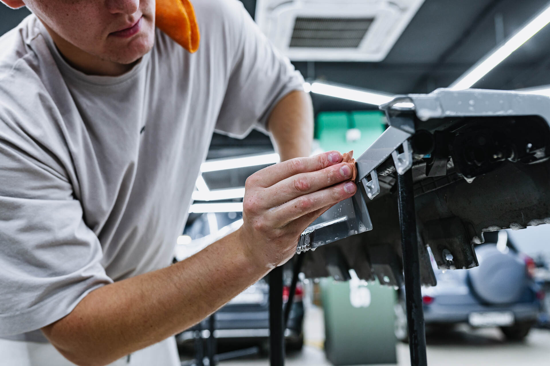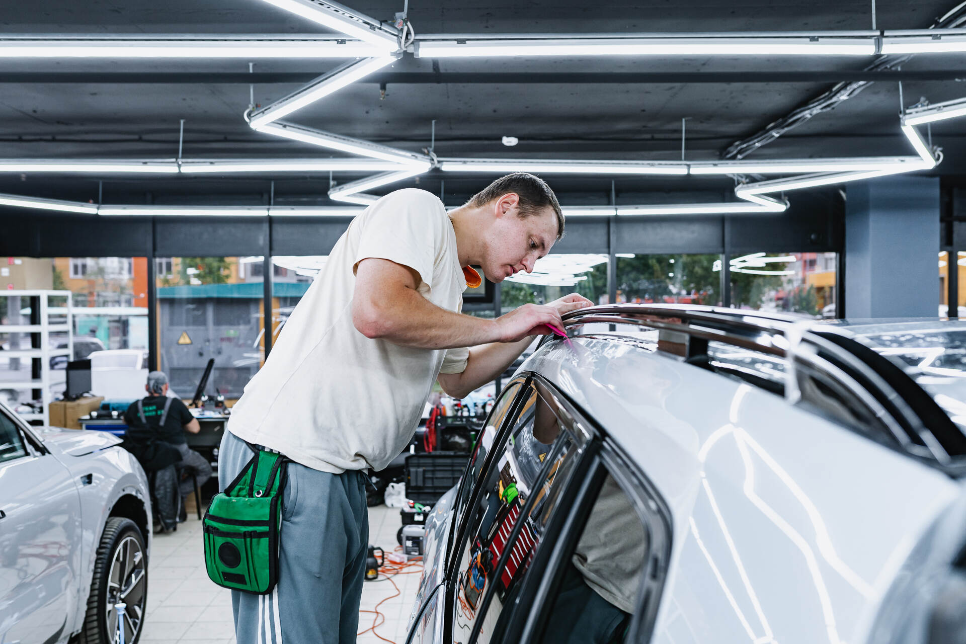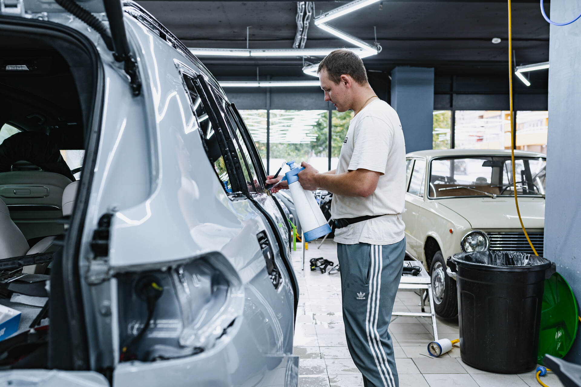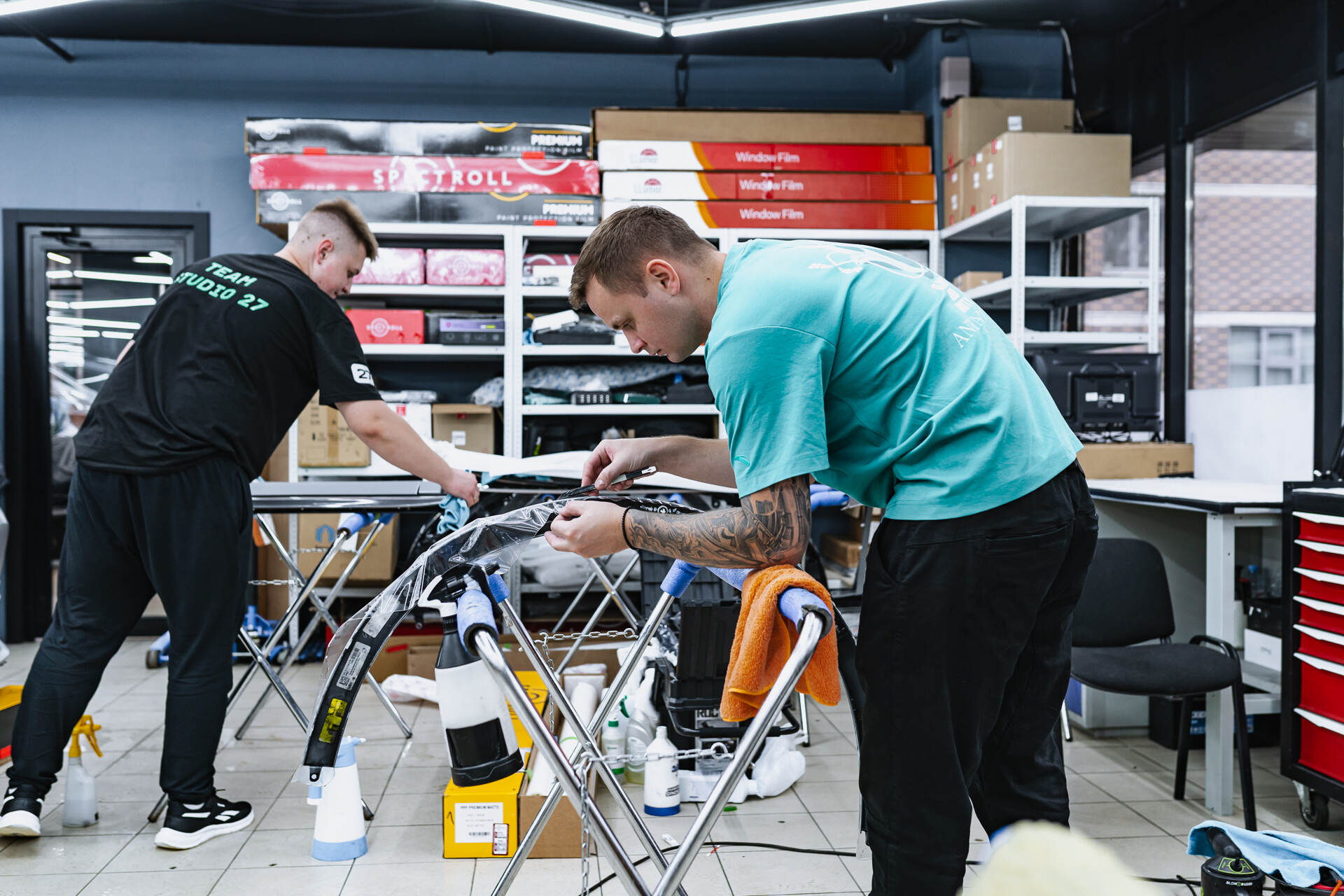 При бронировании кузова BMW X7 G07 Рестайлинг мы уделяем первостепенное внимание защите наиболее уязвимых элементов: капота, фар, бампера, передних крыльев, стоек кузова, зеркал заднего вида. Но конкретно в данном кейсе мы затянем бронеплёнкой все внешние участки авто, что означает полную защиту кузова. Такой комплексный подход обеспечивает надежную сохранность именно тех зон, которые наиболее подвержены повреждениям в процессе эксплуатации. Несмотря на то, что эта услуга относится к премиальному сегменту, она представляет собой разумное вложение в долгосрочное сохранение безупречного внешнего вида вашего автомобиля. Каждый владелец самостоятельно определяет степень важности такой защиты для себя. Технологический процесс нанесения защитной пленки включает несколько этапов: работа начинается с тщательной мойки и обезжиривания поверхностей кузова. Затем подготовленные фрагменты пленки обрабатываются мыльным раствором и с натяжением фиксируются на кузовных элементах. С помощью профессионального ракеля мастер тщательно разглаживает полиуретановое покрытие, одновременно устраняя возможные складки и удаляя излишки влаги из-под материала. Эта ювелирная работа требует большого опыта и аккуратности, но именно она гарантирует безупречное прилегание защитного слоя полиуретана к кузову.