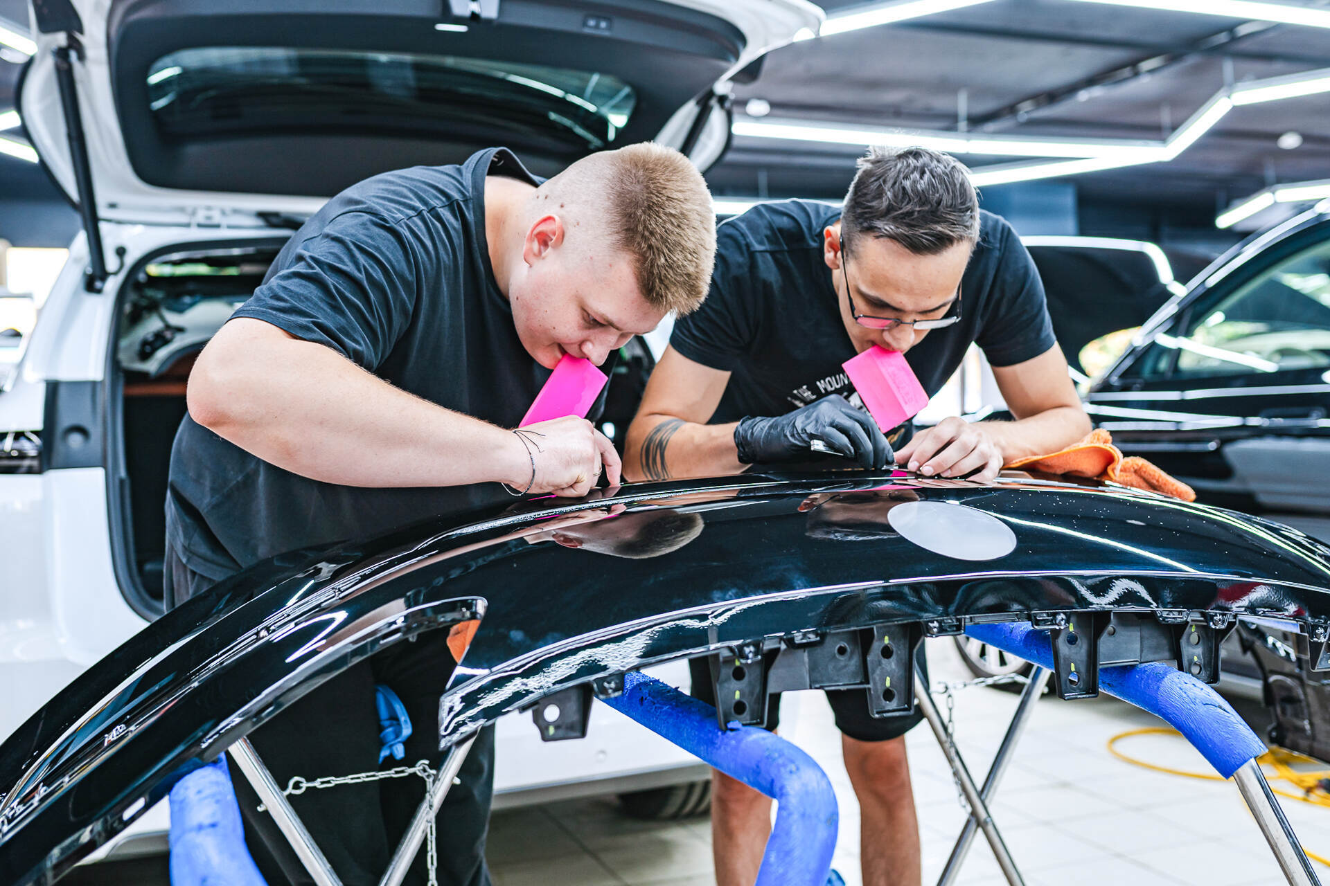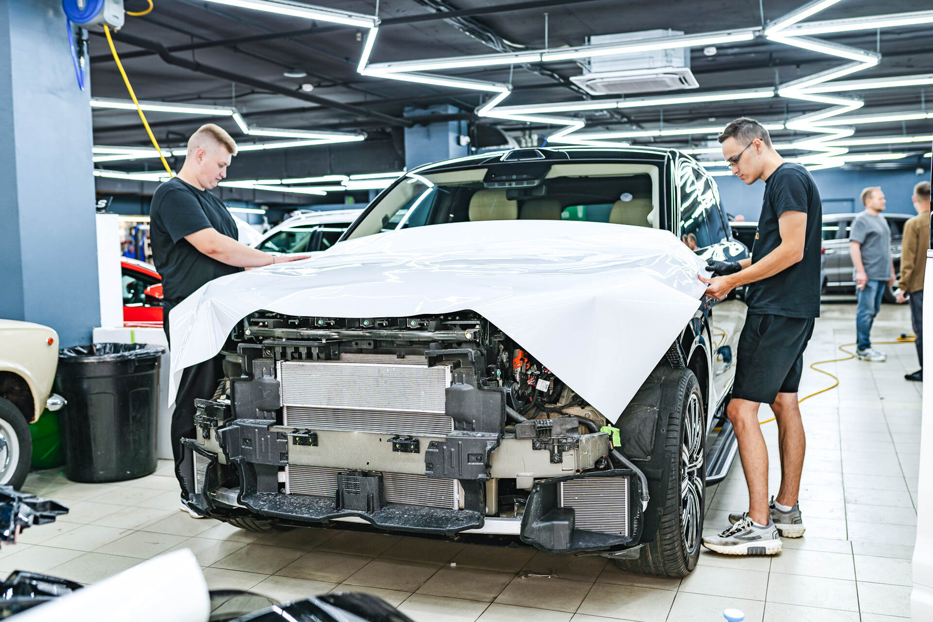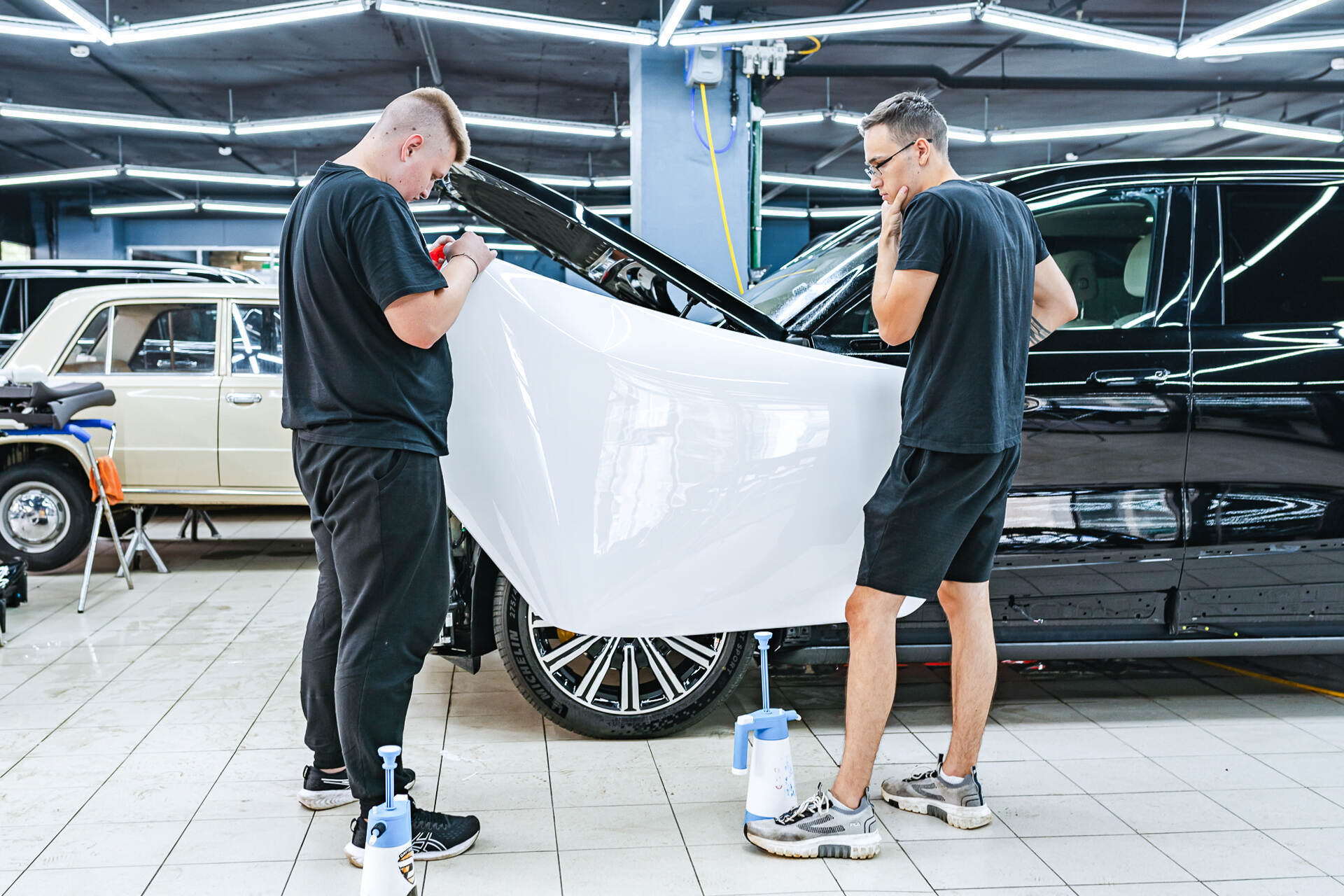 Процесс защиты кузова Denza N9 включает последовательные этапы: работа начинается с тщательной очистки и обезжиривания поверхностей кузова, после чего следует подготовка материала — точный раскрой полиуретанового полотна и обработка фрагментов мыльным раствором для последующего монтажа. Оклейка требует высокого профессионализма: мы осуществляем плотное натяжение покрытия Spectroll Premium с одновременным выгоном воздушных пузырей и излишков влаги специальным ракелем. Лишние участки пленки срезаются прямо на автомобиле лезвием, что гарантирует безупречное прилегание без риска повреждения поверхности ЛКП.