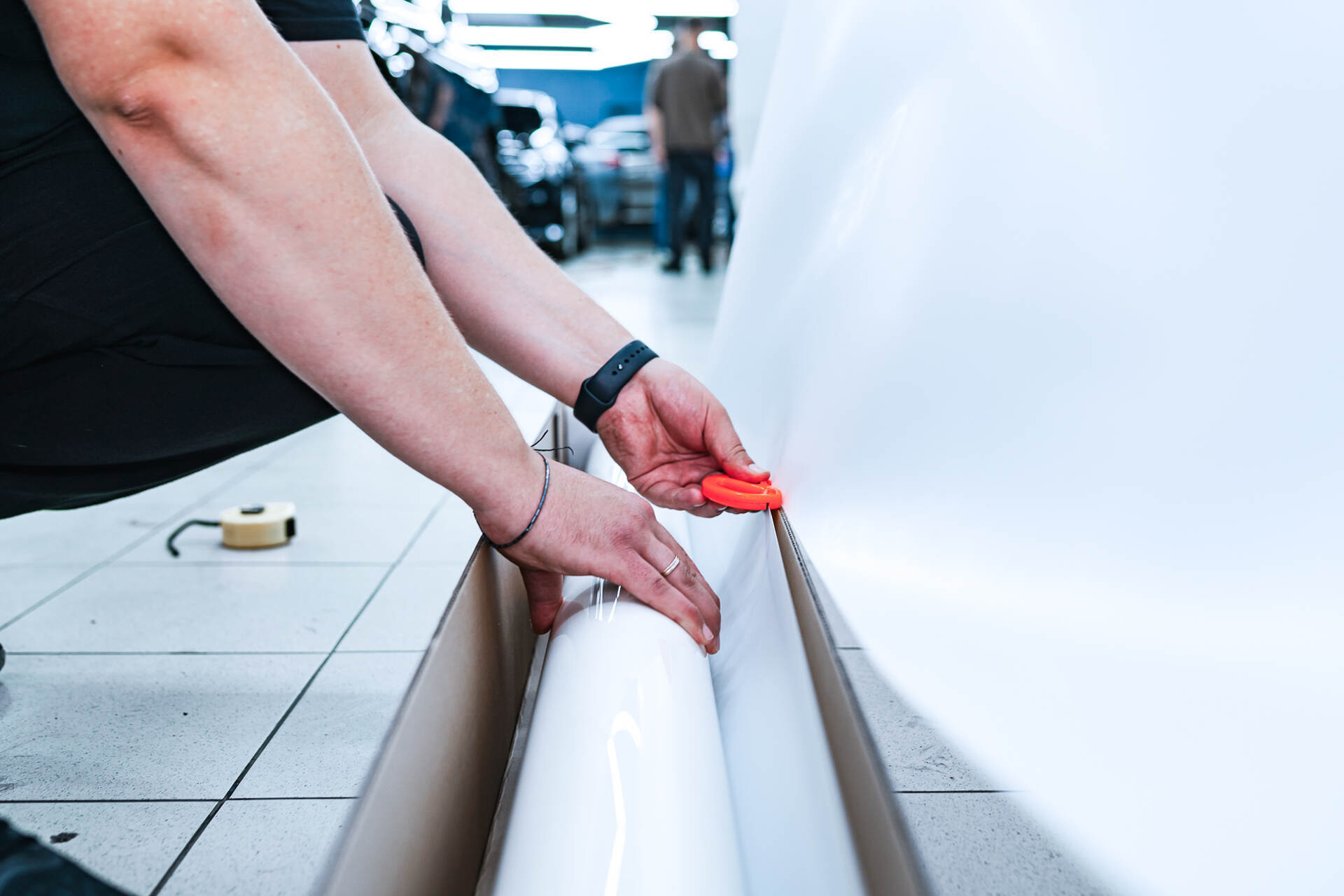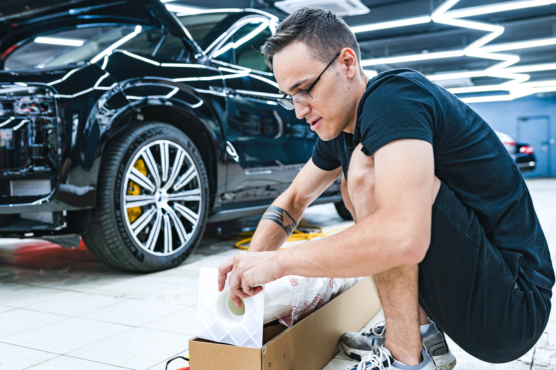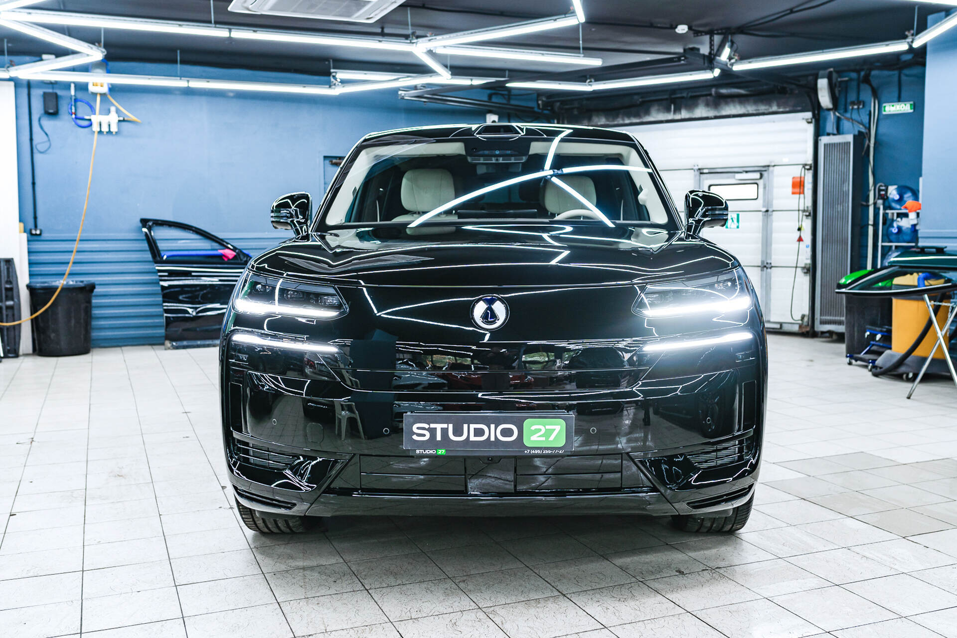 Процесс защиты кузова Denza N9 включает последовательные этапы: работа начинается с тщательной очистки и обезжиривания поверхностей кузова, после чего следует подготовка материала — точный раскрой полиуретанового полотна и обработка фрагментов мыльным раствором для последующего монтажа. Оклейка требует высокого профессионализма: мы осуществляем плотное натяжение покрытия Spectroll Premium с одновременным выгоном воздушных пузырей и излишков влаги специальным ракелем. Лишние участки пленки срезаются прямо на автомобиле лезвием, что гарантирует безупречное прилегание без риска повреждения поверхности ЛКП.