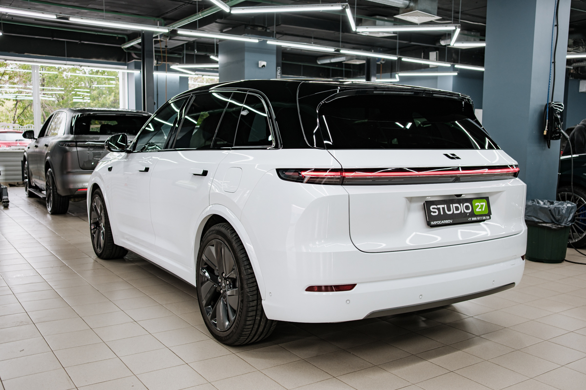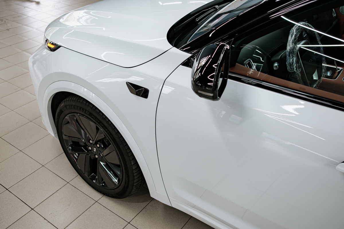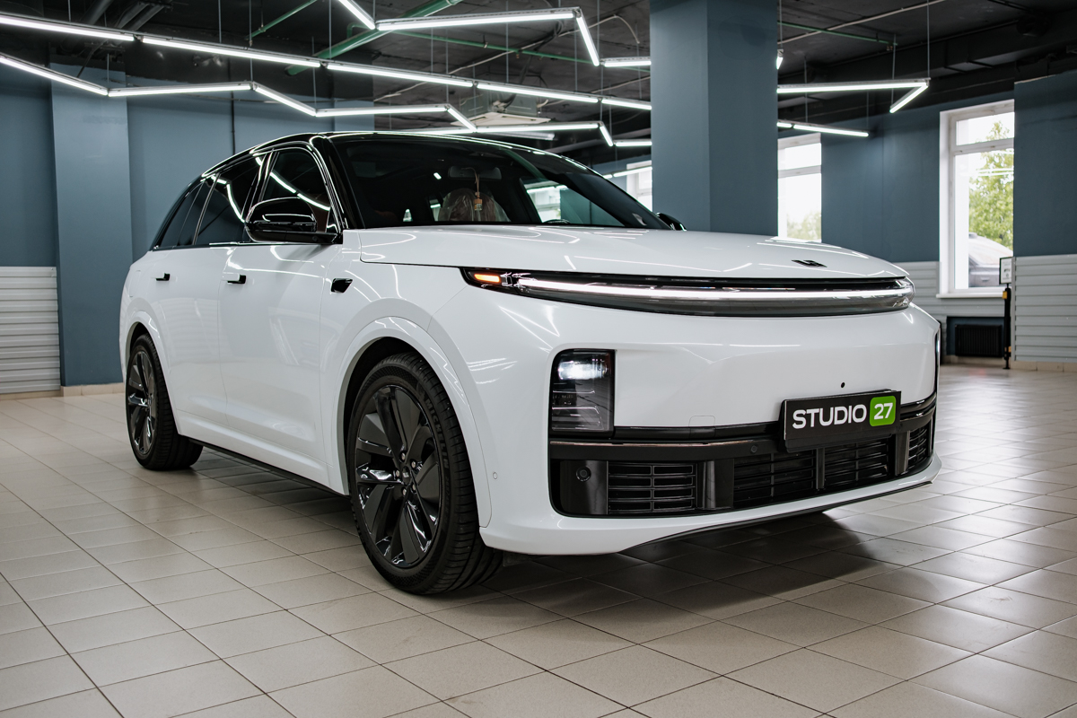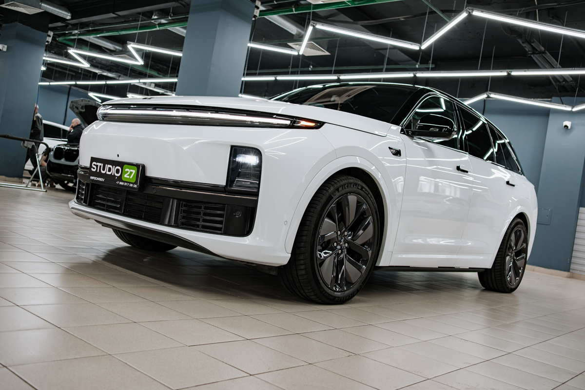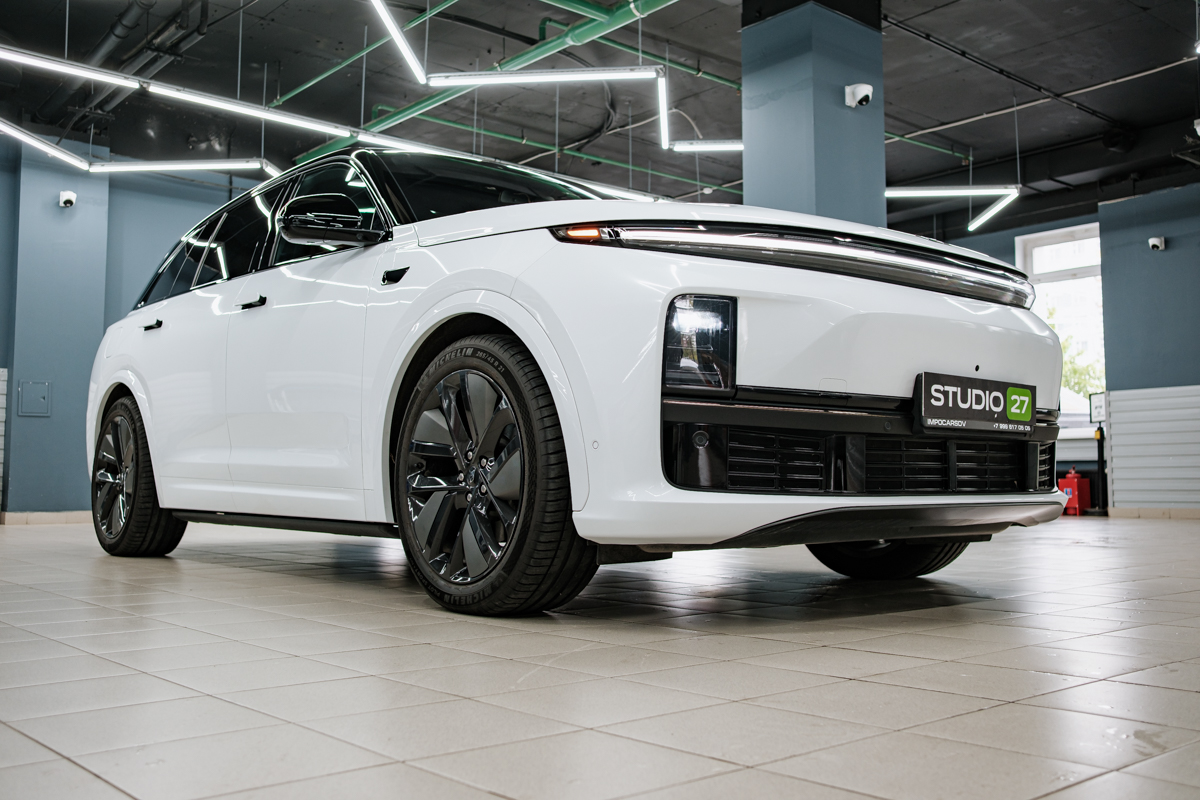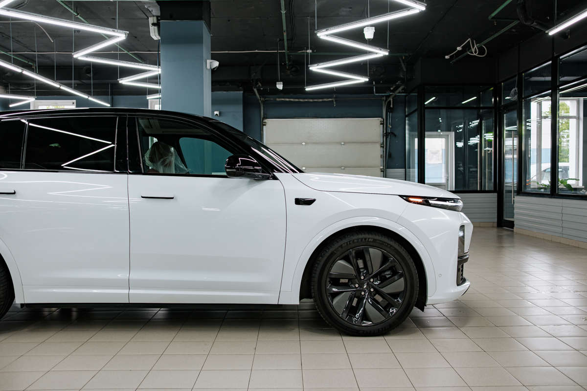 В данном материале мы расскажем, как в нашу детейлинг-студию поступил новенький премиальный китайский внедорожник Lixiang L7, чтобы сохранить безупречный вид лакокрасочного покрытия полной оклейкой кузова защитной полиуретановой пленкой. Причем нижнюю часть кузова мы оклеим прозрачной глянцевой плёнкой, а верхнюю – чёрной, чтобы подчеркнуть контраст. Процедура бронирования кузова предотвращает появление царапин и потертостей от пескоструя и мелкого гравия, которые неизбежно атакуют «отбойную часть» автомобиля на дороге. Для статусного автомобиля уровня Lixiang такая протекция становится необходимой инвестицией, позволяющей поддерживать состояние нового авто в течение долгого времени.