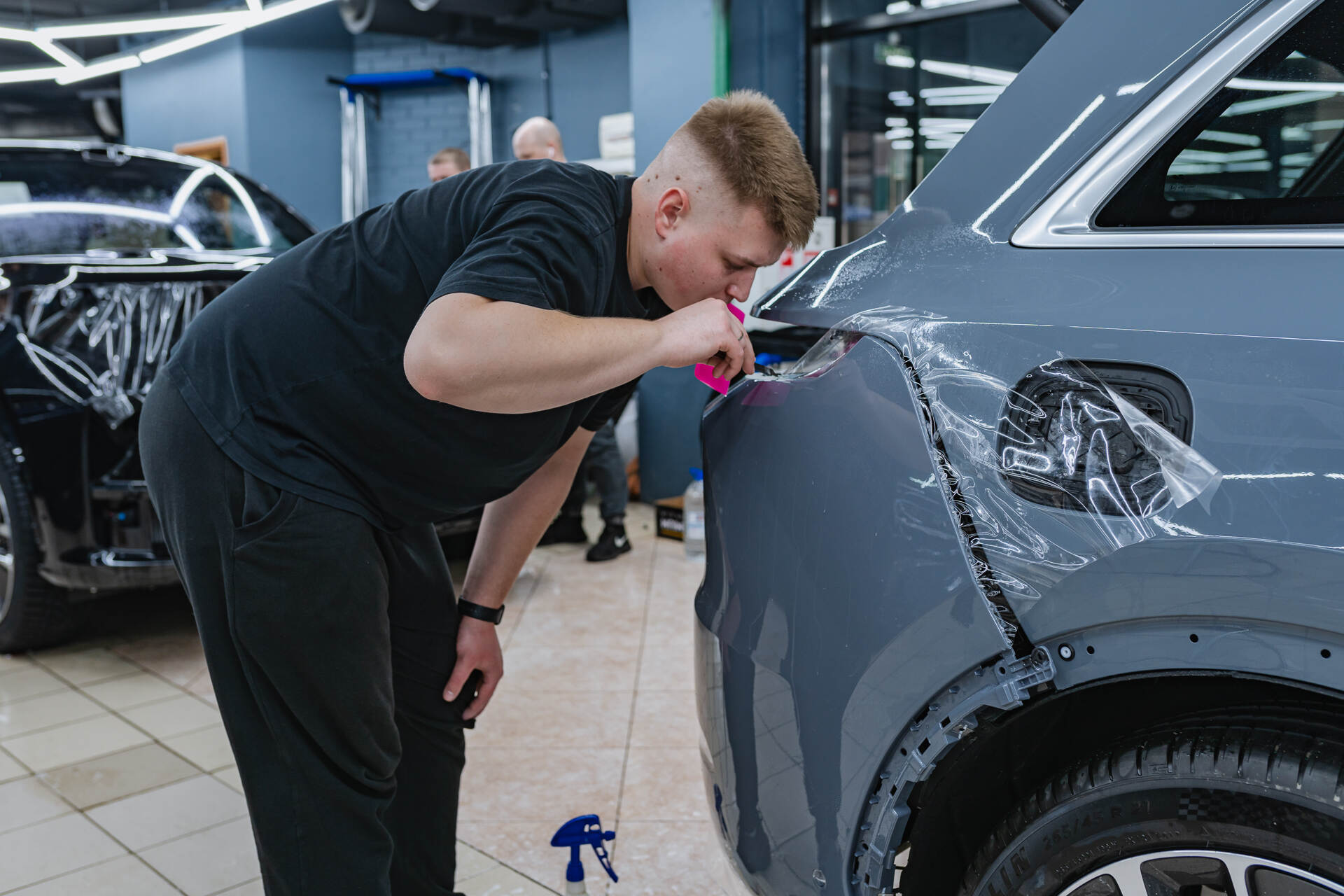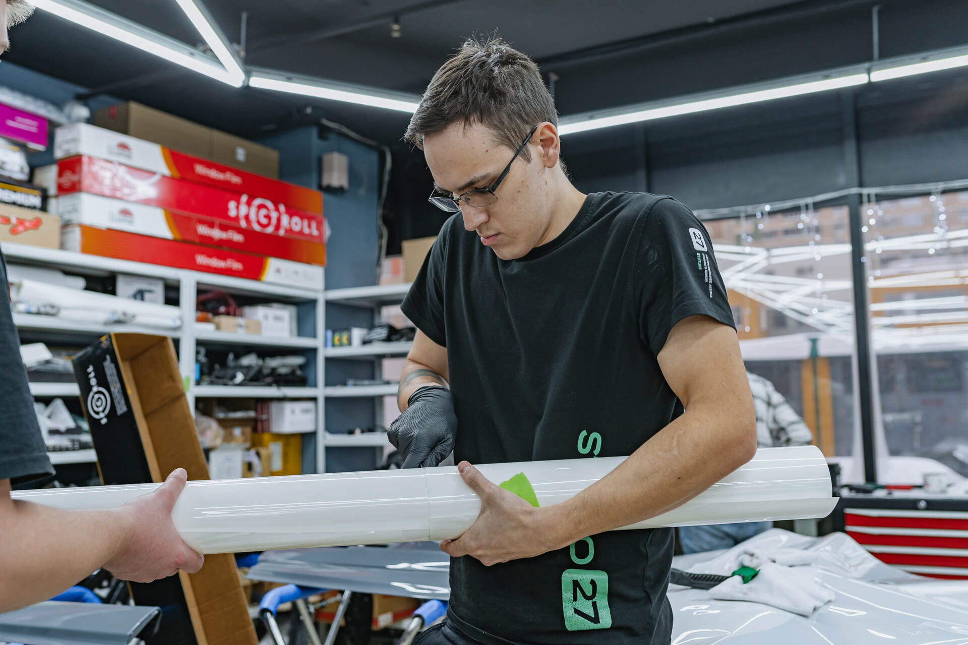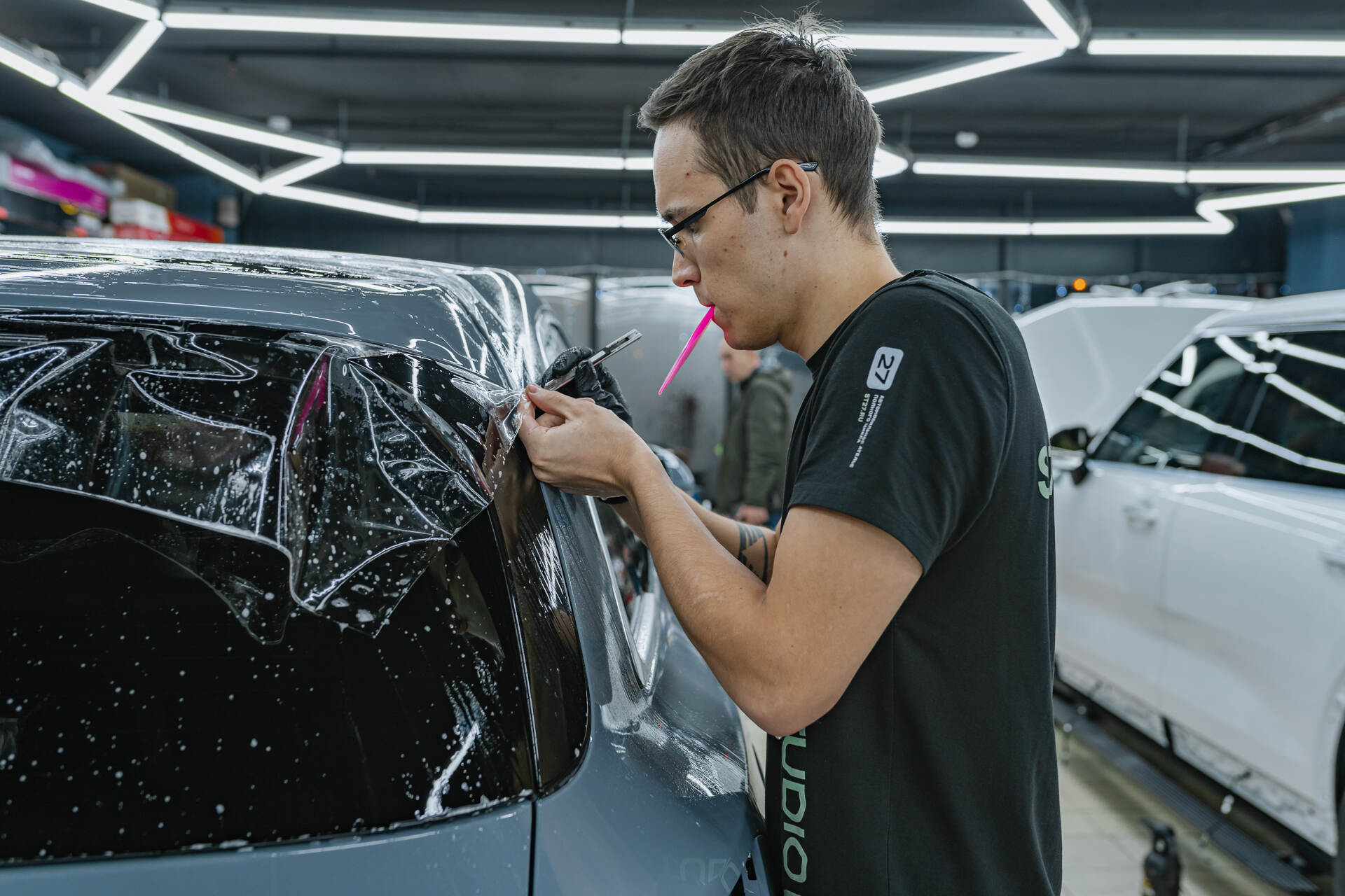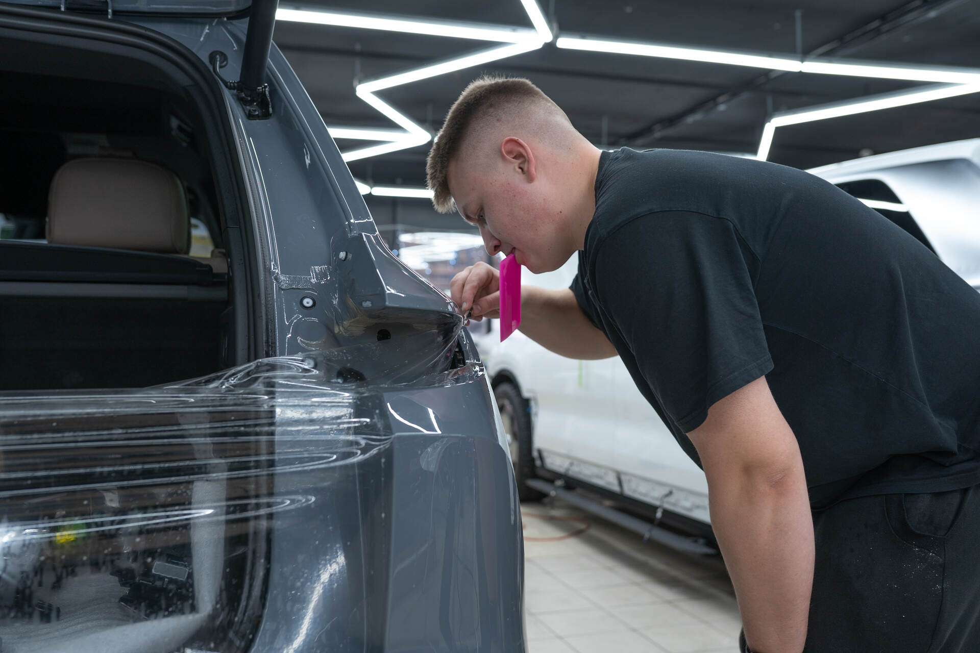 При поклейке полиуретанового покрытия мы используем заготовки, которые ювелирно подгоняем под габариты каждой детали с помощью лезвия. Завершающим этапом становится термическая обработка нанесенной брони промышленным феном: под воздействием высокой температуры пленка Spectroll Premium идеально принимает форму кузова, в точности повторяя все его контуры и изгибы. Такая технология нанесения обеспечивает безупречное прилегание материала по всей площади, превращая защитный слой в единое целое с автомобилем.