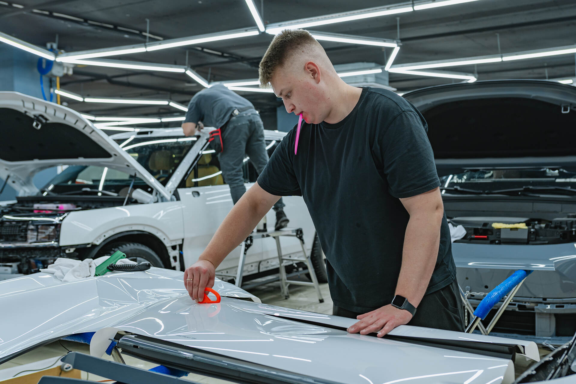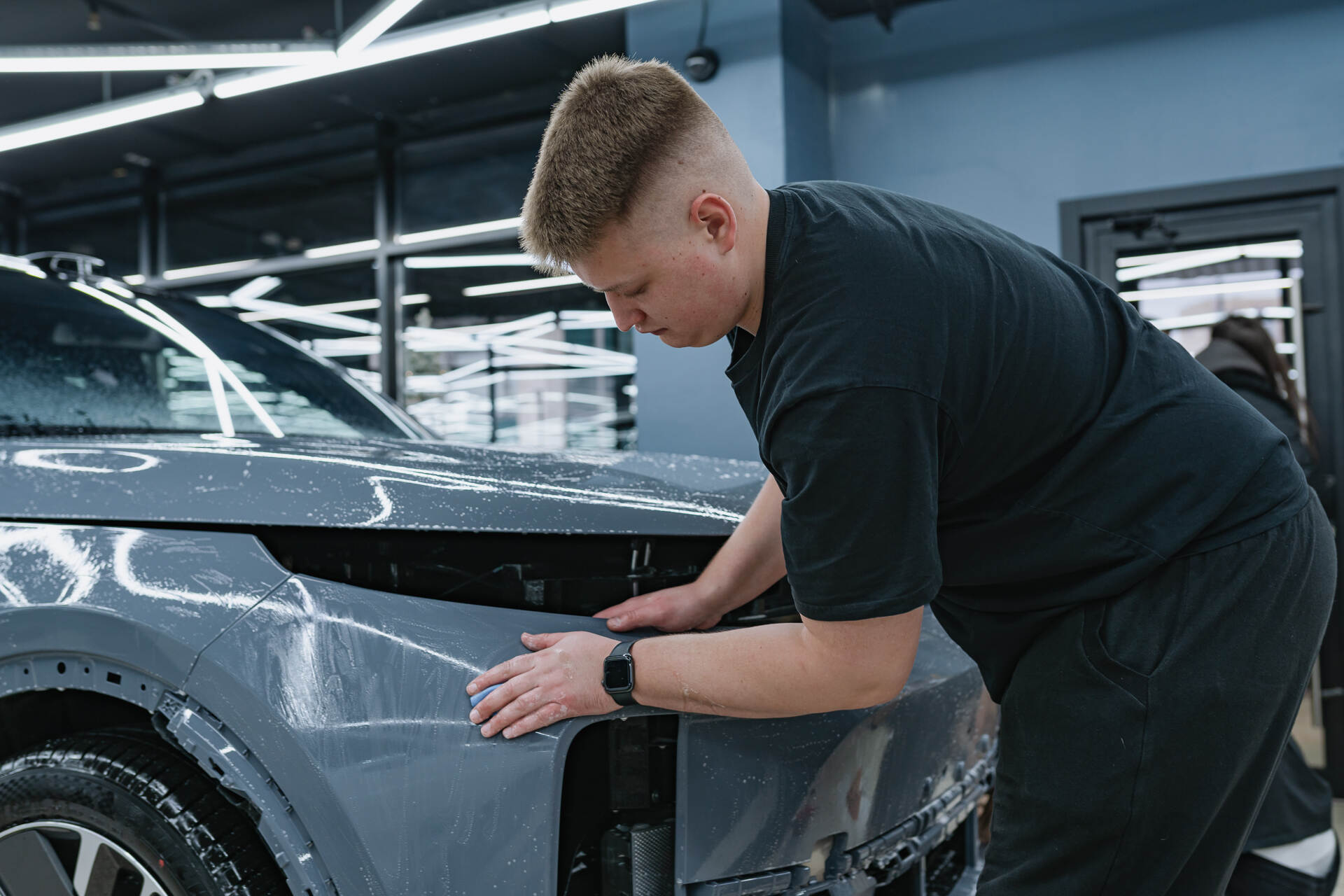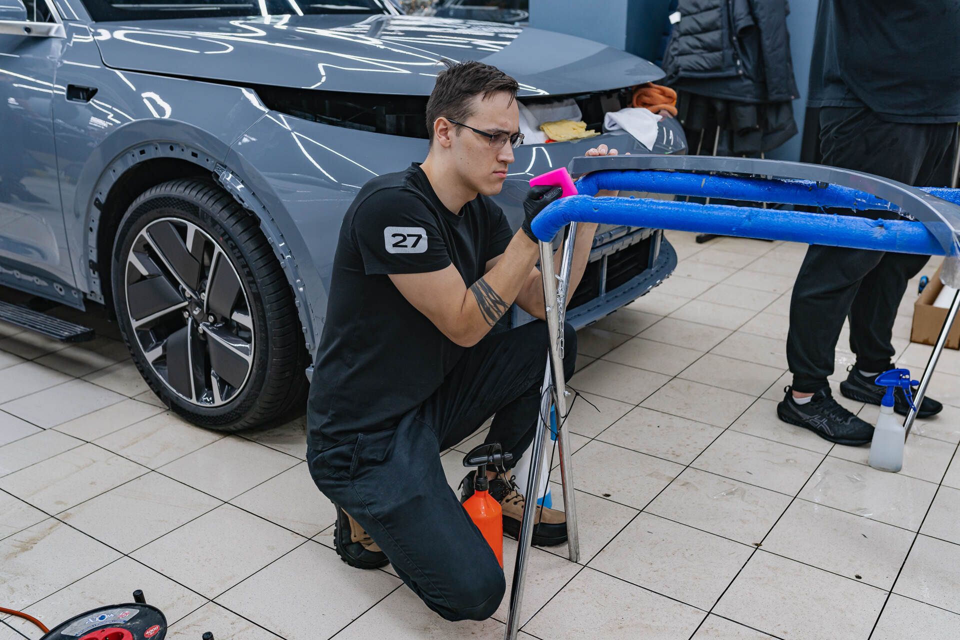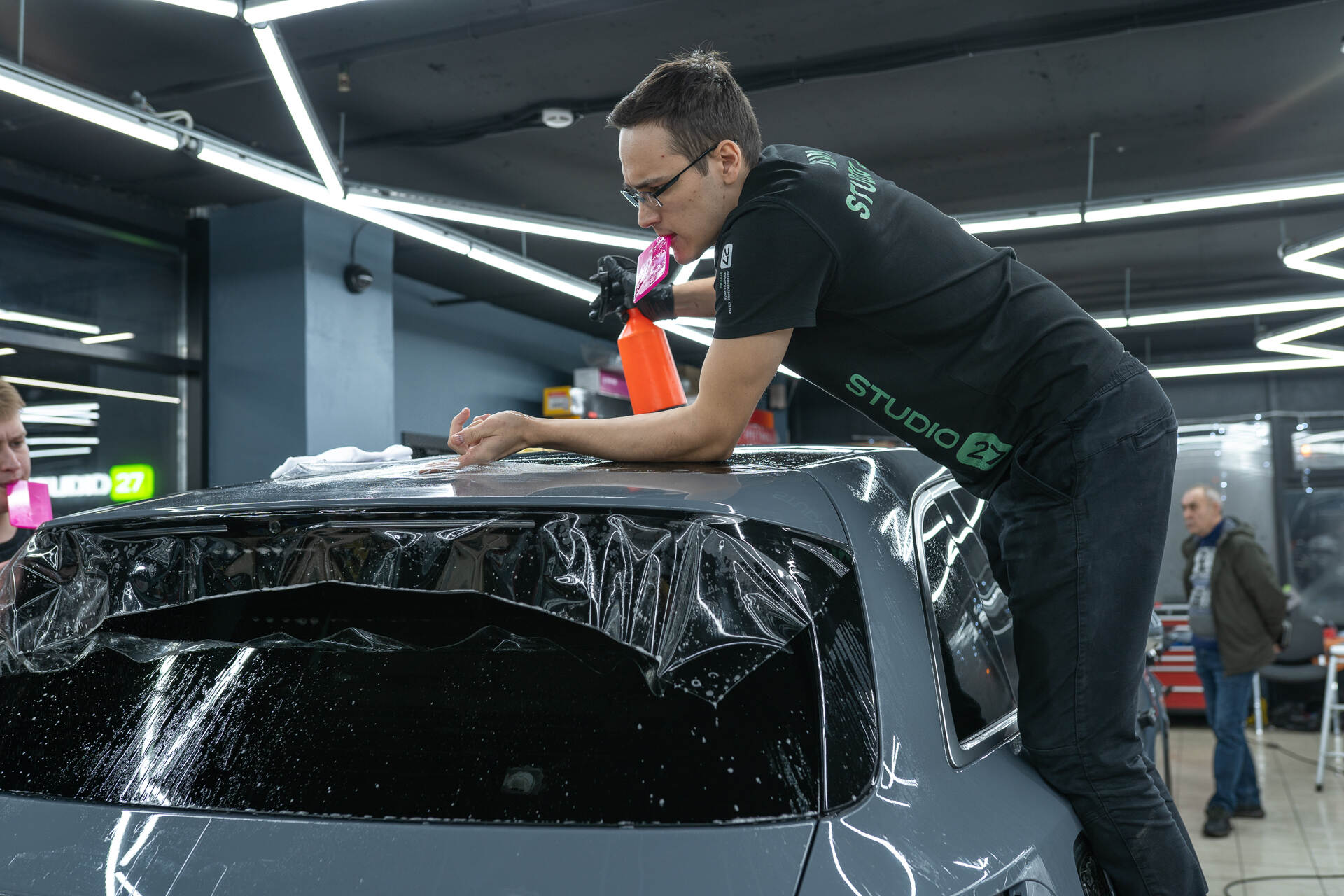При поклейке полиуретанового покрытия мы используем заготовки, которые ювелирно подгоняем под габариты каждой детали с помощью лезвия. Завершающим этапом становится термическая обработка нанесенной брони промышленным феном: под воздействием высокой температуры пленка Spectroll Premium идеально принимает форму кузова, в точности повторяя все его контуры и изгибы. Такая технология нанесения обеспечивает безупречное прилегание материала по всей площади, превращая защитный слой в единое целое с автомобилем.