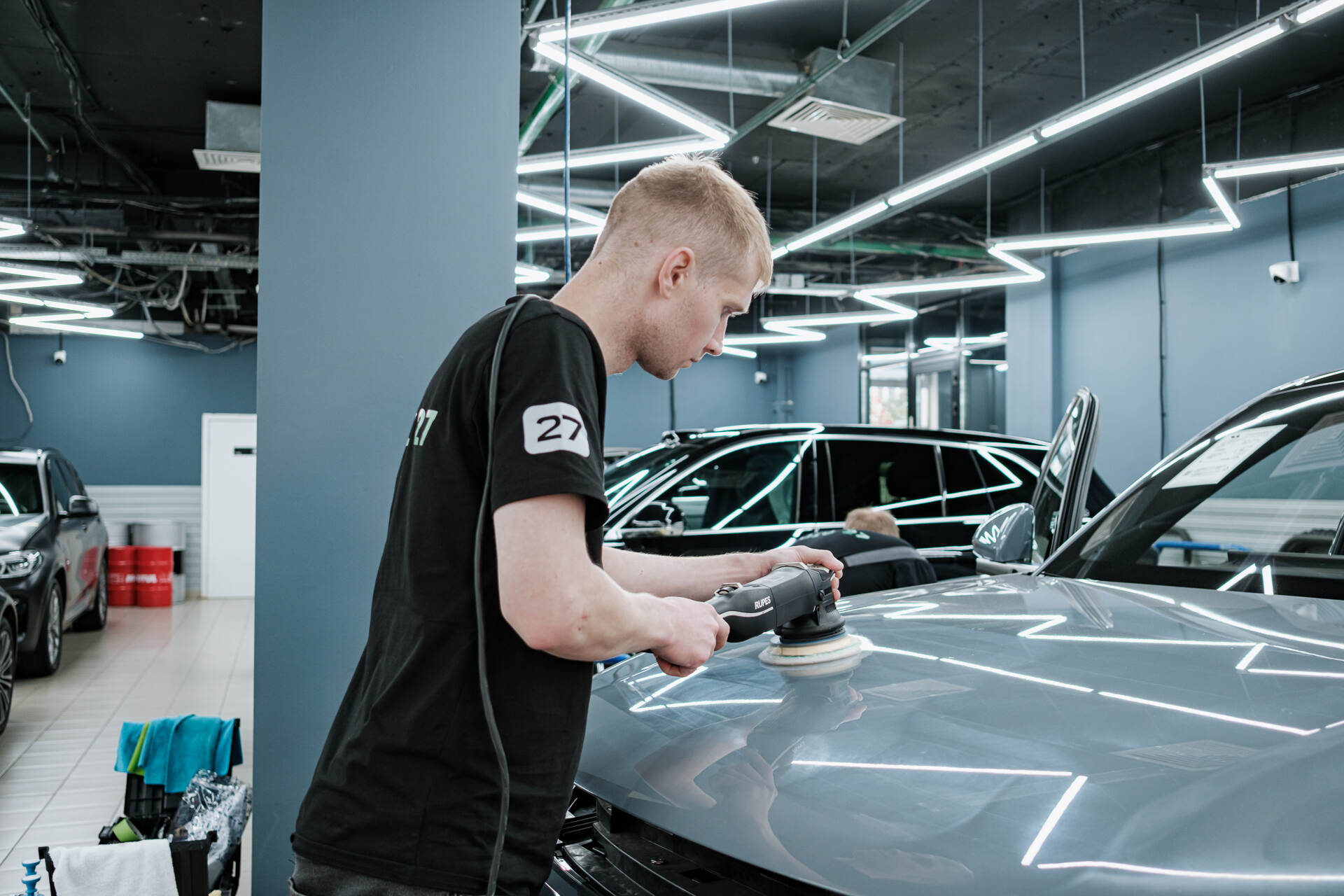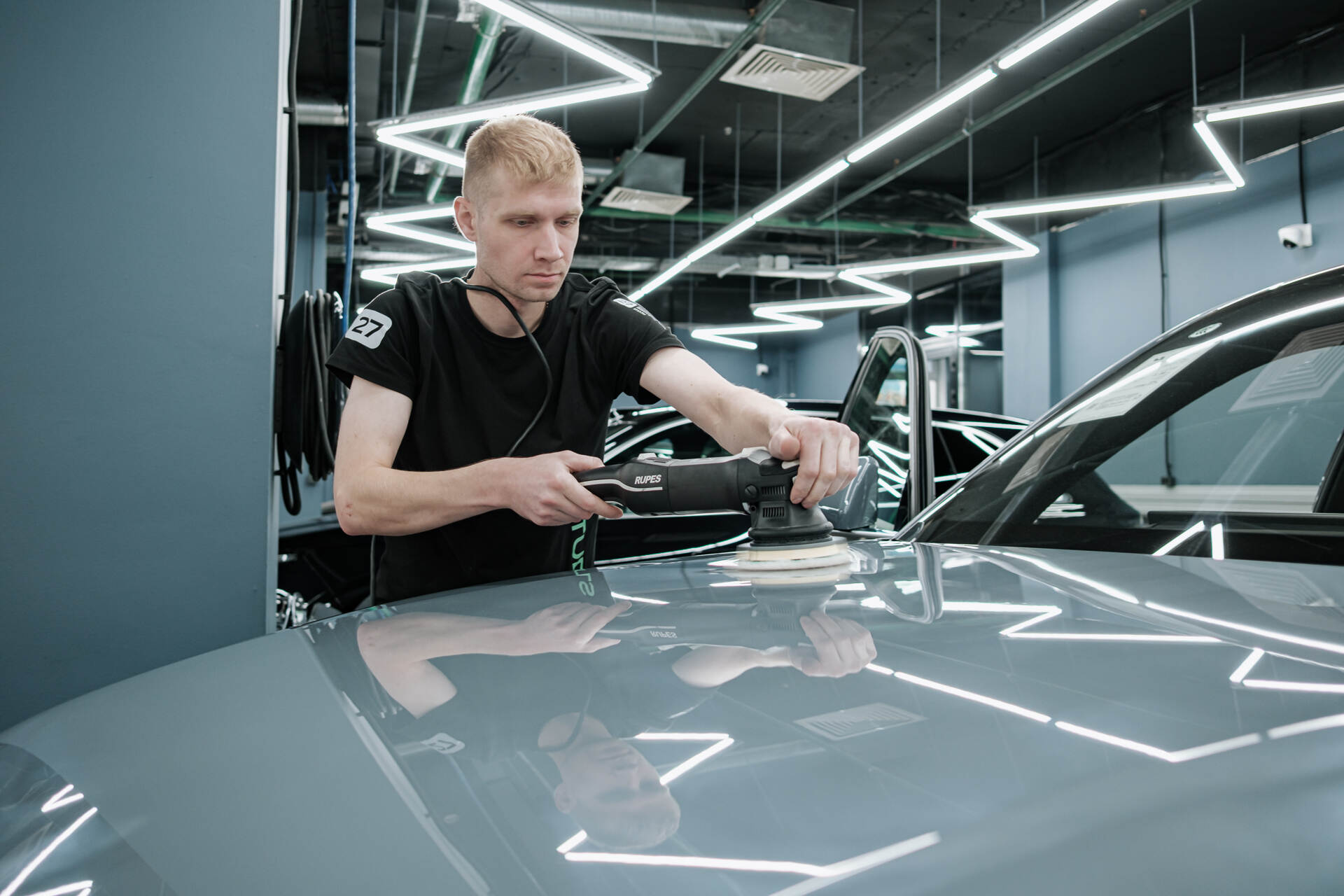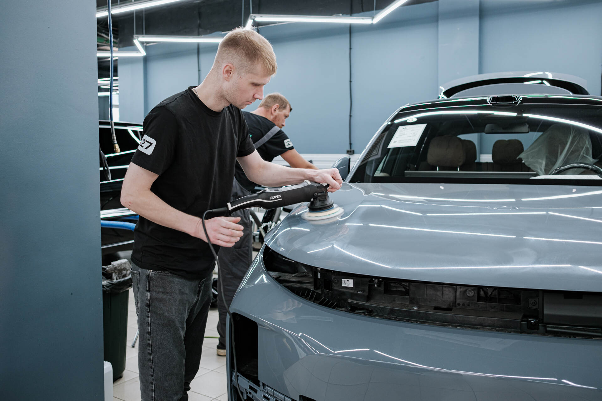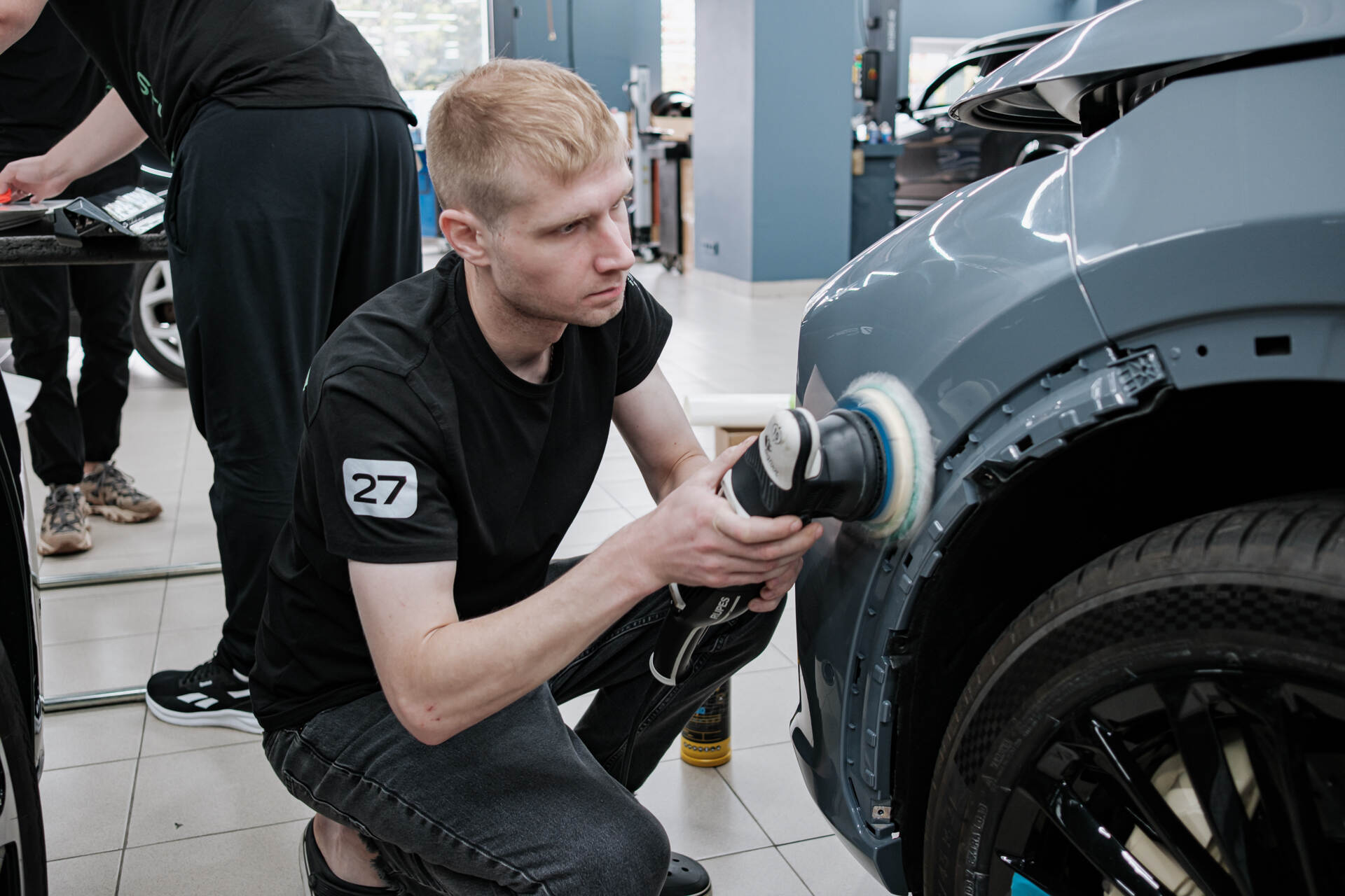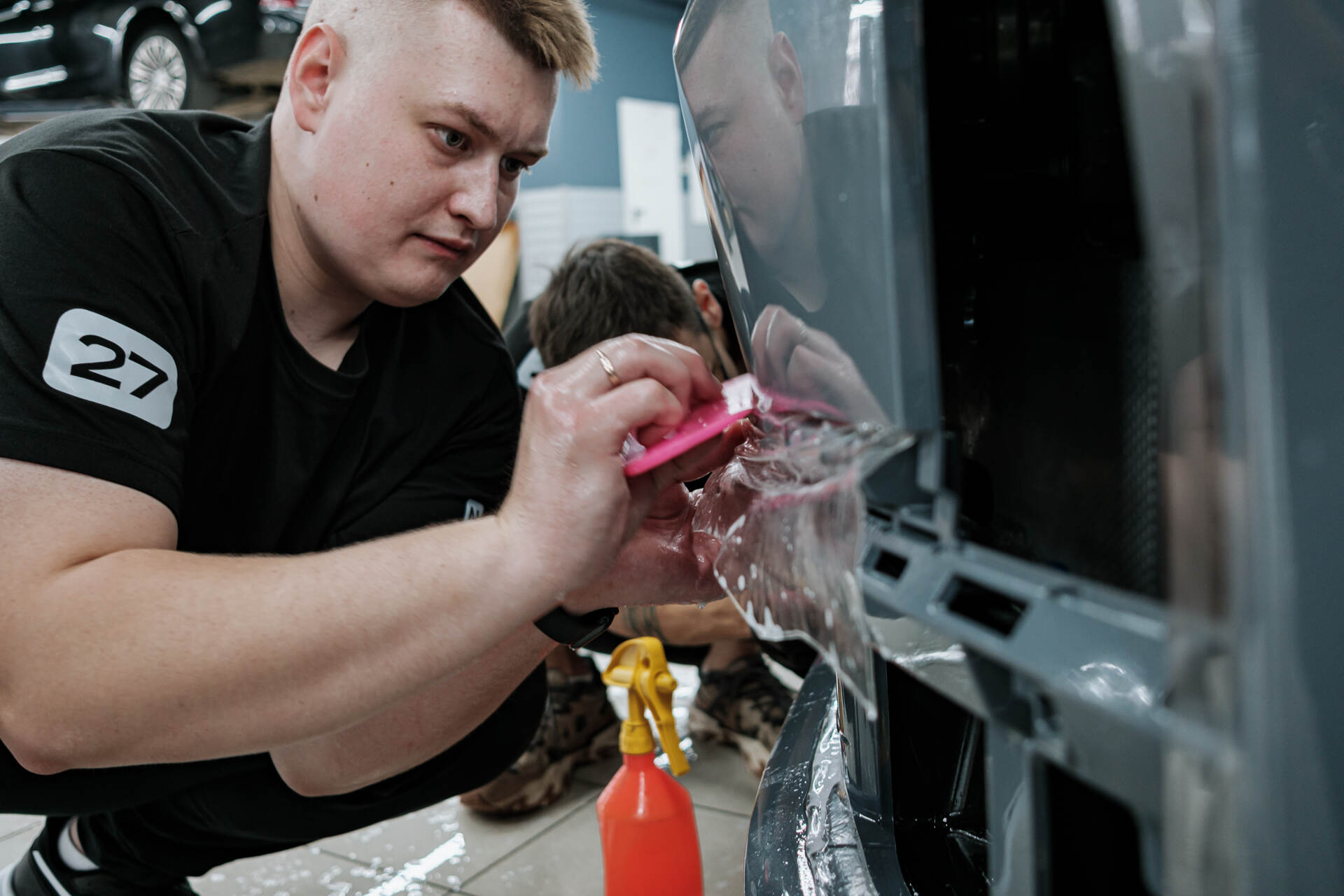 Оклейка Lixiang L7 требует серьёзных профессиональных навыков: мы не просто наклеиваем материал, а фактически натягиваем полиуретановое покрытие Spectroll Premium, одновременно удаляя воздушные пузыри и излишки влаги ракелем. Сложные рельефы и изгибы кузова обрабатываются специализированным инструментом с мягкими насадками, что обеспечивает безупречный результат без риска повреждений. Завершающей операцией становится термическая обработка покрытия строительным феном, активирующая защитные характеристики материала. После такого комплекса работ Lixiang L7 получает внушительную защиту от сколов и царапин, сохранение оригинального ЛКП на длительный срок и гарантированную долговечность покрытия. Каждая стадия процесса выполняется с ювелирной точностью, что отличает работу сертифицированной студии от любительской оклейки.
