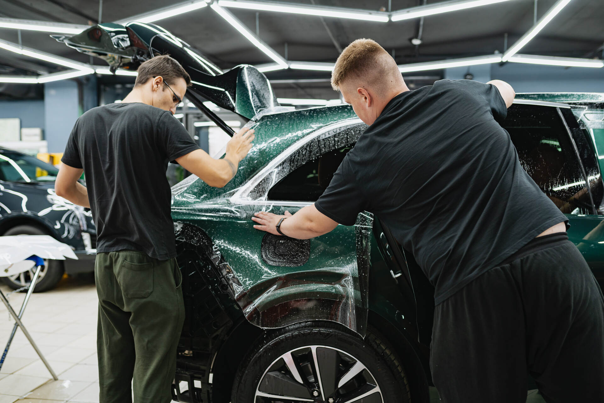 Мастера срезают остатки плёнки лезвием прямо на автомобиле, но не стоит переживать – никаких следов на кузове не останется, ведь мы в своей работе профессионалы и гарантируем высокое качество результата. Завершается процесс оклейки кузова термической обработкой промышленным феном, которая активирует защитные свойства полиуретана. В итоге Lixiang L6 получает надежную броню от сколов, сохраняя целостность заводской изумрудной краски на долгие годы. Ювелирная точность исполнения на каждом этапе подчеркивает профессионализм нашей автостудии и обеспечивает долговечность покрытия.