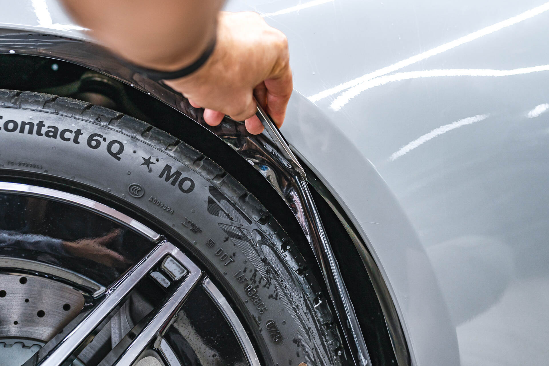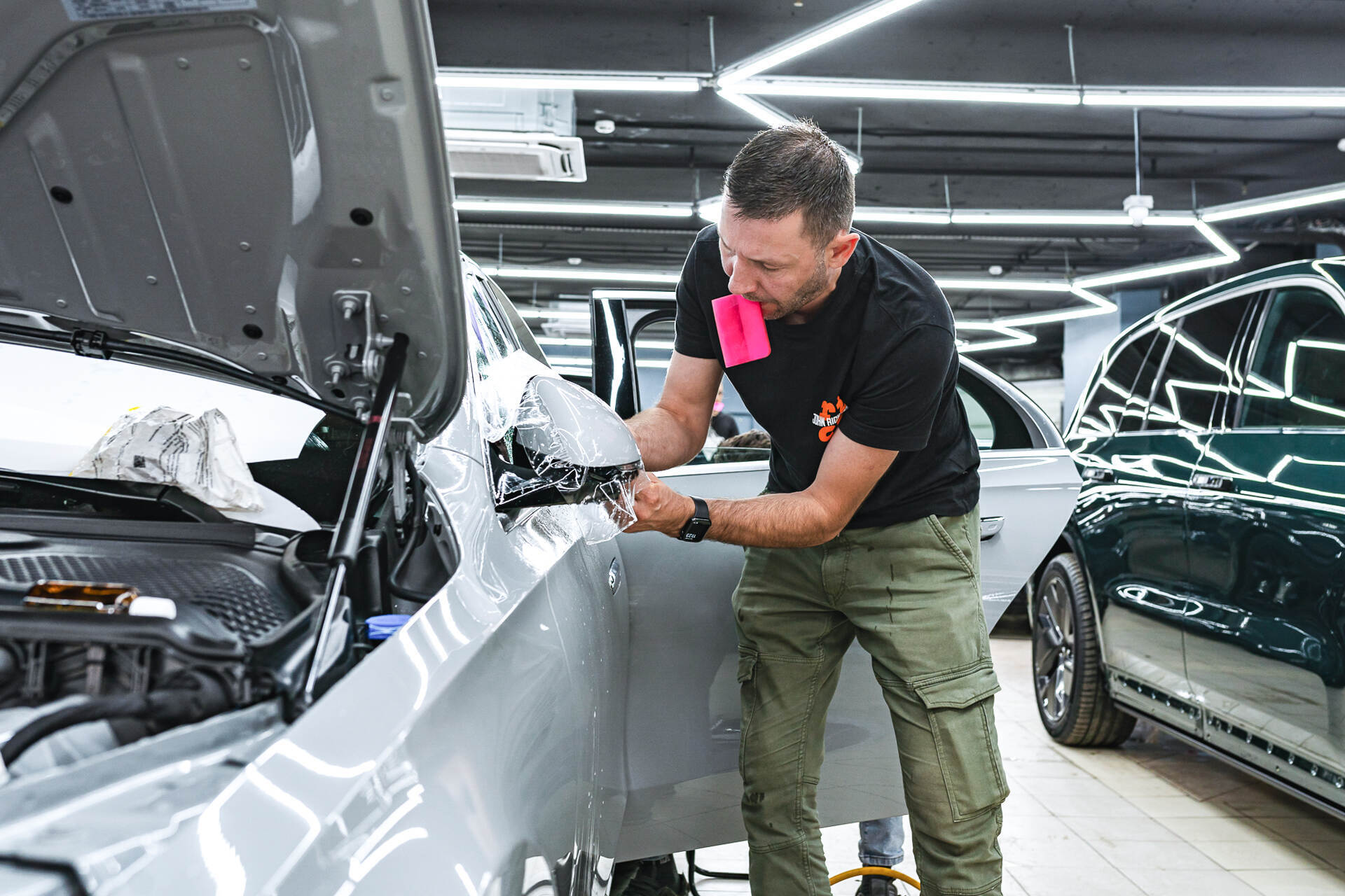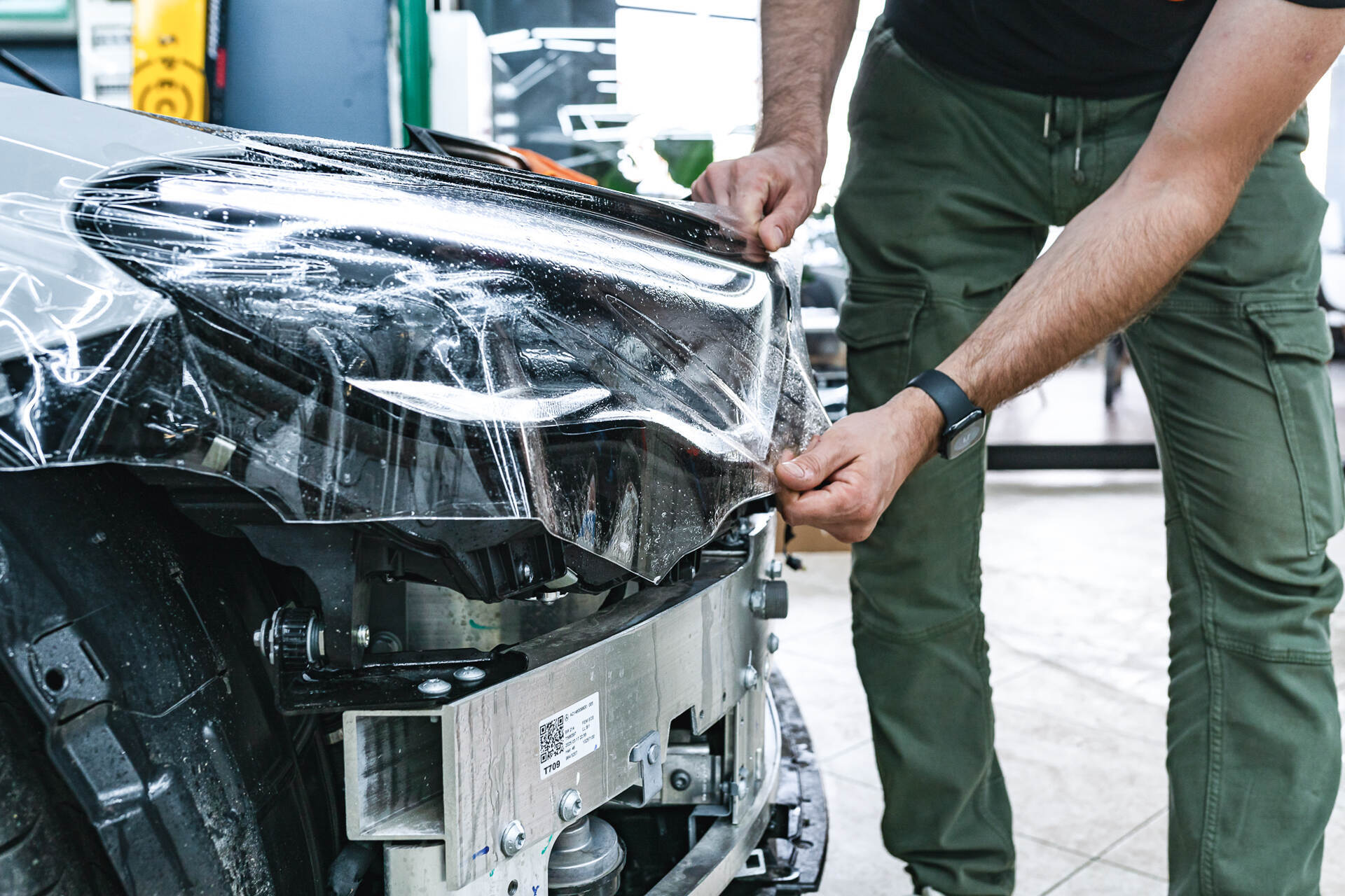 Сам процесс оклейки зон риска кузова Mercedes-Benz E W214 начинается с подготовительных работ: тщательной очистки, мойки и обезжиривания поверхностей бампера, фар, капота, стоек, передних крыльев, зеркал заднего вида и зон вокруг дверных ручек. Именно эти элементы, составляющие отбойную часть, будут защищены пленкой Spectroll Premium, поскольку они подвергаются наибольшему внешнему воздействию. В результате передняя часть автомобиля получает полную полиуретановую защиту, обладающую функцией самовосстановления. Например, при попадании щебня материал поглощает удар, и, хотя на поверхности может остаться временный след, все подобные повреждения постепенно исчезают без постороннего вмешательства, не оставляя в дальнейшем видимых следов.