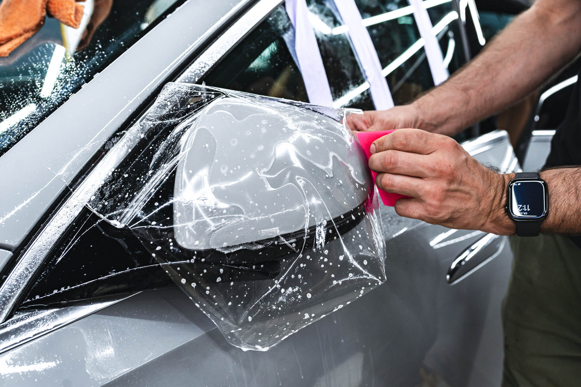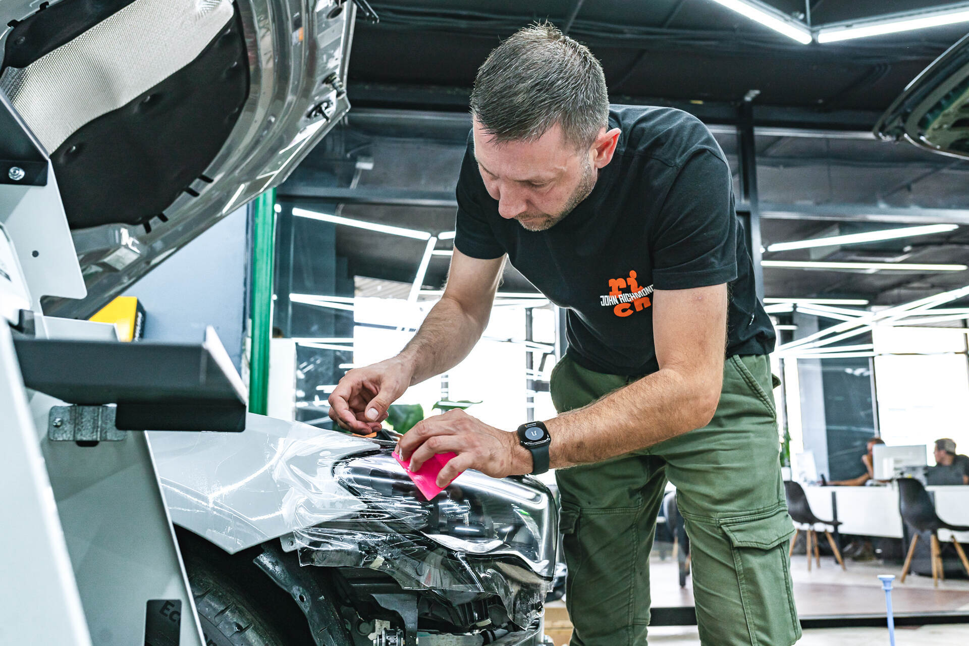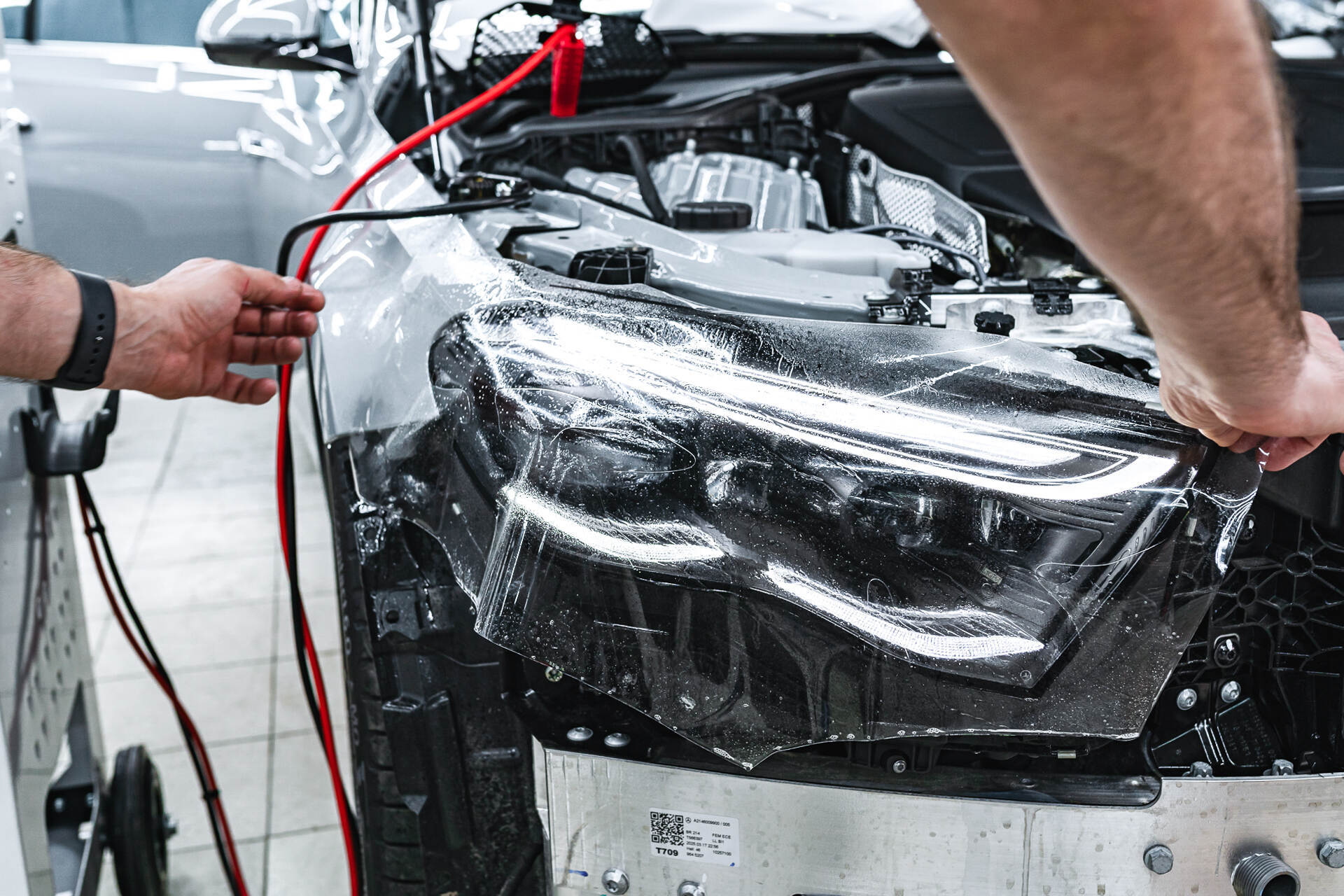 Сам процесс оклейки зон риска кузова Mercedes-Benz E W214 начинается с подготовительных работ: тщательной очистки, мойки и обезжиривания поверхностей бампера, фар, капота, стоек, передних крыльев, зеркал заднего вида и зон вокруг дверных ручек. Именно эти элементы, составляющие отбойную часть, будут защищены пленкой Spectroll Premium, поскольку они подвергаются наибольшему внешнему воздействию. В результате передняя часть автомобиля получает полную полиуретановую защиту, обладающую функцией самовосстановления. Например, при попадании щебня материал поглощает удар, и, хотя на поверхности может остаться временный след, все подобные повреждения постепенно исчезают без постороннего вмешательства, не оставляя в дальнейшем видимых следов.