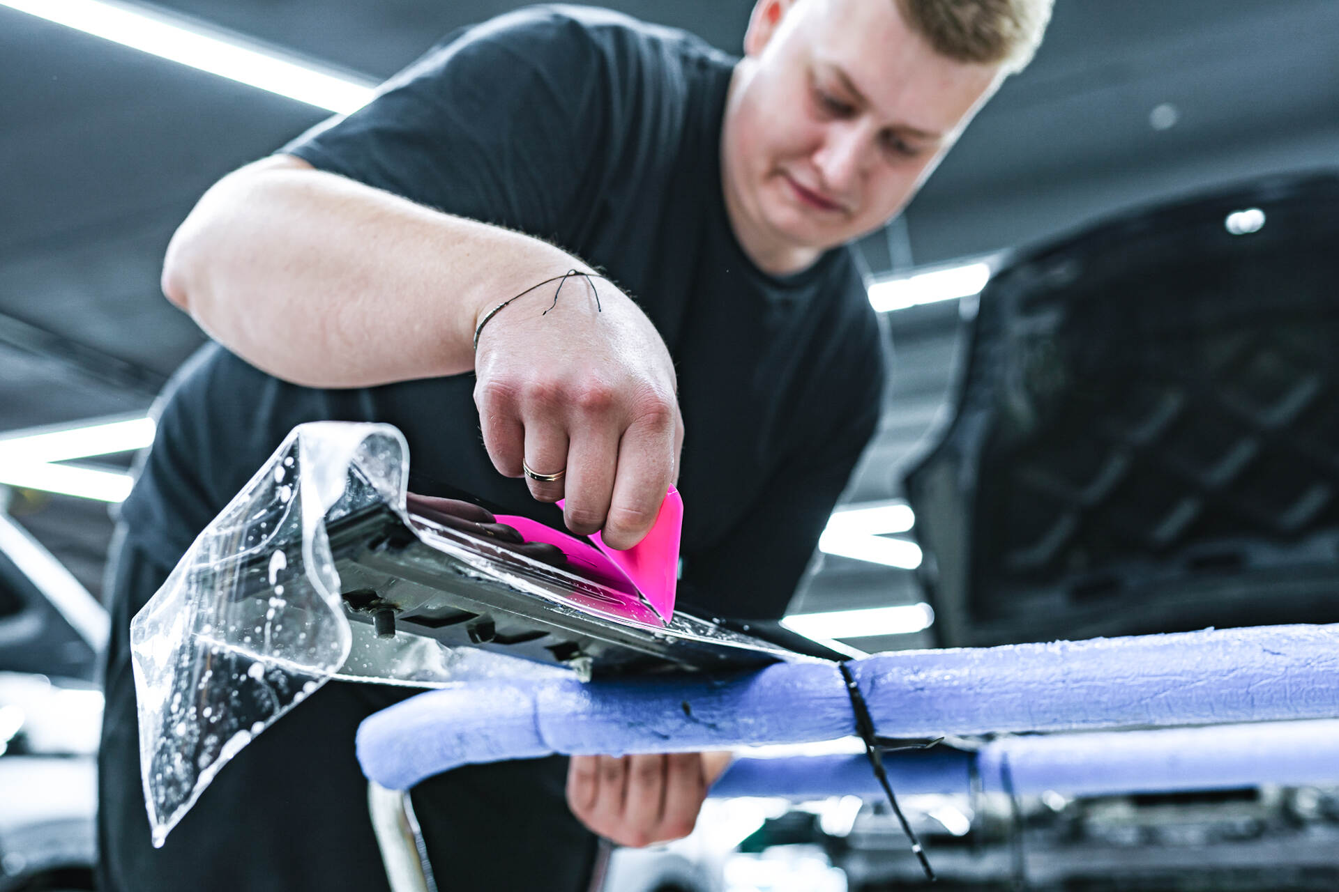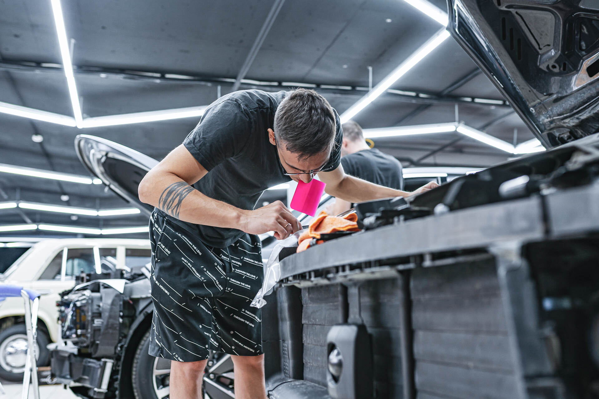 Процесс бронирования Porsche Cayenne стартует с глубокой очистки поверхностей автомобиля и точного раскроя материала. Чтобы добиться максимальной долговечности защиты, мы частично разбираем кузов, что позволяет надежно завернуть края пленки вовнутрь. Во время монтажа Spectroll Premium аккуратно распределяется по деталям с использованием мыльного раствора, требуя от мастера ювелирной точности при работе ракелем для удаления влаги и воздуха. Такой профессиональный подход гарантирует идеальное прилегание полиуретана, который становится невидимой «второй кожей» автомобиля.