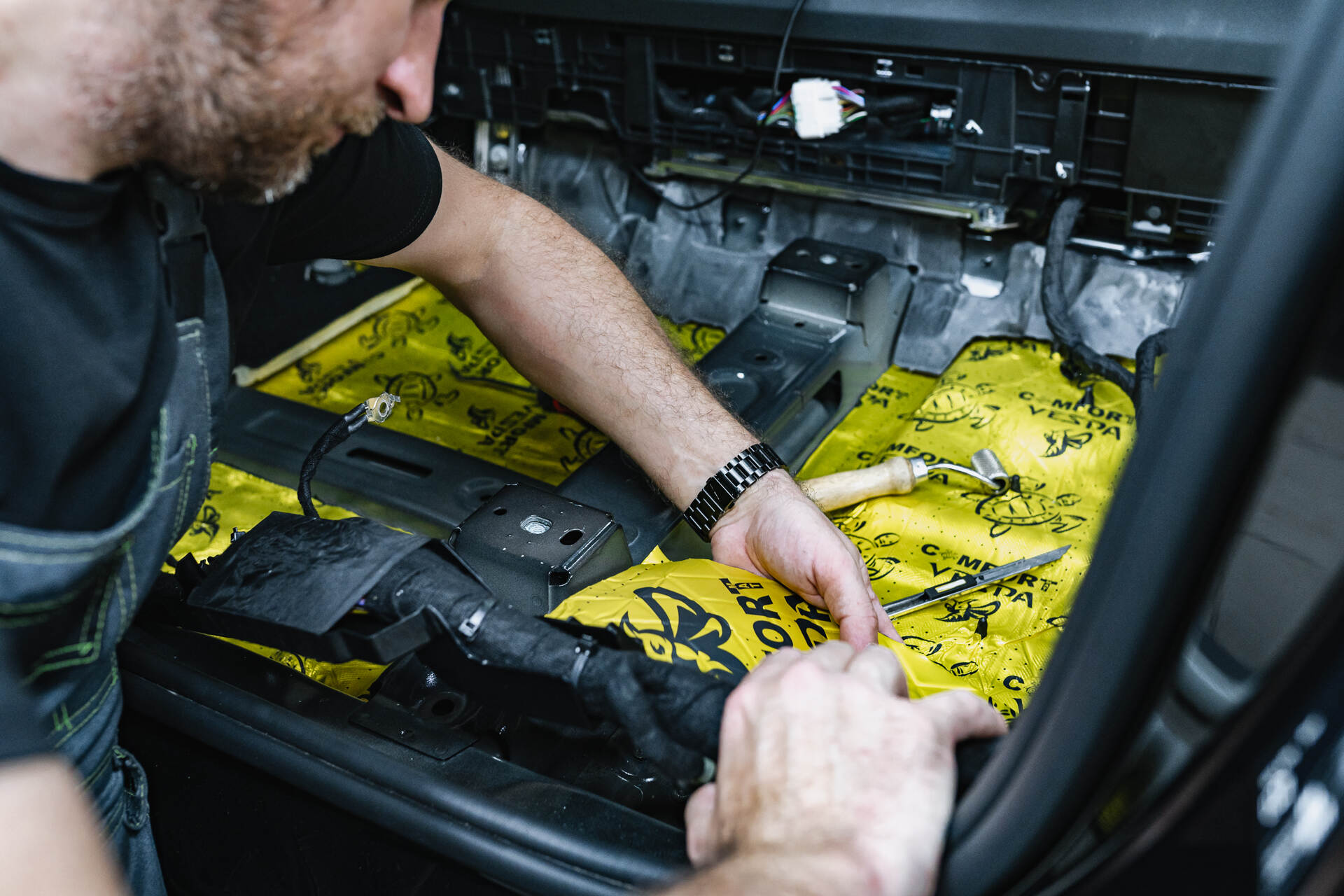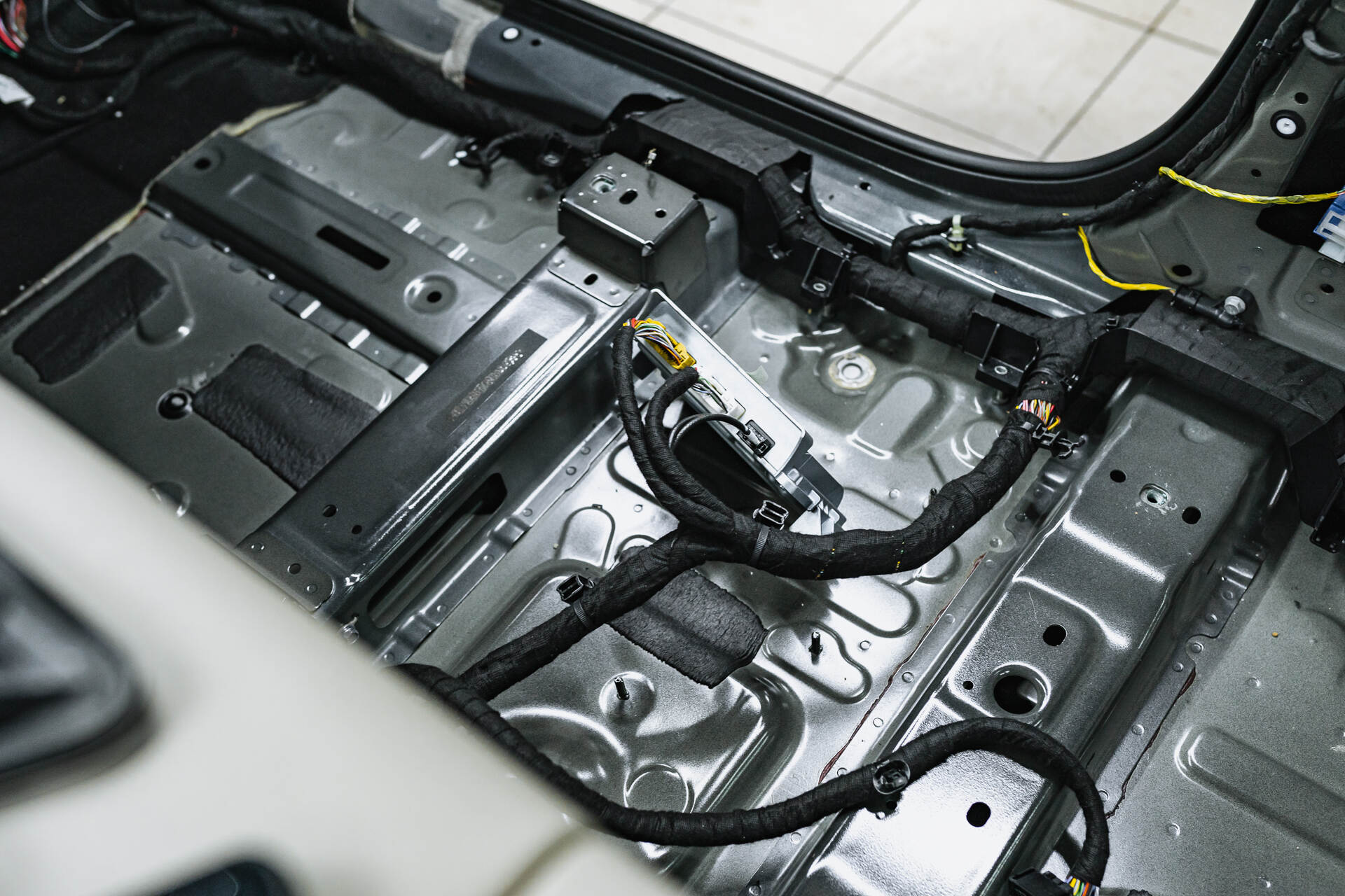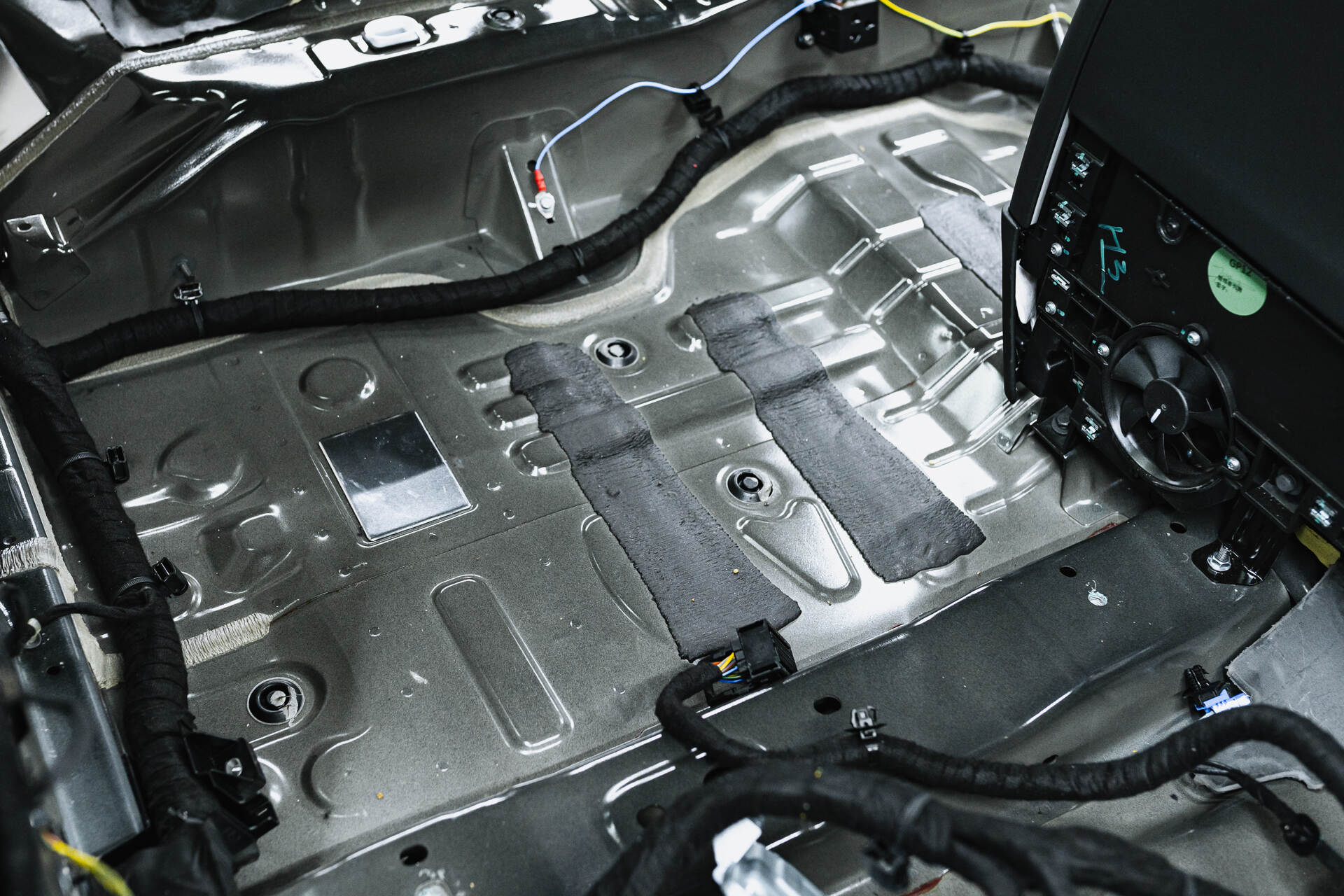 Процесс комплексной шумоизоляции Lixiang L7 стартует с работы над колёсными арками. Мы демонтируем колёса и подкрылки, после чего укладываем высококачественный вибропласт в два плотных слоя, тщательно подгоняя материал и прокатывая его специальным роликом для максимального прилегания. Шумоизоляция салона и дверей выполняется параллельно, для этого мы аккуратно разбираем салон: снимаем дверные карты, убираем кресла и элементы обивки. Затем, по аналогии с арками, укладываем листы вибропласта на подготовленные поверхности. Поверх вибропласта мы наносим слой вспененного бипласта для дополнительного поглощения шумов. После завершения всех работ салон собирается в обратном порядке, и автомобиль возвращается к своему первоначальному виду, но с принципиально новым уровнем акустического комфорта.