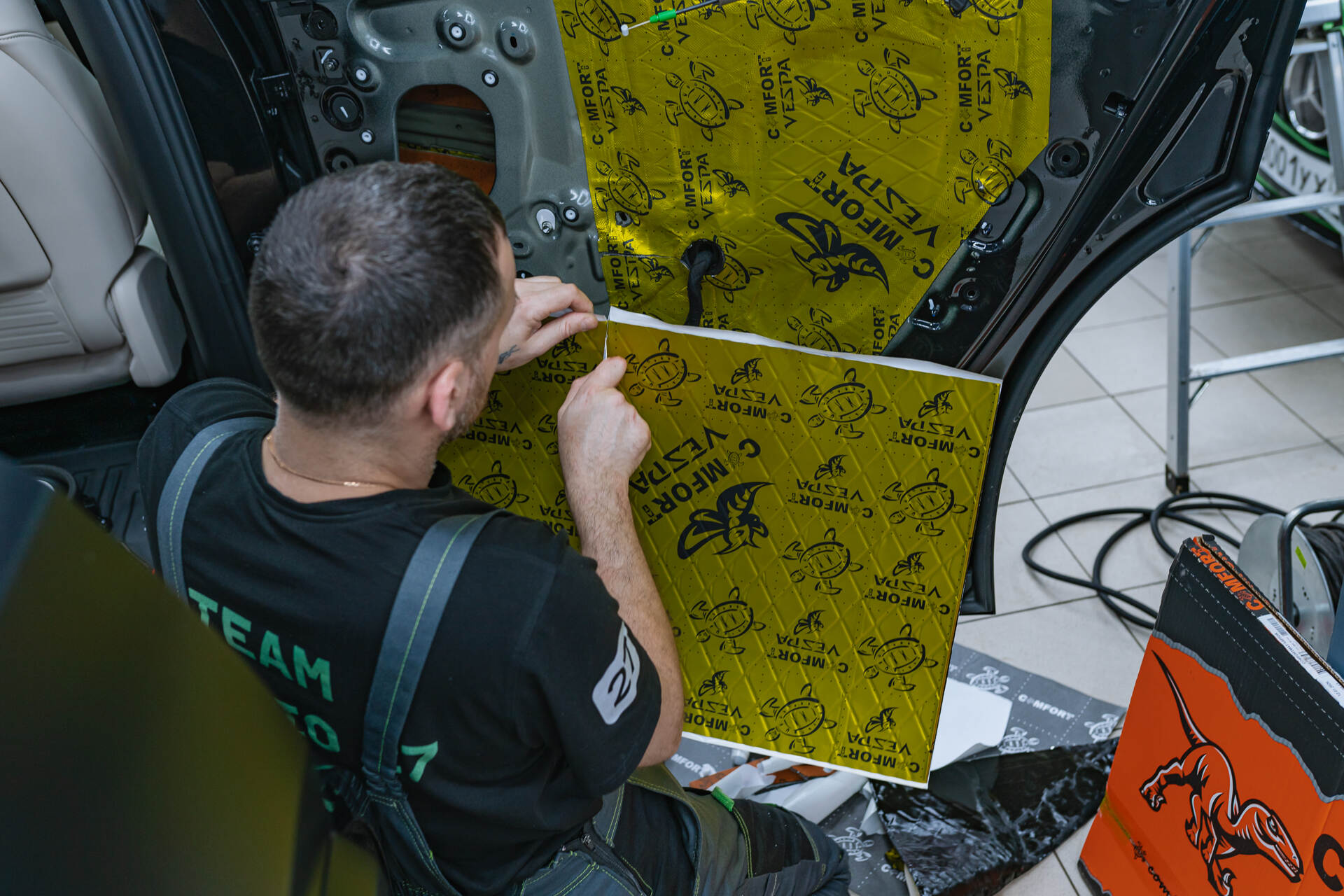 Укладываем листы вибропласта в двери.